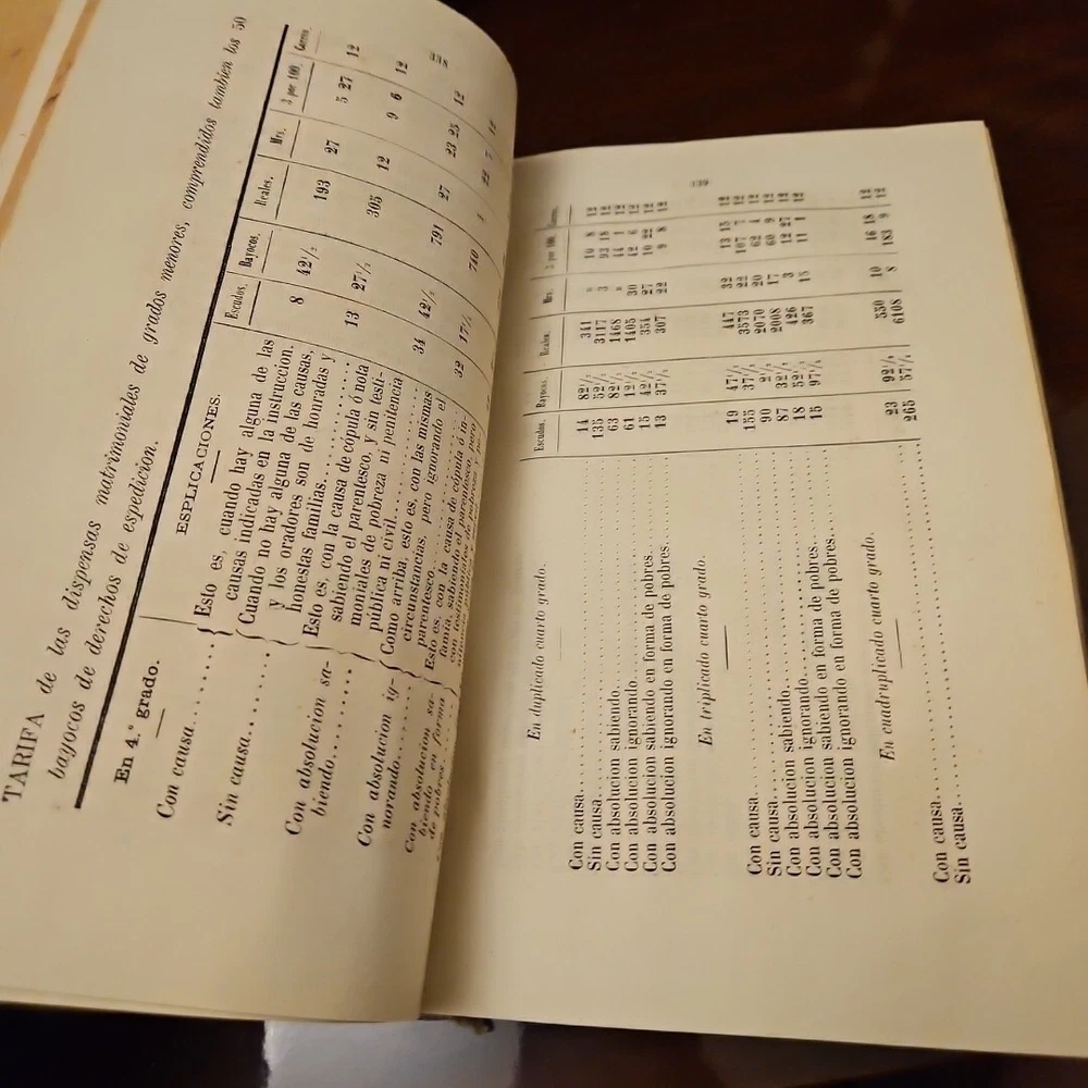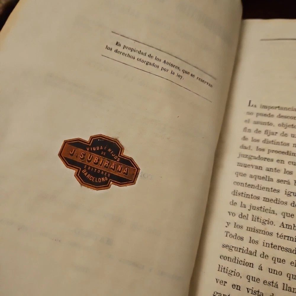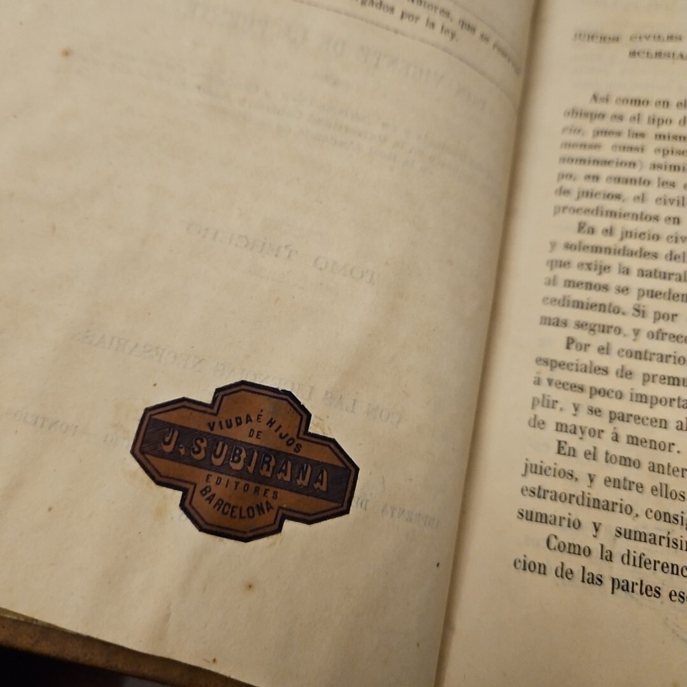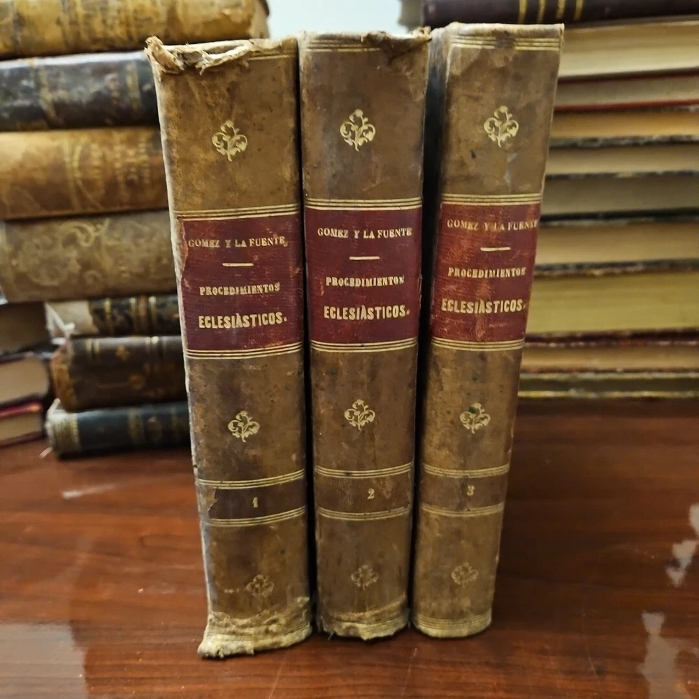 This antique books titled "Tratado téorico-Práctico de Procedimientos Eclesiástico" by D. Francisco Gomez Salazar is a collector's edition with 3 volumes. The leather bound book were printed in 1868 by Imprenta de la Viuda de Aguedo y Hijo in Madrid, Spain. The book is written in Spanish and covers topics such as devotions and meditations. The books is an original and vintage paperback with special attributes such as being numbered and having a unique binding. It belongs to the category of antiquarian and collectible books and is perfect for those interested in religious and spiritual topics. The books is a valuable addition to any collection and is a rare find for collectors. Measurements 9 x 5.75 x 1.5 measurements See pictures TRATADO TEORICO-PRÁCTICO DE PROCEDIMIENTOS ECLESIASTICOS, POR D. FRANCISCO GOMEZ SALAZAR, PRESBITERO, Doctor y Catedrático de sagrada Teologia en la Universidad Central, Licenciado en Derecho Civil y Canónico, Teniente Vicario, Juez eclesiás- tico ordinario de Madrid y su partido, Y DON VICENTE DE LA FUENTE, DOCTOR en sagrada Teologia y en Derecho Civil y Canónico, Catedrático de Derecho Canónico en la Universidad Central, y Académico de número en la Real Academia de la Historia. TOMO TERCERO. CON LAS LICENCIAS NECESARIAS. MADRID. IMPRENTA DE LA VIUDA DE AGUADO É HIJO. -PONTEJOS, 8. 1868. TREATED THEORETICAL-PRACTICAL OF ECCLESIASTICAL PROCEDURES, BY D. FRANCISCO GOMEZ SALAZAR, PRIEST, Doctor and Professor of Sacred Theology at the Central University, Graduate in Civil and Canon Law, Lieutenant Vicar, Ordinary Ecclesiastical Judge of Madrid and its district, AND MR. VICENTE DE LA FUENTE, DOCTOR in Sacred Theology and in Civil and Canon Law, Professor of Canon Law at the Central University, and Full Academician at the Royal Academy of History. VOLUME THREE. WITH THE NECESSARY LICENSES. MADRID. PRINTING PRESS OF THE WIDOW OF AGUADO AND SON. -PONTEJOS, 8. 1868.
