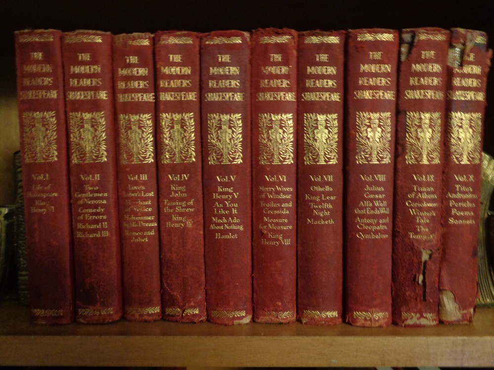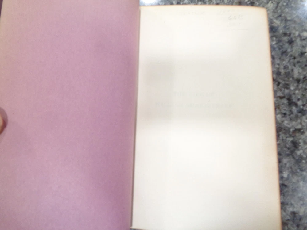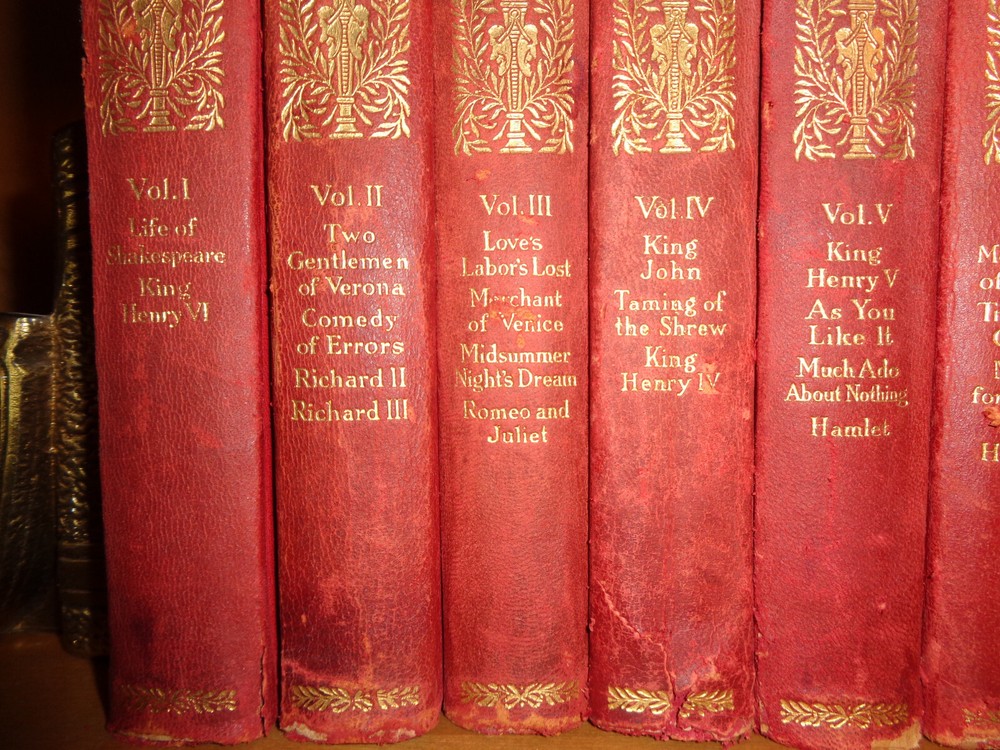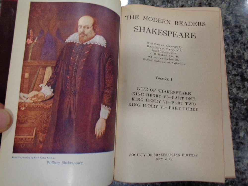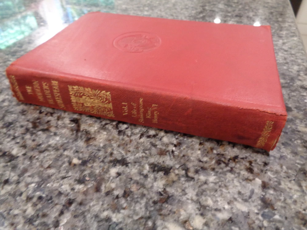Antique 1909 Modern Readers Shakespeare - Complete Set of 10 Volumes Leather The Modern Readers Shakespeare The classic bookset is neat look at the many great Shakespeare works, the set is complete in 10 volumes. Copyright 1909(latest) Publisher: Society of Shakesperian Editors, New York, New York, 1909 The books measure approx. 7 ½ by 5 inches, small signs of wear or use. The covers are good with some slight wear and rubbing, a few of the covers have edgewear and splitting along hinge joint. The spine ends are good, some have some heavier chipping, fraying and light wear on few, some minor darkening or soiling on the spines. Volume 9 has heavier wear and flapped edge. The boards and corners are nice with some minor denting and wear. The hinges and binding are tight and strong, Volume 10 has heavier spine wear and back cover is loose. The handsome volumes internal pages are bright and clean with some very minor foxing from age, bookplate on inside front cover of each, slightly dusty from long storage, a nice set. Inventory: 0724Shelf423
