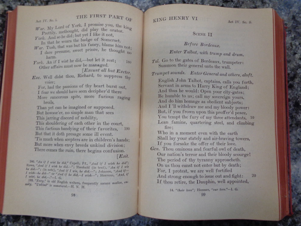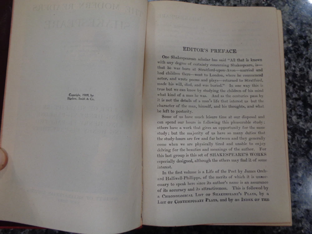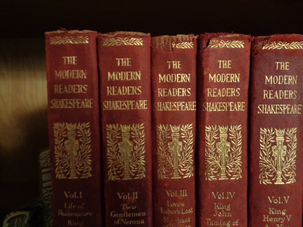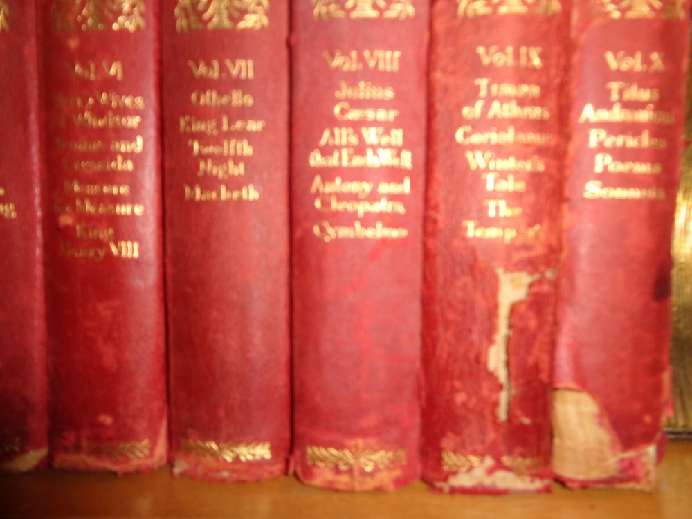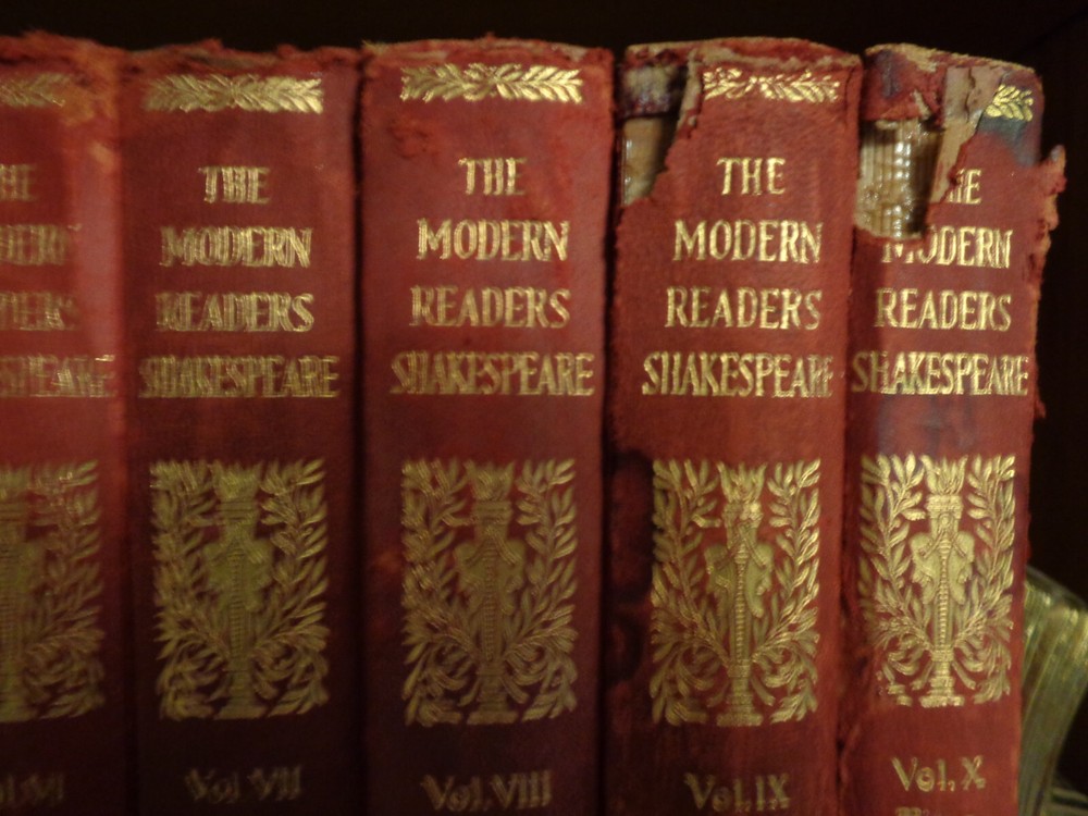 Antique 1909 Modern Readers Shakespeare - Complete Set of 10 Volumes Leather The Modern Readers Shakespeare The classic bookset is neat look at the many great Shakespeare works, the set is complete in 10 volumes. Copyright 1909(latest) Publisher: Society of Shakesperian Editors, New York, New York, 1909 The books measure approx. 7 ½ by 5 inches, small signs of wear or use. The covers are good with some slight wear and rubbing, a few of the covers have edgewear and splitting along hinge joint. The spine ends are good, some have some heavier chipping, fraying and light wear on few, some minor darkening or soiling on the spines. Volume 9 has heavier wear and flapped edge. The boards and corners are nice with some minor denting and wear. The hinges and binding are tight and strong, Volume 10 has heavier spine wear and back cover is loose. The handsome volumes internal pages are bright and clean with some very minor foxing from age, bookplate on inside front cover of each, slightly dusty from long storage, a nice set. Inventory: 0724Shelf423