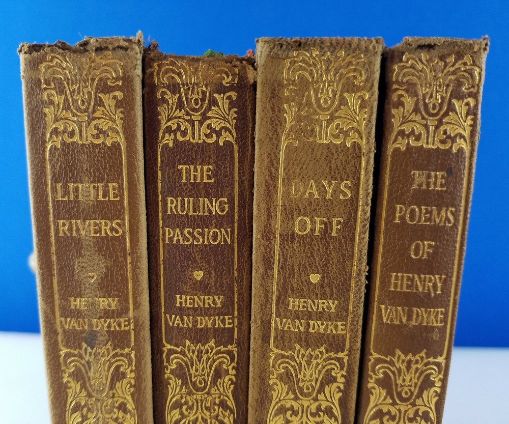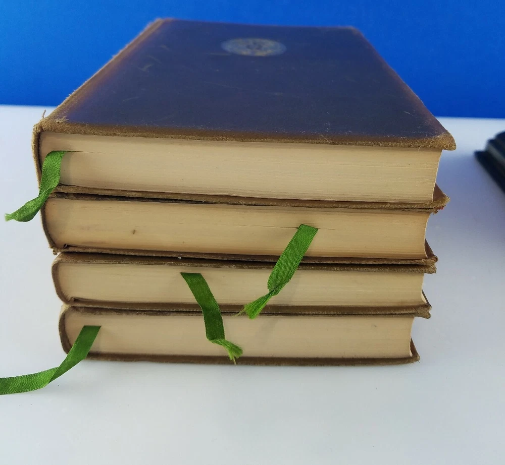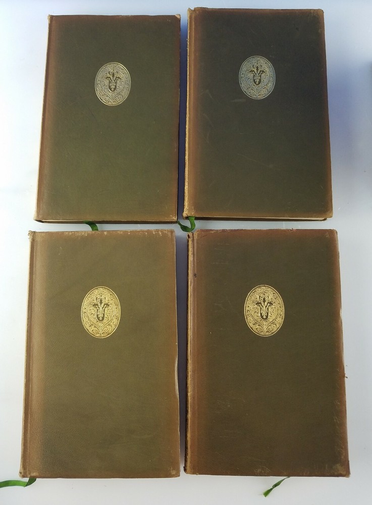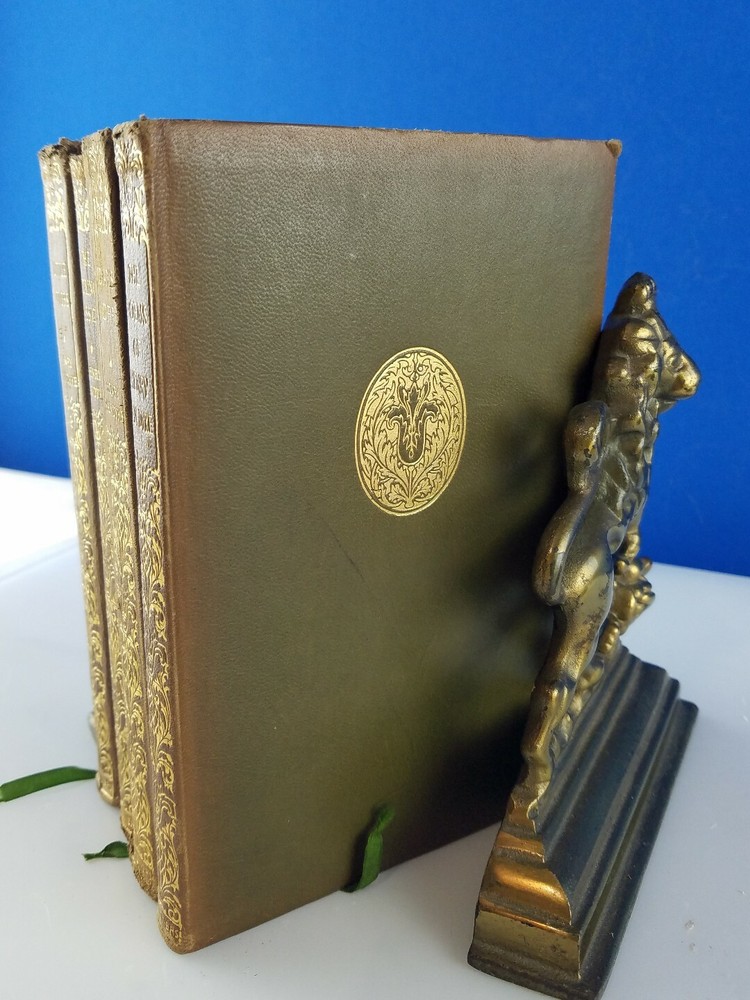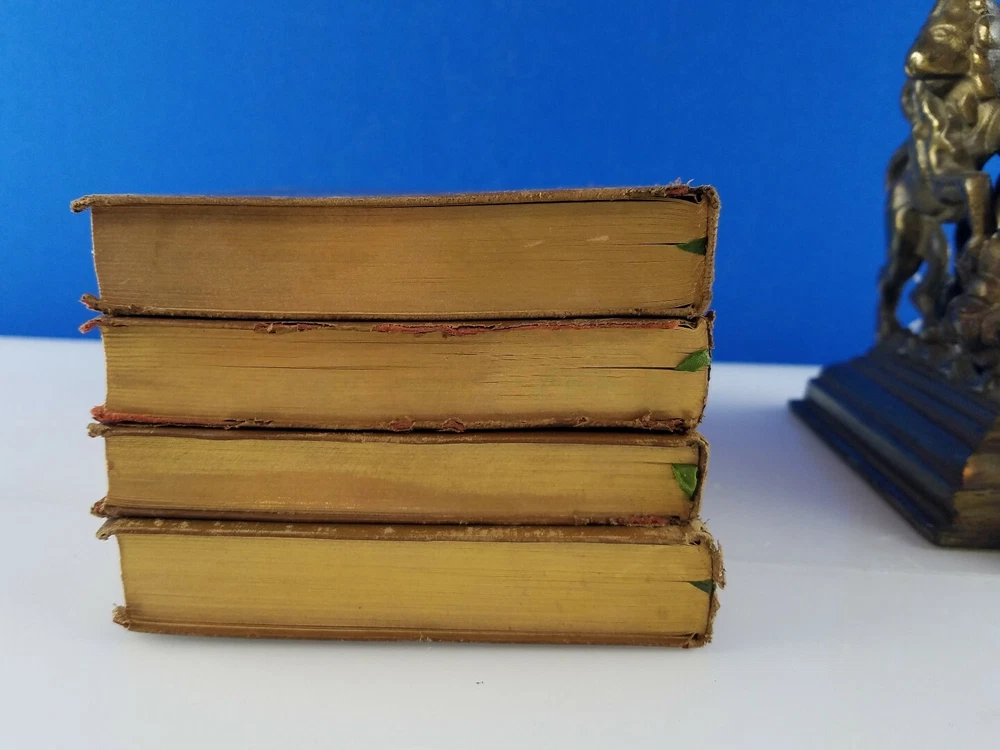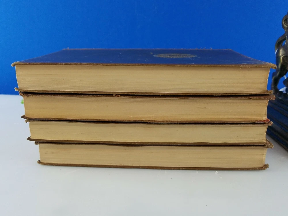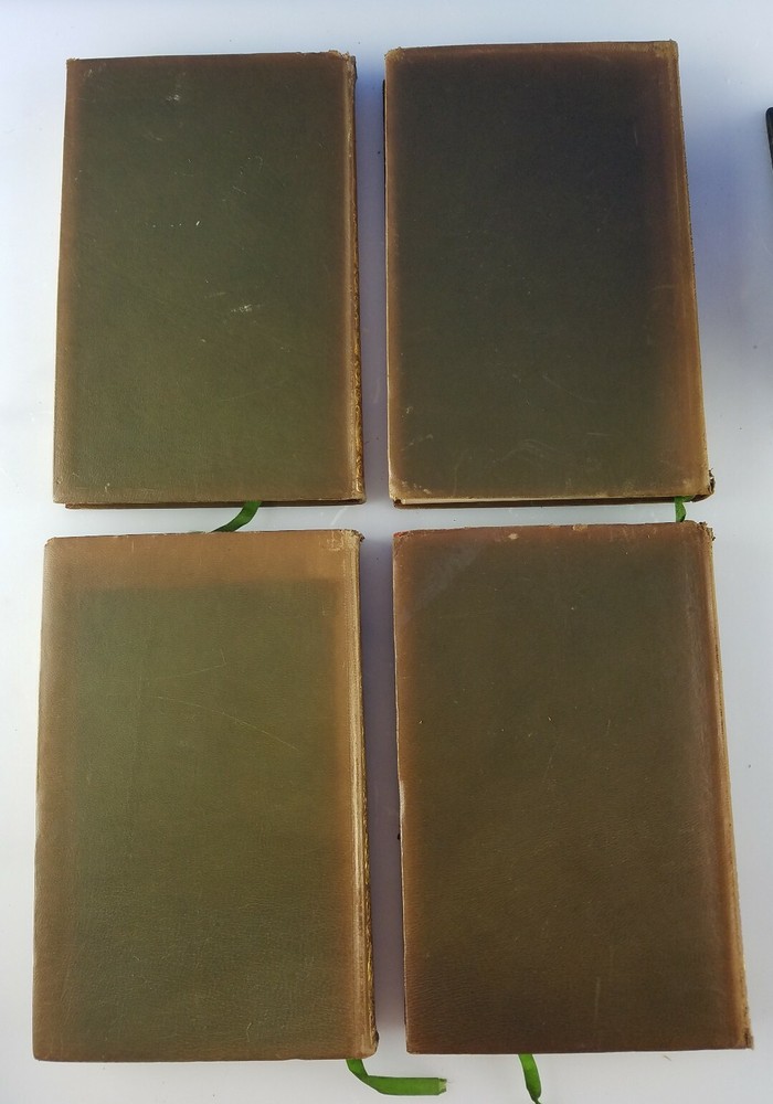 Nice books in good condition for their age. This makes an excellent decorator set. Has beautiful gold leafing on the top and spine. No foxing, tears or other damage noted. The leather has fading and the tops have wear. See photos for complete description including size. Feel free to ask any questions you may have prior to purchase. See store category auction on sale for more. Items are added daily and or weekly.