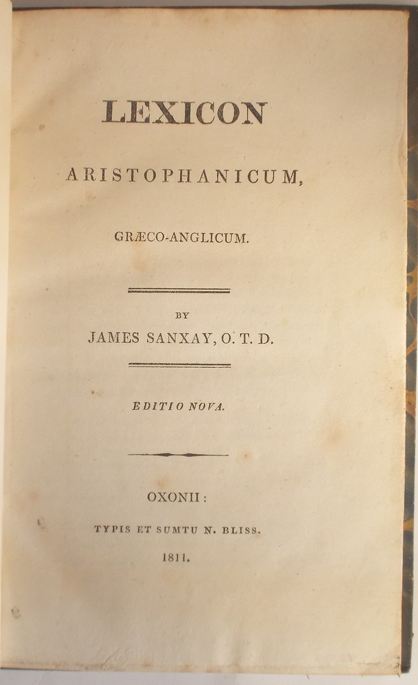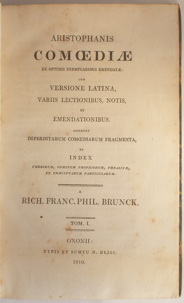 Aristophanis (Aristophanes); translated by Brunck, Richard François Philippe. Aristophanis Comoediae: Ex Optimis Exemplaribus Emendatae: Cum Versione Latina, Variis Lectionibus, Notis Et Emendationibus (5 Volume Set). Oxonii:N. Bliss, 1810. Quarter leather, 9" x 6". VG A handsome five volume set (including the Lexicon) bound in hunter green morocco over marbled boards. Volumes II & III have a bit of remnant from a sticker on the front cover. Occasional scuffing to the covers, previous owner's signature on the first blank leaf of each volume; a very good set. We can quote priority or international postage rates. We're happy to combine purchases to save you shipping fees. All items are guaranteed as described, feel free to contact us with any questions.