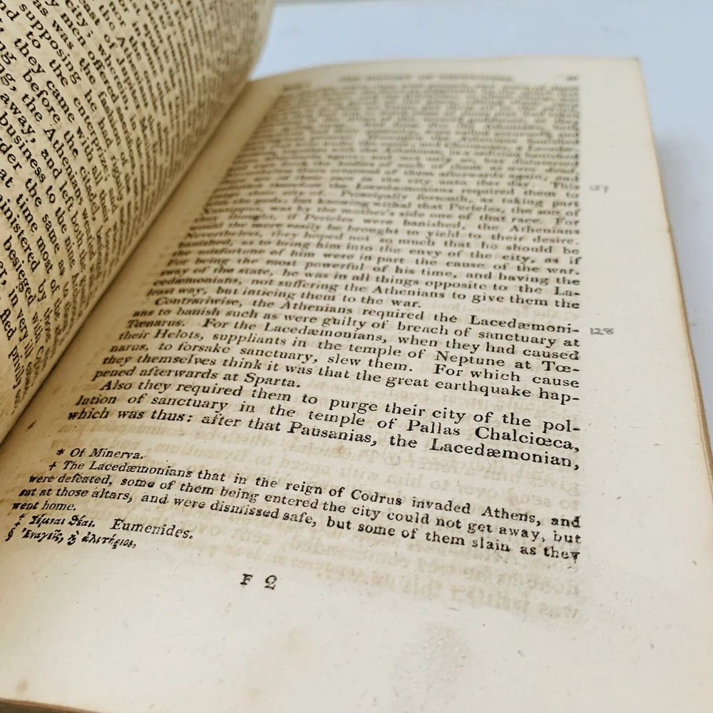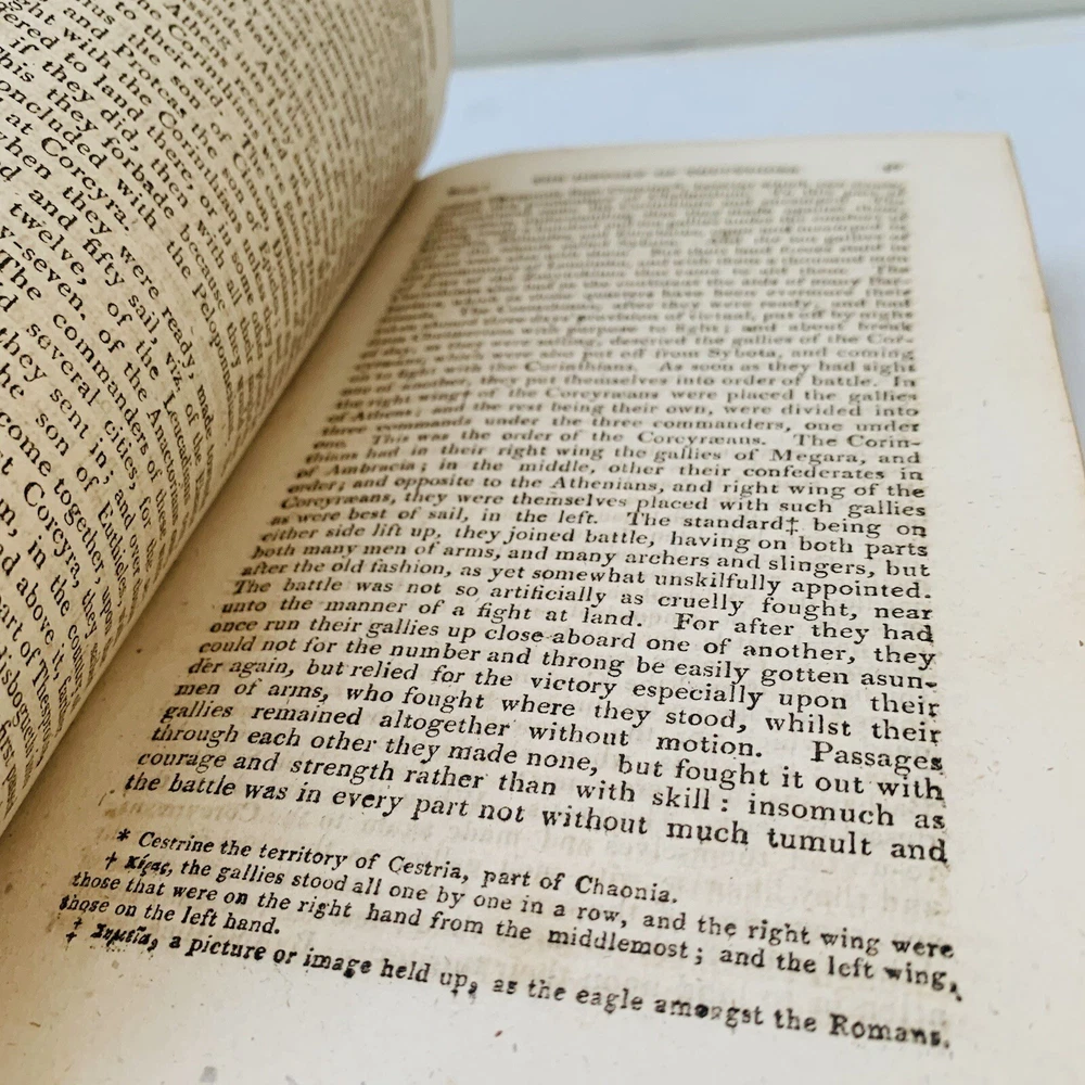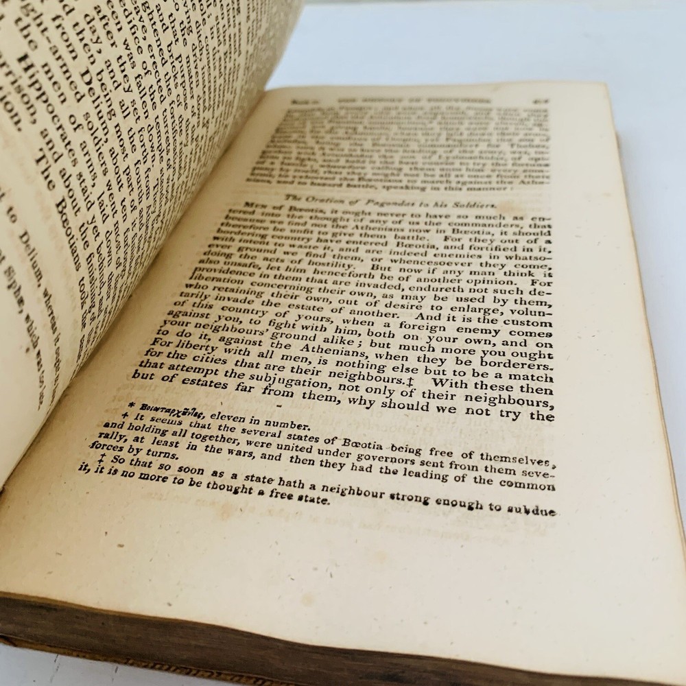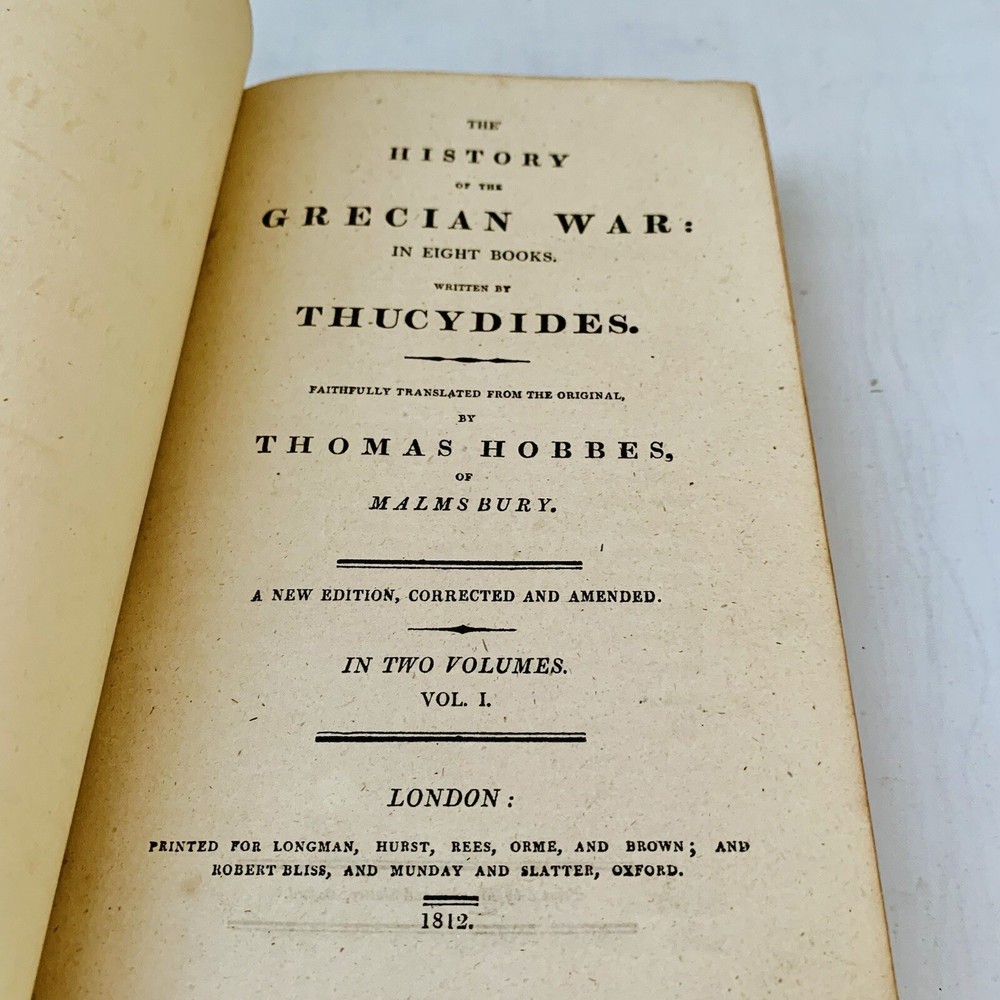 Leather covers have detached and the spine is missing. Nonetheless this is an interesting old, leather bound book which dates back to 1812 . I recently acquired a collection of out-of-print antiquarian books from the 18th, 19th and early 20th centuries. A few were printed in the 17th century. The majority are about religion, theology, philosophy, education, sermons, thought, I will be listing more in throughout the week. This will be a unique opportunity to purchase some very old, extremely rare editions. I cannot wait for them to be welcomed into your antiquarian collections. The History of the Grecian War [Thucydides] in eight books, written by Thucydides translated by Thomas Hobbes London: Longman, Hurst, et al., 1812 new edition, in two volumes, vol. I, 513 pages - very old distressed condition - spine missing - leather covers are detached - clean pages with light foxing and light discoloration in some areas - binding intact - corners are very worn/ bumped/ bent / exposed boards - edge wear / edge peeling - NO OLD BOOK SMELLS Your antique book will be very very carefully packaged in a sturdy box and sent USPS Media Mail with tracking.