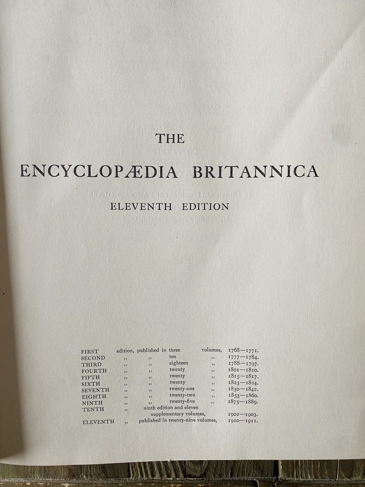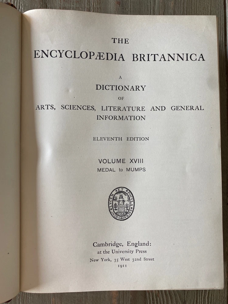 Antique Encyclopedia Brittanica 1910 - 1911 Eleventh Edition 29 Volume Complete Set. This is a local pick up only sale. I will not be able to ship this set, as the shipping costs would be astronomical. Each book weighs approximately 4-5lbs. (5x29 volumes = 145lbs) I'm only able to post 24 photos for this listing, but I have many more photos. If you're interested in seeing more, please message me and I'd be happy to send more photos your way! This is a complete set of the Encyclopedia Britannica. The set was published in 1910-1911. The first half of the set is marked 1910 second half is marked 1911. The set was published by Cambridge England, University Press of New York. The books were printed by R.R. Donnelley & Sons Company, Chicago. This is a 28 volume encyclopedia set, with an additional index book, bringing the total number of books in this set to 29. The books are in excellent condition for their age. After leafing through every single book I could only find one page with a small tear along the top edge of the page. See photos. There are no pen marks or writings on any of its pages. This book set includes color pages as well as black-and-white photographs. See photos for examples. These hardcover books are bound with linen fabric and leather binding. Some of the covers do have what appears to be slight watermarks. See photos. The damage I would say is very minimal. The books do not have a musty smell. There is some wear at the edges of the books, consistent with use. See photos. This is a gorgeous, well cared for set of antique encyclopedias! Thanks for looking! Follow me on eBay & Instagram @KellysVintagePicks