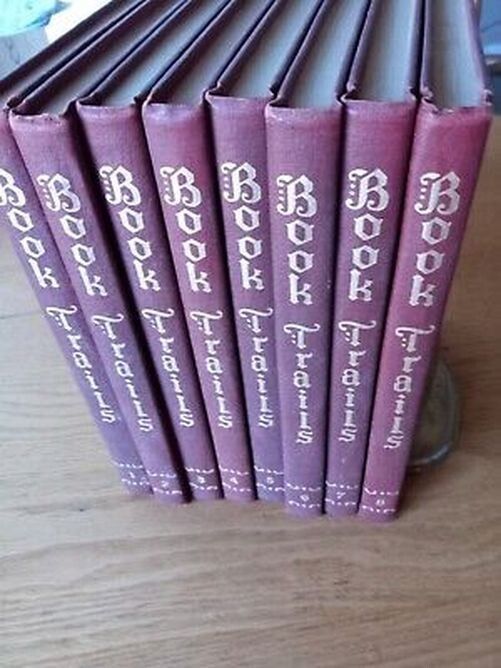 Set of 8 Embossed Leather Bound Hardcover Wonderful lithograph illustrations throughout. Some illustrations are in full color, some are monochromatic and some black and white. Baby Feet, Wildwood, Enchanted Lands and High Roads to Adventure Book Trails 8 Volumne Set Amazing Whimsical Color Art Illustrations Various Authors Various Stories Beautiful Unread Condition Color Plates From pet free, smoke free home Excellent Condition! No Marks! Pages, Spine, Hinges and Covers All Excellent!