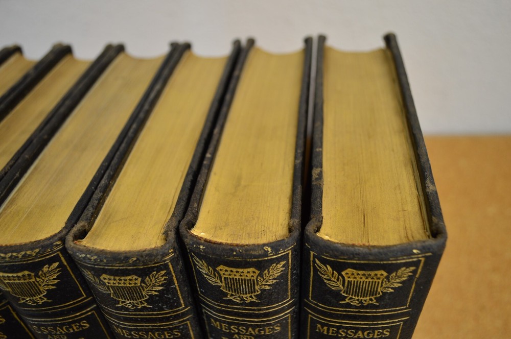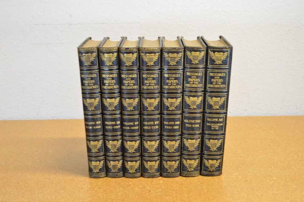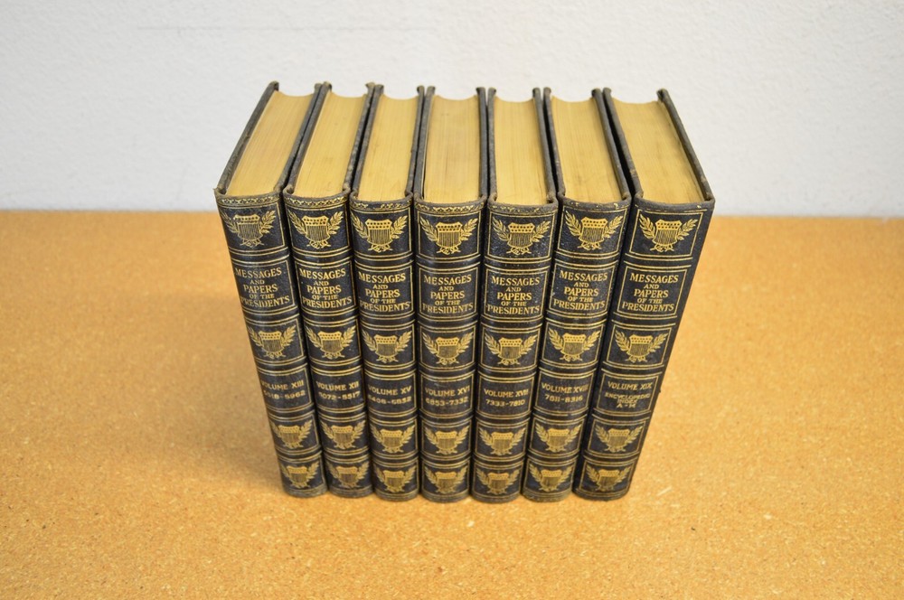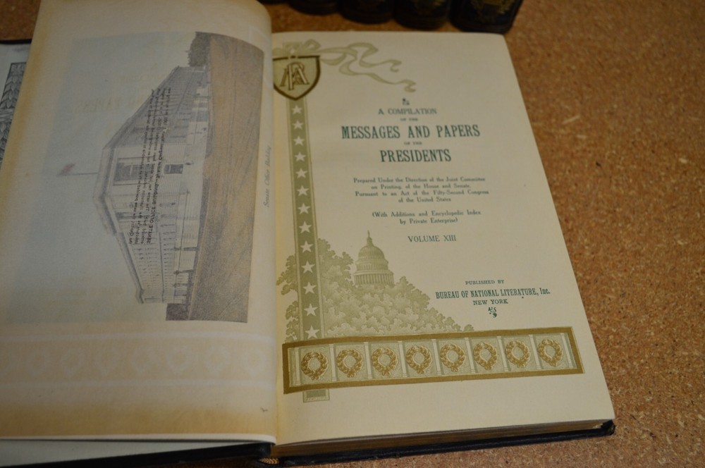 A beautiful set of 7 leatherbound books published in 1897 by the Bureau of National Literature, Inc. New York. Entitled; A Compilation of the Messages and Letter of the Presidents, it is a compendium of papers from various presidents including: Grover Cleveland Benjamin Harrison William McKinley Theodore Roosevelt Woodrow Wilson William Howard Taft A small sampling of subjects covered are the The Wreck of the Maine, Cuban Guerrillas fighting the Spanish Soldiery, The Boer War, The Roosevelt Dam, Russian Battleships sunk by the Japanese, The Panama Canal, The Washington Monument, The World's Fair in Chicago, and so much more. One book is a encyclopedic compendium of all the subjects in the full set of 20 volumes. This is 7 books of that set. All books are printed in English. Books are in excellent antique condition, with well tooled leather binding that are tight and strong - with very light age related marks. Edge gilt is still prominent. See photos for detail. This antique leather book set is a must-have for any collector or lover of vintage decor. The set consists of a foot of beautifull y bound leather books, perfect for displaying on a bookshelf or coffee table. The unique binding style of the books adds an extra touch of elegance to any room. Each book in the set is crafted with the highest quality leather, ensuring durability and longevity. The intricate details and unique design of each book make this set a true treasure for any antique book enthusiast. Whether you're looking to add to your collection or simply looking for a stunning piece of decor, this antique leather book set is sure to impress. At Rarified Books we have cultivated sources for antique books over the many years in business. With publication dates spanning from the early 18 00's to mid 1900's, each book in our antique collection is a stunning testament to a bygone era, showcasing unparalleled craftsmanship and an abundance of character. Books will be in english or foreign languages, and may or may not have previous owners bookplates, marks and stamps. ~~~~~~~~~~~~~~~~~~~~~~~~ We take pride in offering items of extraordinary quality, value and condition. We offer the finest in modern leather-bound books and more. Books are sourced exclusively from smoke free homes, and are carefully inspected. Other items are equally carefully sourced ... check out our other listings and see! Shipping is the responsibility of the buyer unless otherwise noted or agreed. Books are wrapped and protected in bubble wrapping for shipping, with additional cushioning paper filler in an appropriately sized carton. Most books will be shipped via USPS Media Mail or FedEx Home Delivery. International Shipping through eBay's Global Shipping Program only. All descriptions are to the best of our knowledge. Sales are made as-is and no warranty is offered as to authenticity or provenance. Title passes to buyer upon shipment. All sales are final. Arizona sales tax applies. Returns are not accepted except in rare circumstances upon agreement. We also buy books and are always open to purchasing excellent condition books from Easton Press, Franklin Library, Folio Society and similar as well as other rare and collectible books. See our website www.modernleatherbooks.com and let us know what you have. Thank you for considering our listing!