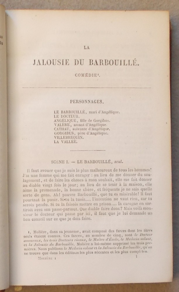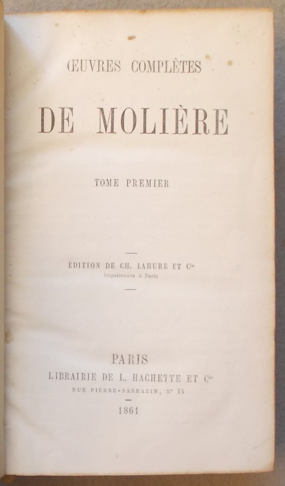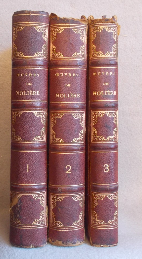 Moliere [Jean-Baptiste Poquelin]. Oeuvres Completes De Moliere (3 Volume Set). Librairie Hachette, 1861. Leather: Good. Attractive three volume set in quarter leather over blind-stamped boards with gilt lettering and ornamentation on the spine. Some chipping on the corners and spine ends; the endpaper of volume II is loose.