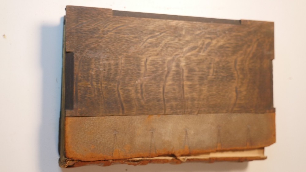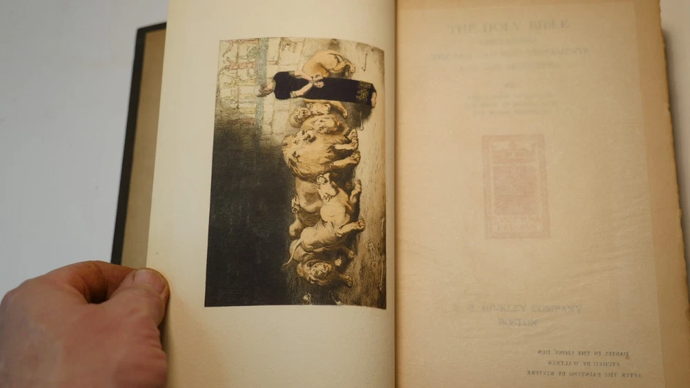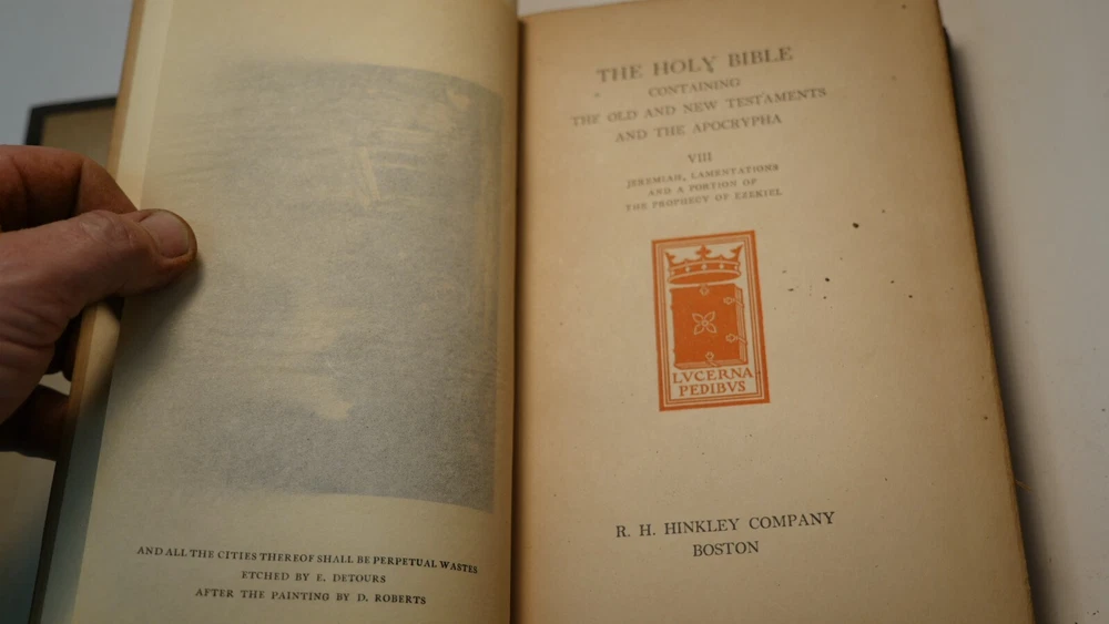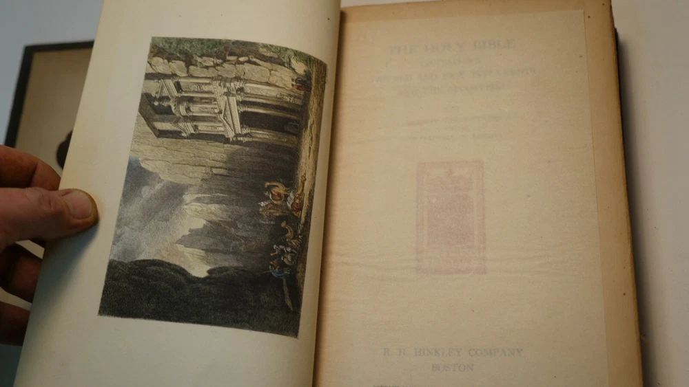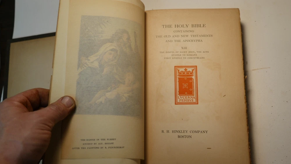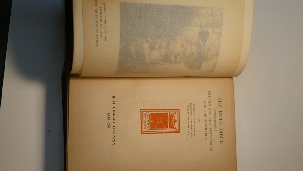 Apparently complete and in good condition, this is quite a valuable bible. Incomplete and in this condition, who knows. Up for sale is half of the R.H. Hinkley, Merrymount press Holy bible in 14 editions. This is the version with wooden covers. Only 500 sets were printer. From what I can find online it was likely printed in 1904. There are 7 total books and appear to be the back end of the 14. The leather is very dry-rotted and there is one wooden panel missing from one of the books. The pages inside look quite good as do the plate illustrations. This set is #37 of 500. I am not able to post enough photos to show every detail of every book but what is shown is a good representation of the condition of all. Please see the photos to judge the condition for yourself. If you have any questions I will do my best to answer. Good luck and Happy Bidding.