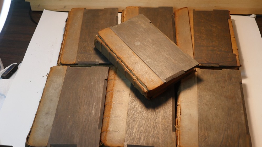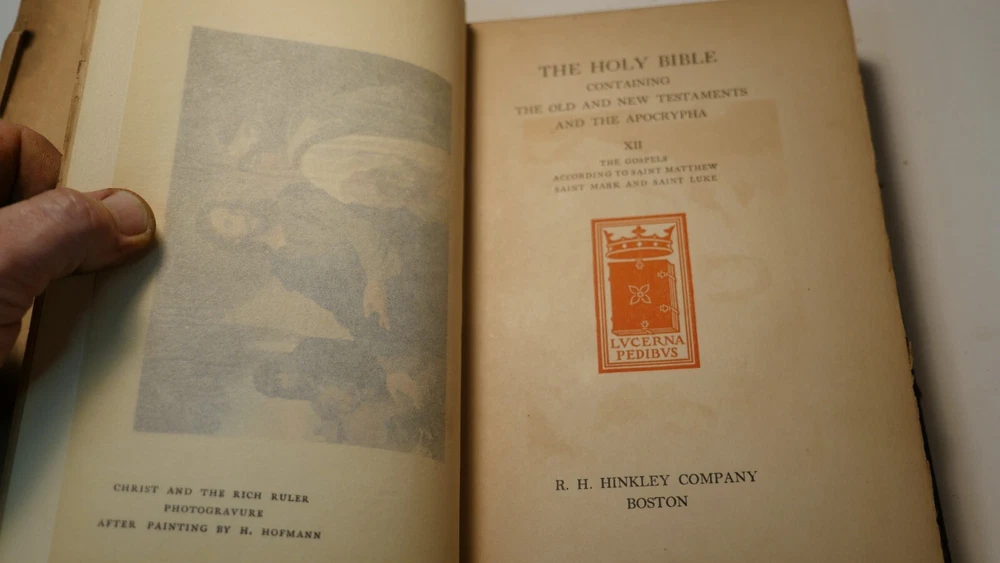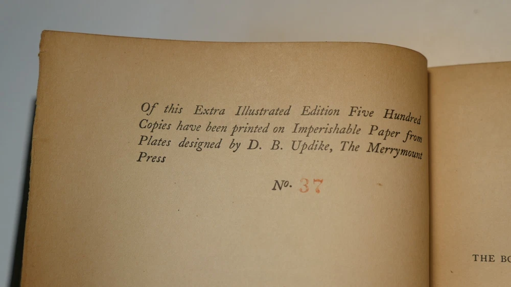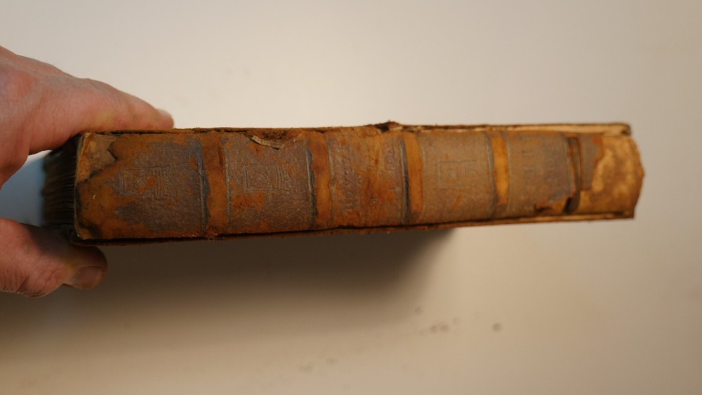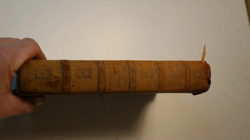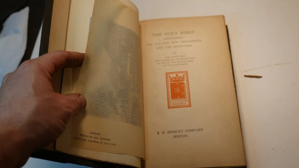 Apparently complete and in good condition, this is quite a valuable bible. Incomplete and in this condition, who knows. Up for sale is half of the R.H. Hinkley, Merrymount press Holy bible in 14 editions. This is the version with wooden covers. Only 500 sets were printer. From what I can find online it was likely printed in 1904. There are 7 total books and appear to be the back end of the 14. The leather is very dry-rotted and there is one wooden panel missing from one of the books. The pages inside look quite good as do the plate illustrations. This set is #37 of 500. I am not able to post enough photos to show every detail of every book but what is shown is a good representation of the condition of all. Please see the photos to judge the condition for yourself. If you have any questions I will do my best to answer. Good luck and Happy Bidding.