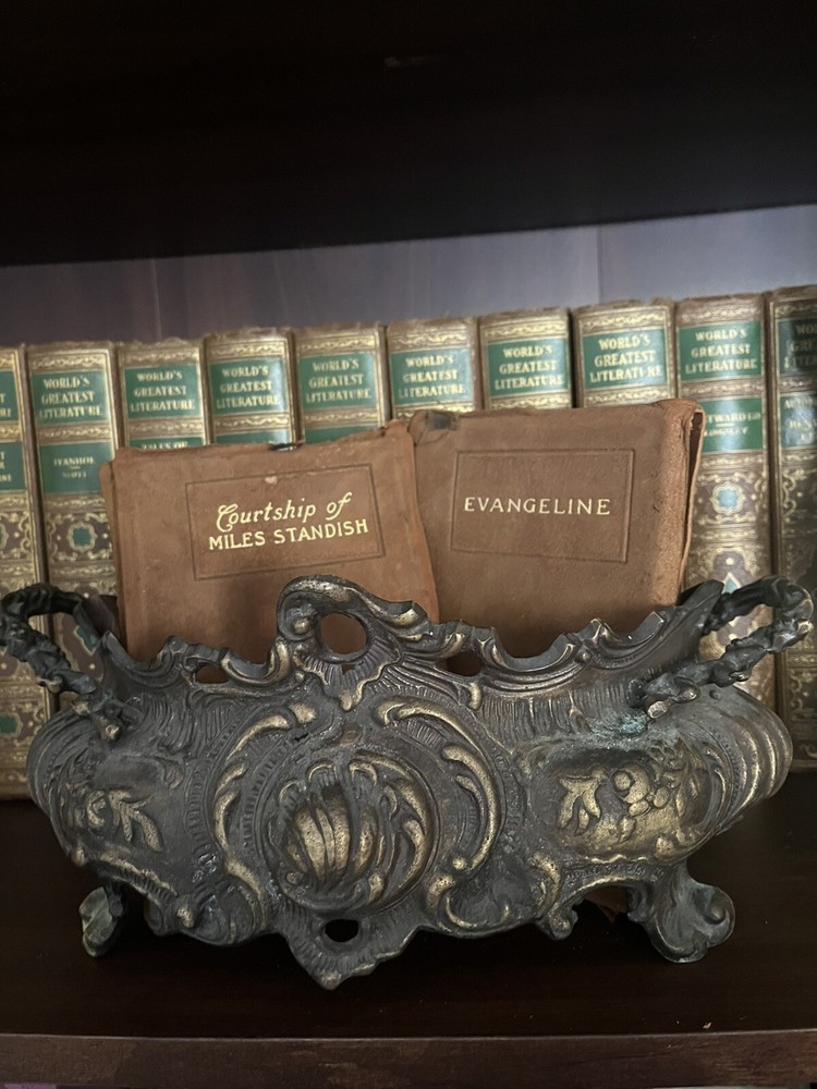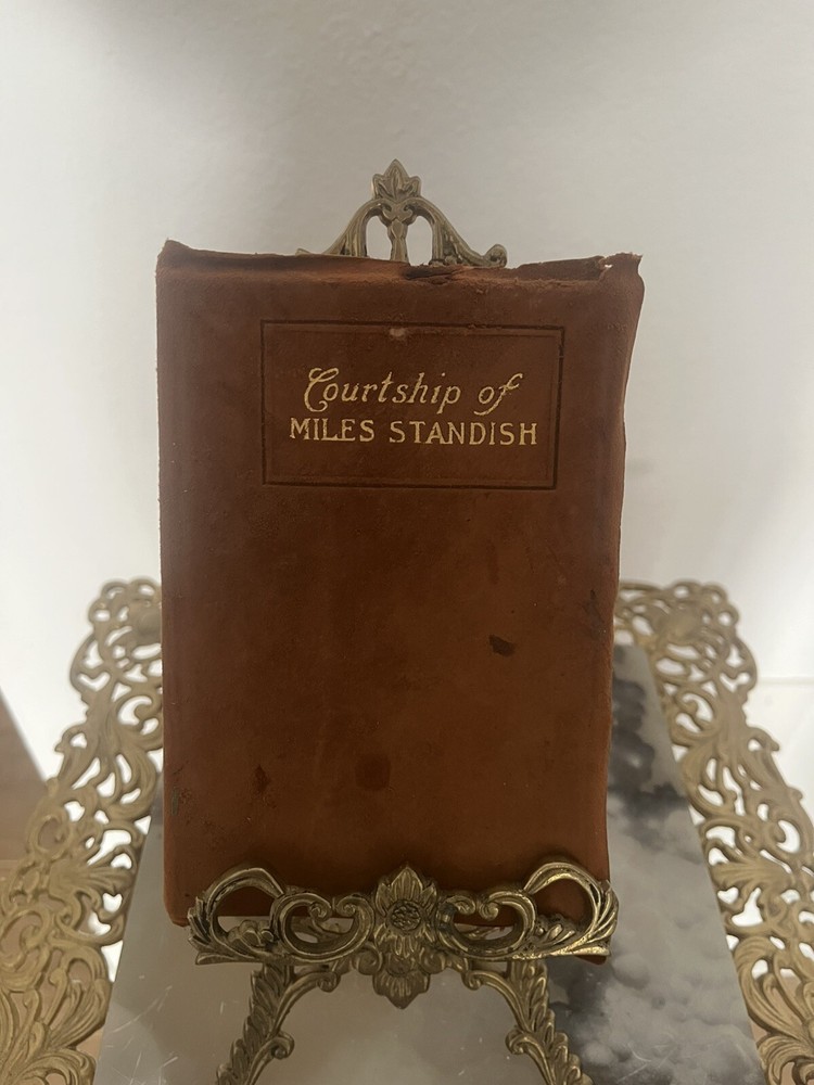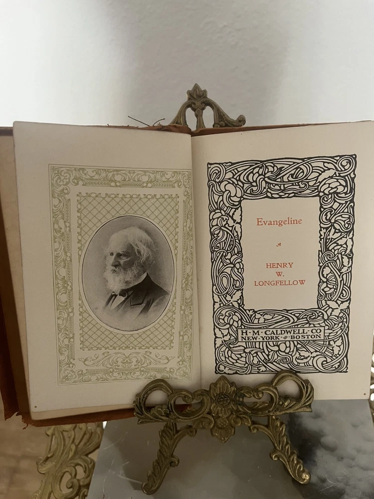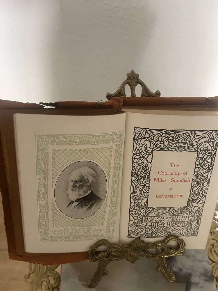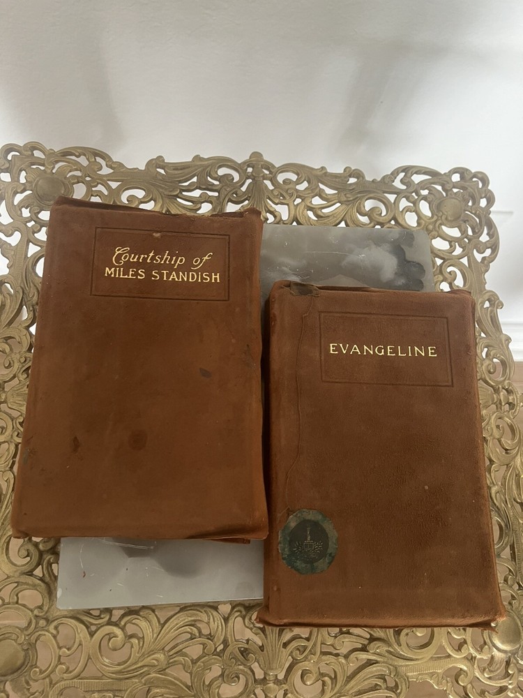 Henry Wadsworth Longfellow was a prominent American poet in the 19th century, known for his narrative poems that often drew on American history and folklore. 'Evangeline,' published in 1847, tells the story of a young Acadian woman searching for her lost love, while 'The Courtship of Miles Standish,' published in 1858, is a romantic narrative based on the courtship of Priscilla Mullins by Miles Standish and John Alden. These works were widely read and appreciated during their time, contributing to Longfellow's reputation as one of America's most beloved poets. The editions in the image, with their limp leather bindings, suggest they may have been produced in the early 1900s, a period when such bindings were popular for their durability and aesthetic appeal. Vintage books like these are often sought after by collectors for their historical significance and the charm of their physical presentation.