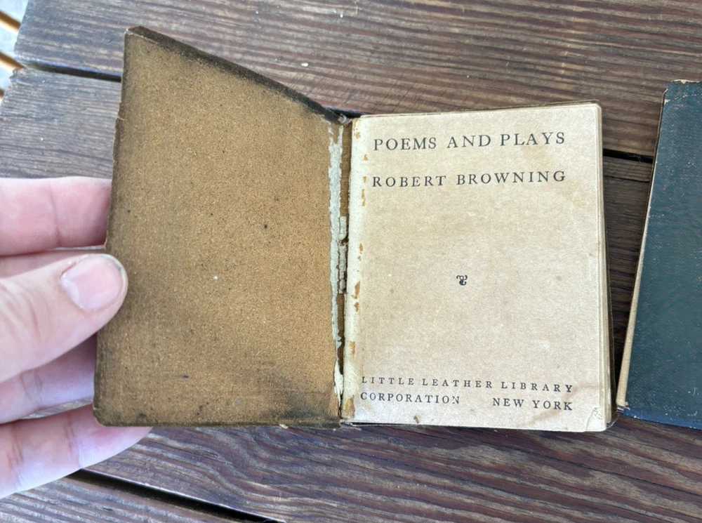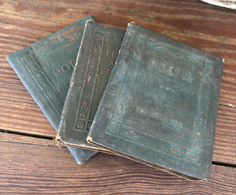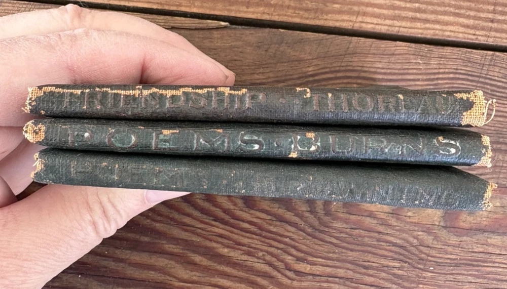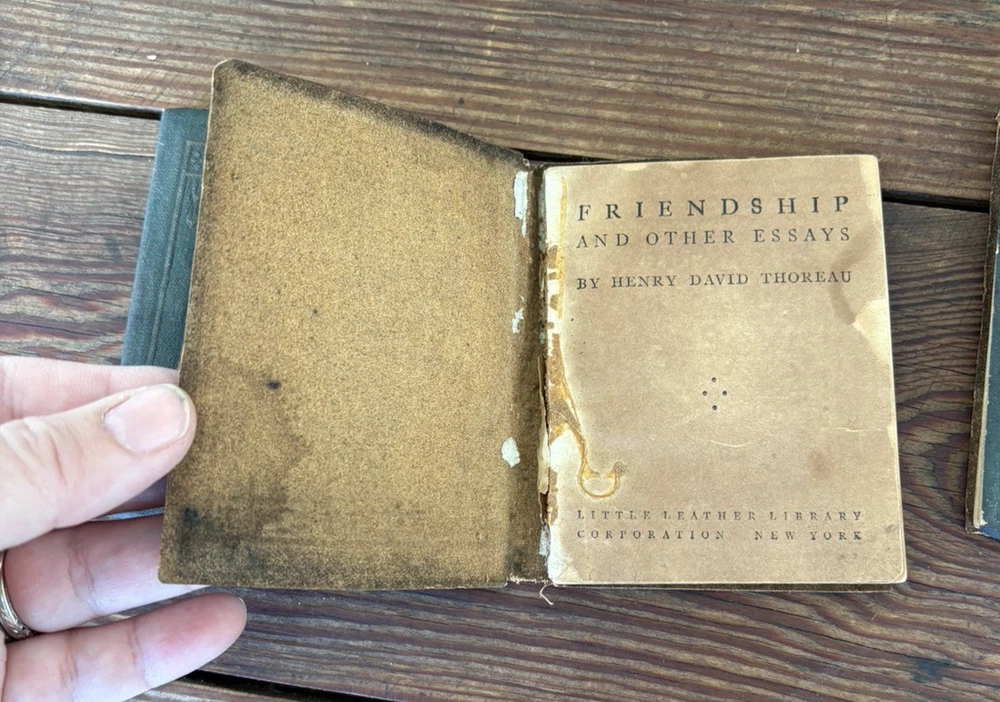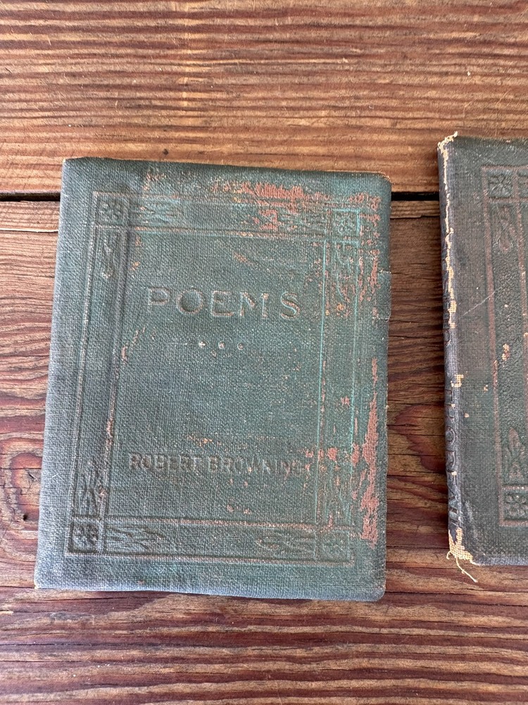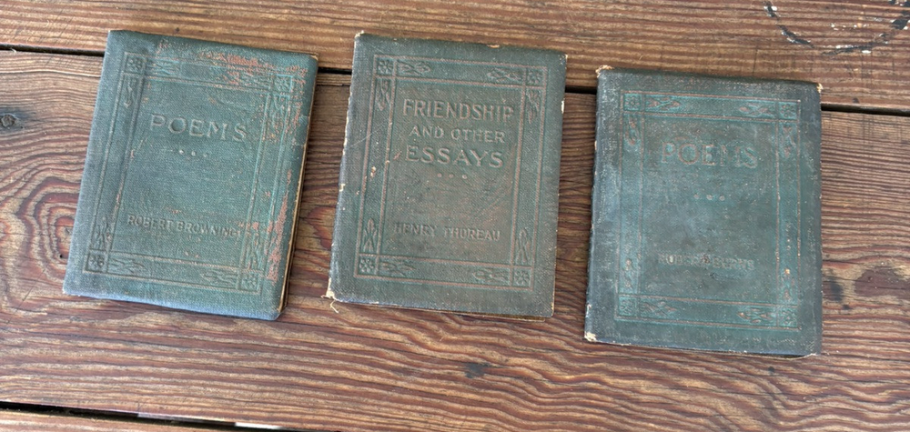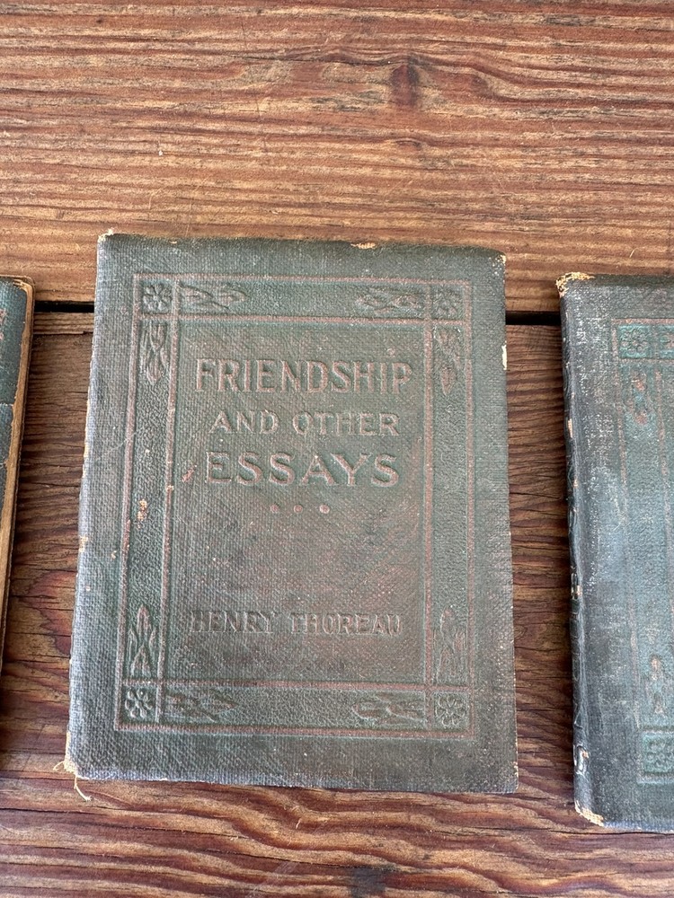 Antique Set of 3 Green Little Leather Library Books ~ Friendship & Other Essays by Henry Thoreau, Poems by Robert Burns & Poems by Robert Browning 4" x 3" Please examine pictures carefully as they are part of item description as well!