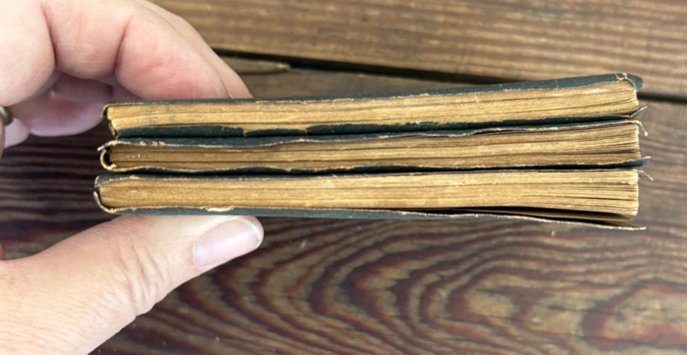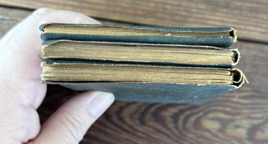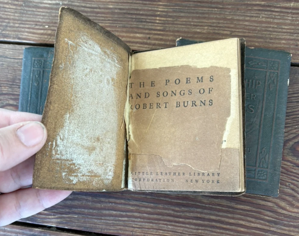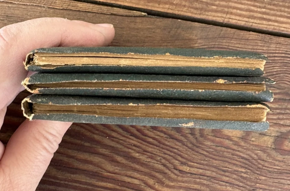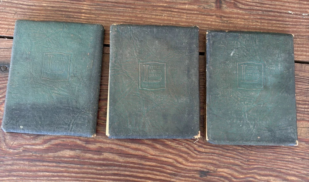 Antique Set of 3 Green Little Leather Library Books ~ Friendship & Other Essays by Henry Thoreau, Poems by Robert Burns & Poems by Robert Browning 4" x 3" Please examine pictures carefully as they are...