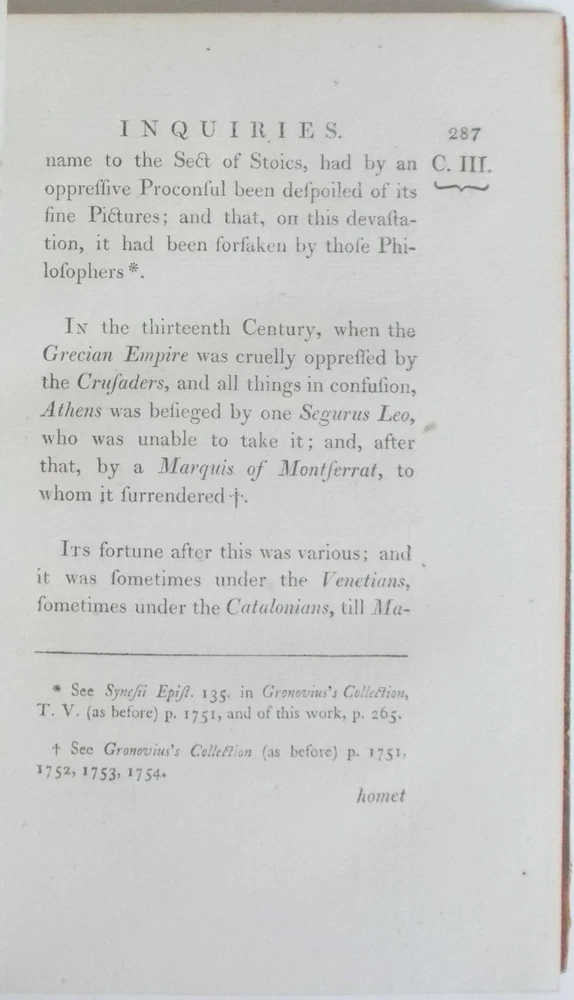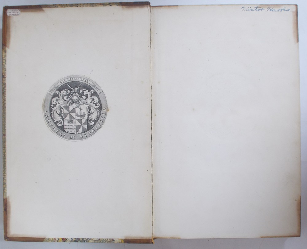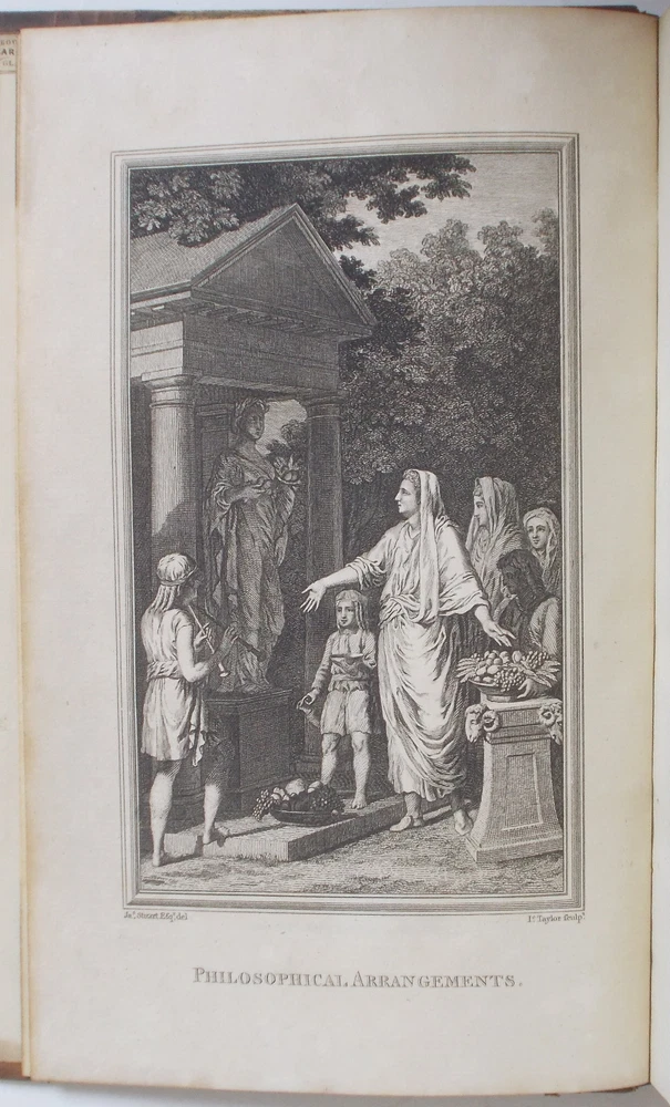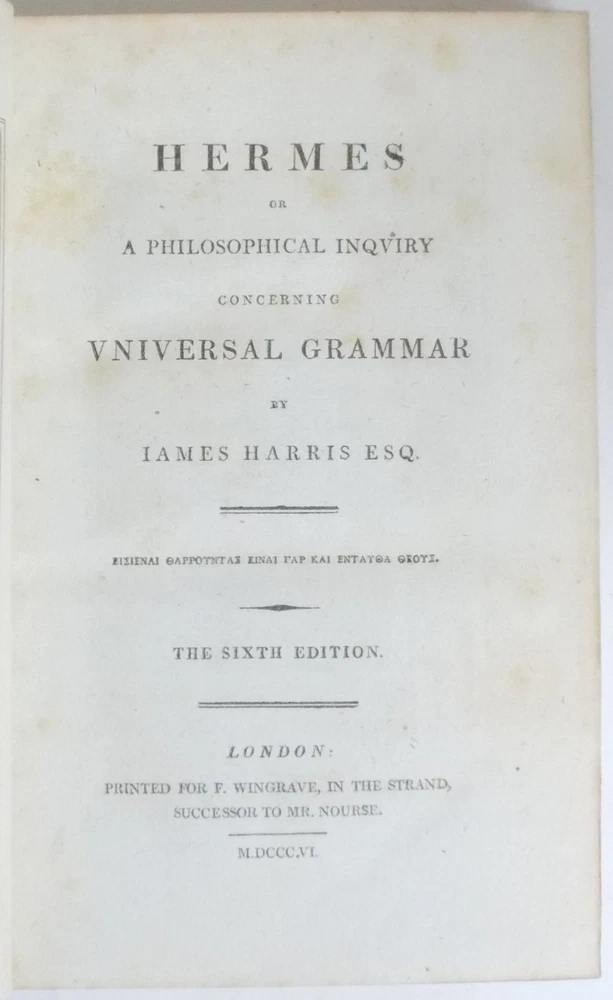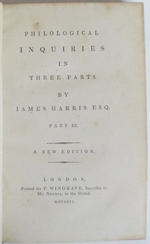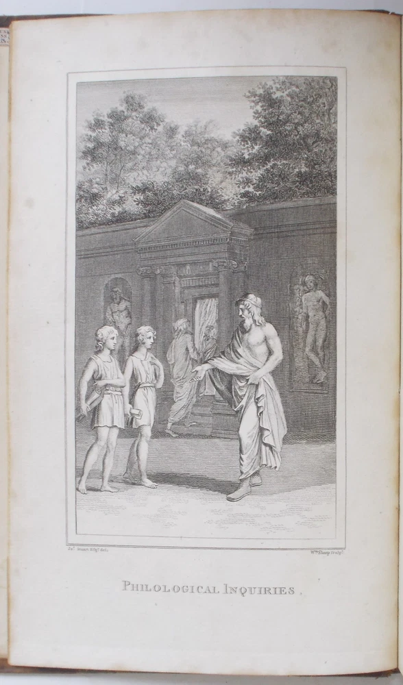 Harris, James. The Works of James Harris, Esq. with an Account of His Life and Character (5 Volume Set). Three Treatises: The First Concerning Art, The Second Concerning Music, Painting and Poetry & The Third Concerning Happiness. with Some Account of the Author's Life. Fifth Edition. Hermes, Or A Philosophical Inquiry Concerning Universal Grammar. Sixth Edition. Philosophical Arrangements. A New Edition. Philological Inquiries in Three Parts (2 Volumes). A New Edition. London: Printed By Luke Hansard for F. Wingrave, Successor To Mr. Nourse in the Strand, 1803. Leather. A good set bound in contemporary calf over marbled boards with four engraved frontispieces; lacking the spine labels; 8.25" x 5.5". Some scuffing to the leather and mild foxing; Each volume has a bookplate and signature inside the front cover.