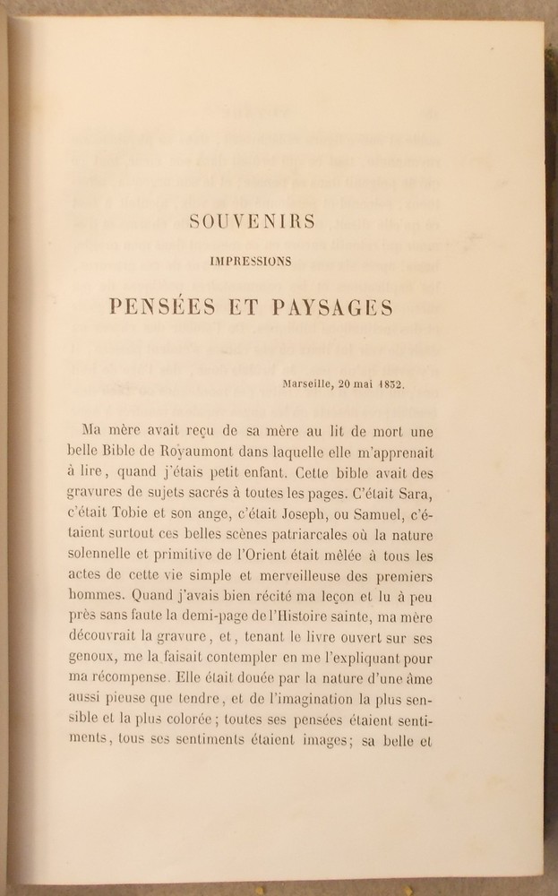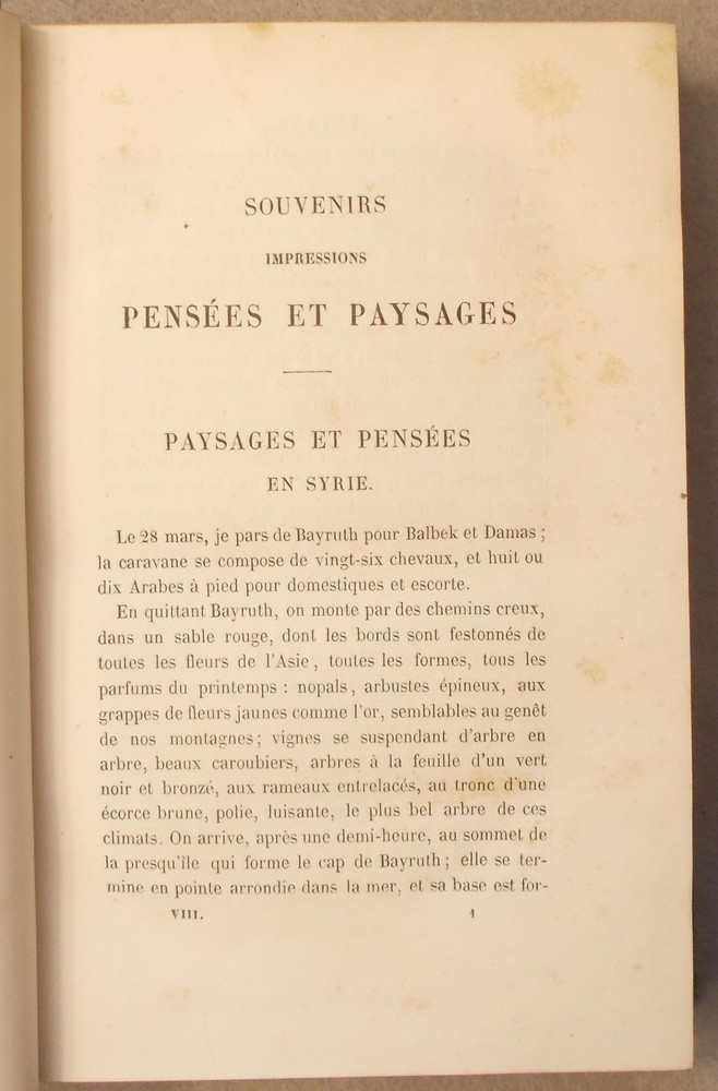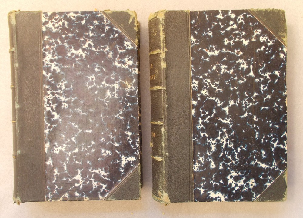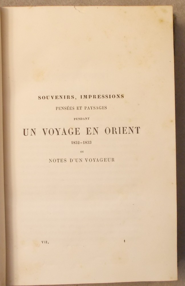 Lamartine, Alphonse De. S ouvenirs, Impressions Pensees Et Paysages Pendant Un Voyage En Orient 1832-1833 Ou Notes D'Un Voyageur (2 Volume Set). Charles Gosselin & Roe Lockwood, 1845. Leather: Good. Half leather over marbled boards with gilt lettering on the spines; some scuffing on the leather and occasional mild foxing.