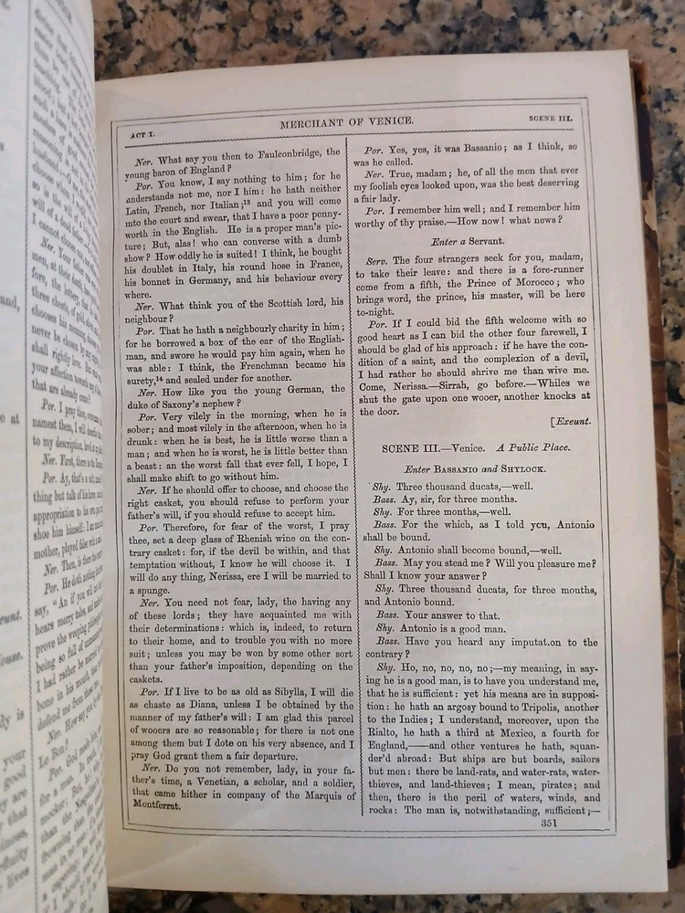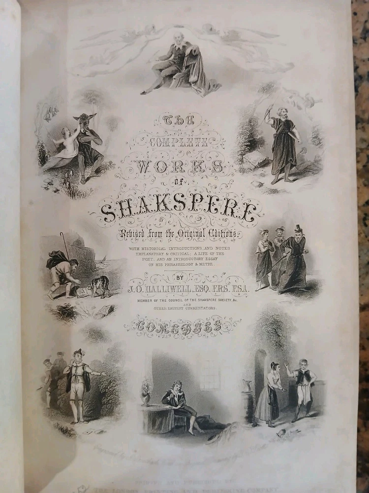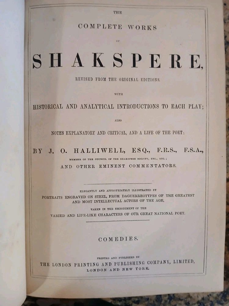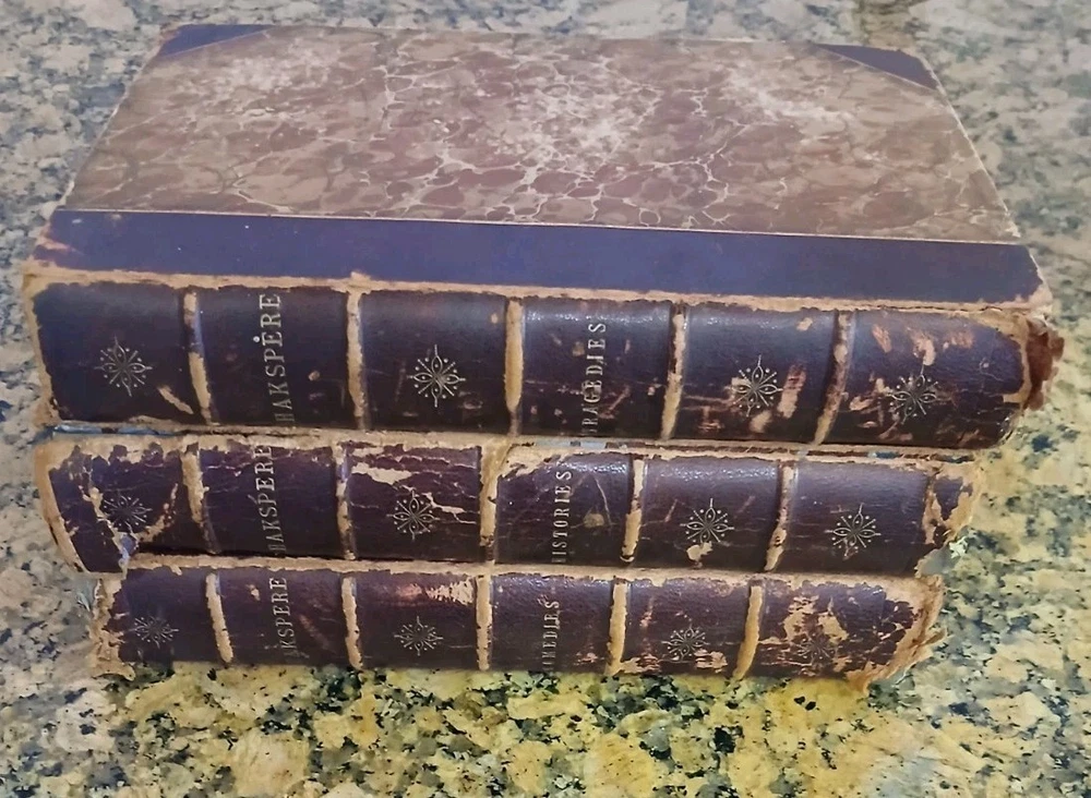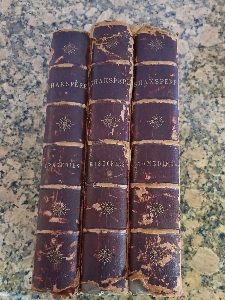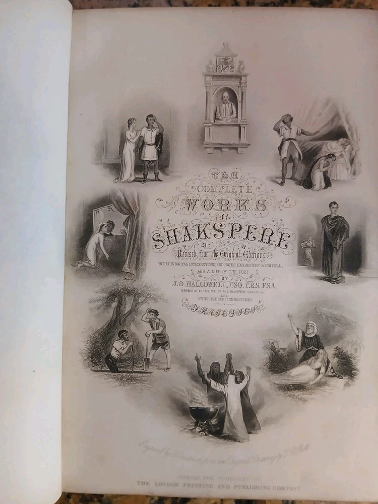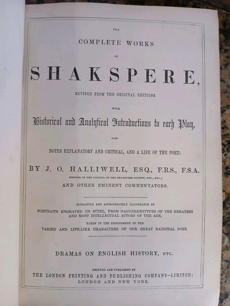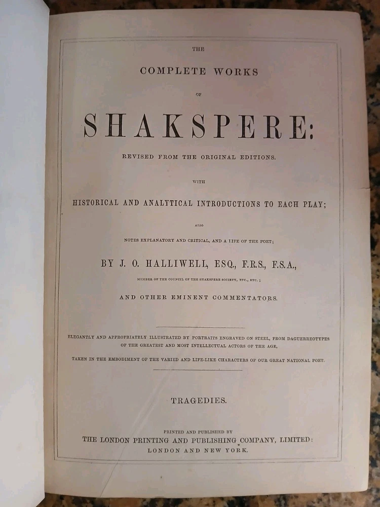 Illustrator: Daguerreotypes by Paine of Islington Source Text: The complete works of Shakspere : revised from the original editions / with historical and analytical introductions to each play, also notes explanatory and critical, and a life of the poet by J.O. Halliwell … and other eminent commentators ; elegantly and appropriately illustrated by portraits engraved on steel, from daguerreotypes of the greatest and most intellectual actors of the age ; taken in the embodiment of the varied and life-like characters of our great national poet / Tragedies. Immerse yourself in the literary genius of William Shakespeare with the Complete Works of Shakespeare Halliwell Shakspere 3 Volume Leather Set from 1850. This original edition, published by the London Printing & Publishing Company, boasts the timeless works of the acclaimed author, carefully compiled to provide a comprehensive look into the world of Elizabethan drama and poetry. Each volume is bound in leather, some wear due to age, and includes illustrations by Paine of Islington, enhancing the reading experience. Written in English and produced in the United Kingdom, this collection is a testament to the enduring legacy of Shakespeare's literature and fiction. Whether for scholarly study or personal enjoyment, this set is a treasure for any bibliophile.
