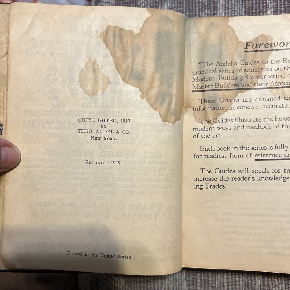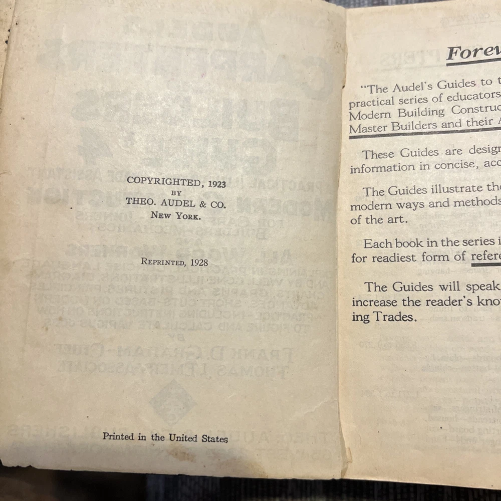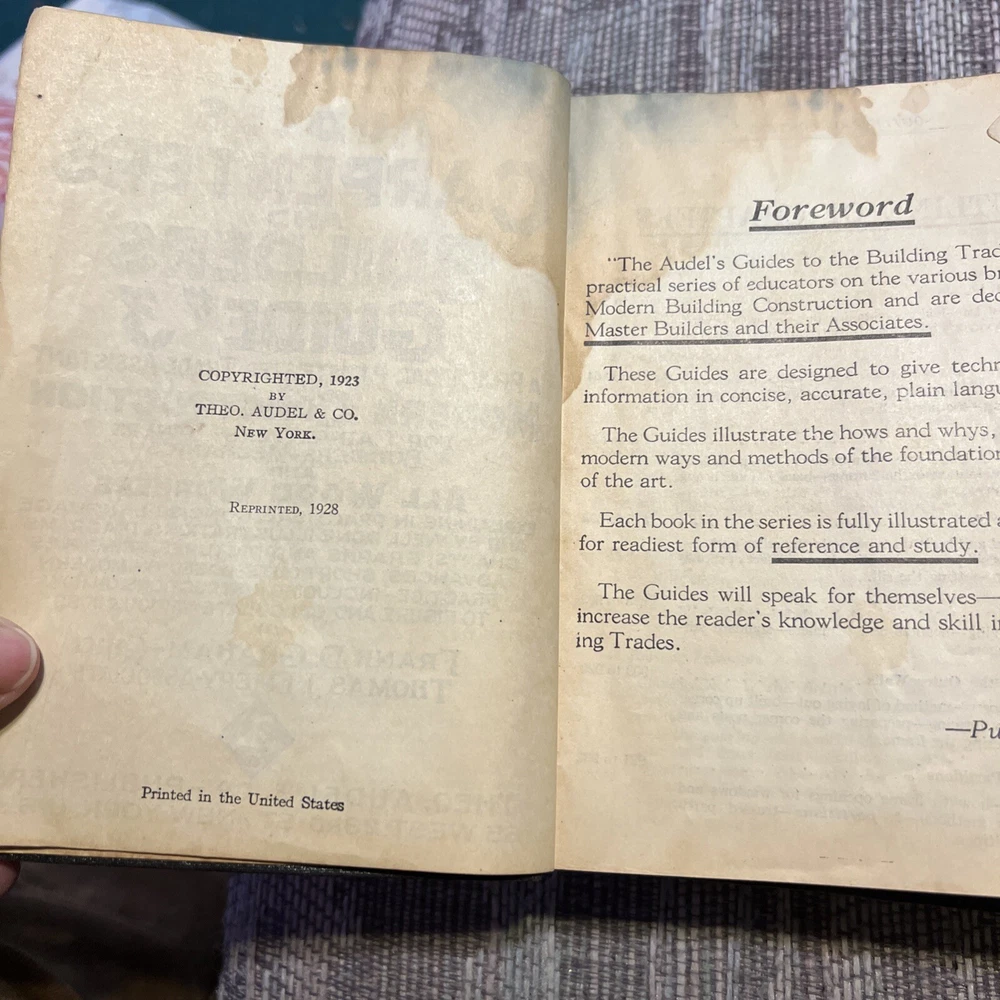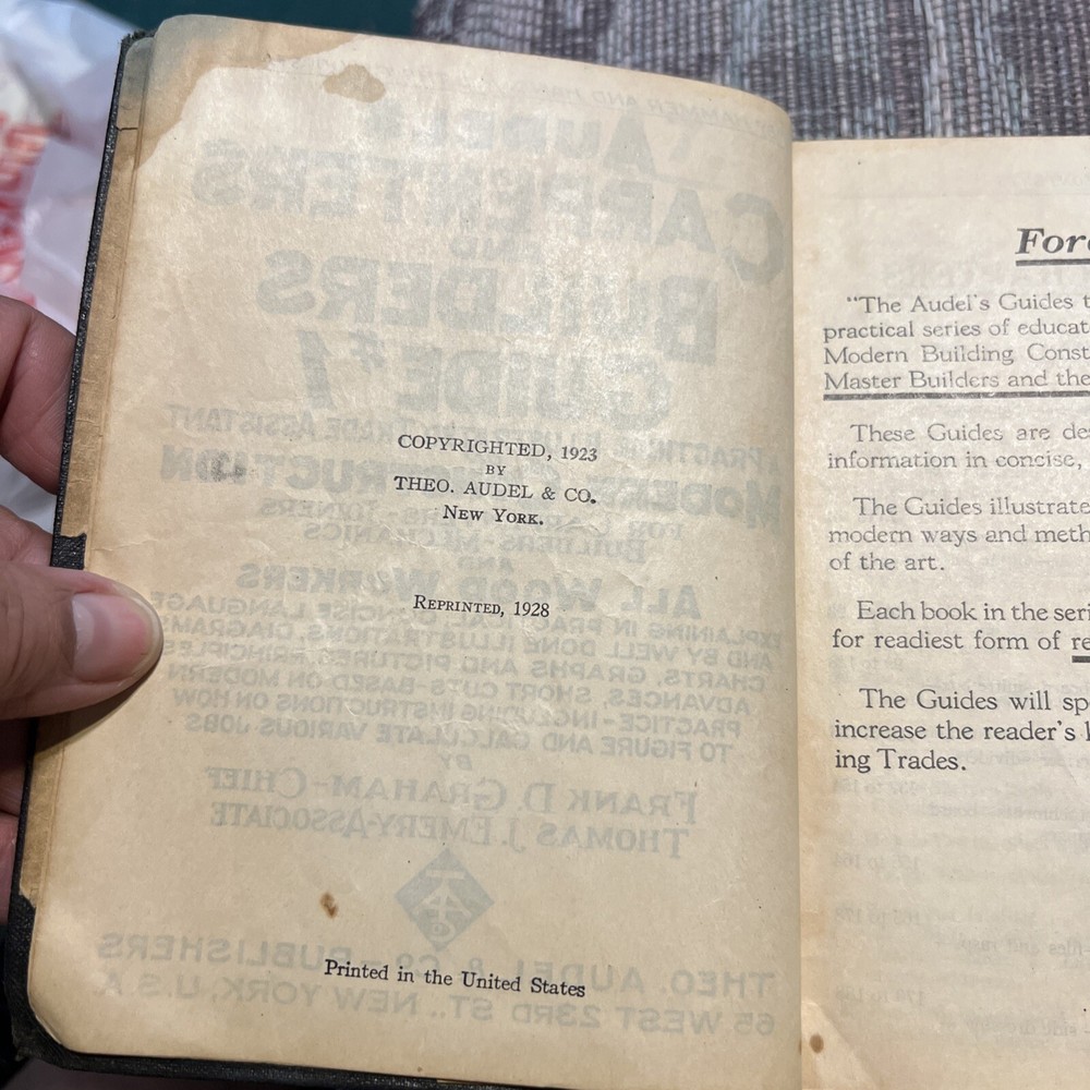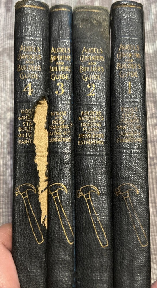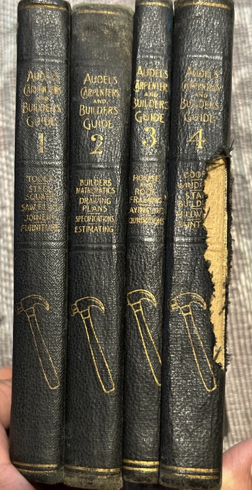 A set of Audels 1923 Carpenters and Builders Guide Books Volumes 1 - 4 in leather binding. The books are in English, illustrated, and authored by Frank Graham. Published by Audel, the set focuses on building topics and is an original printing from 1923 in North America. This set is a valuable addition for collectors interested in vintage building guides.