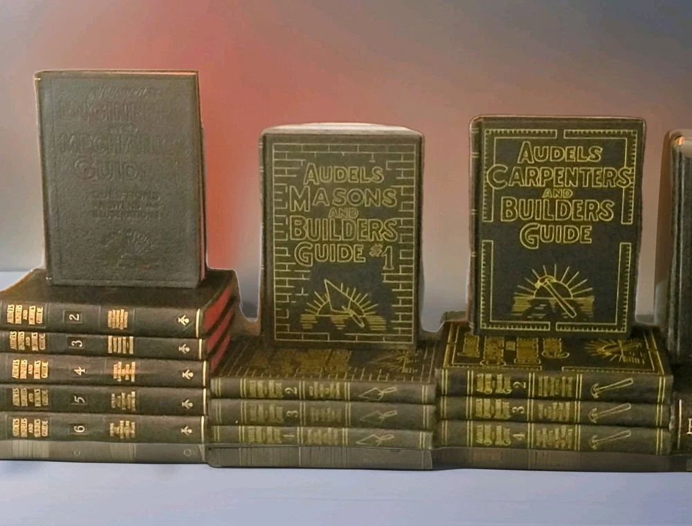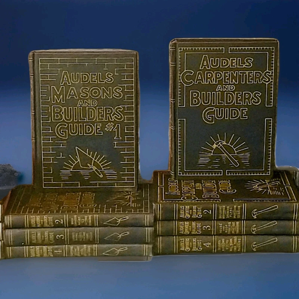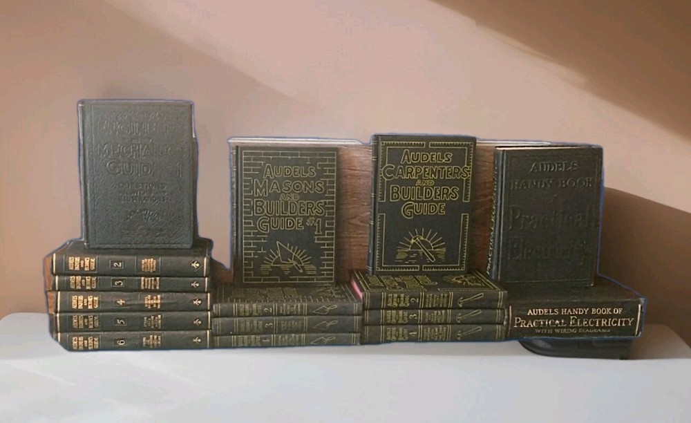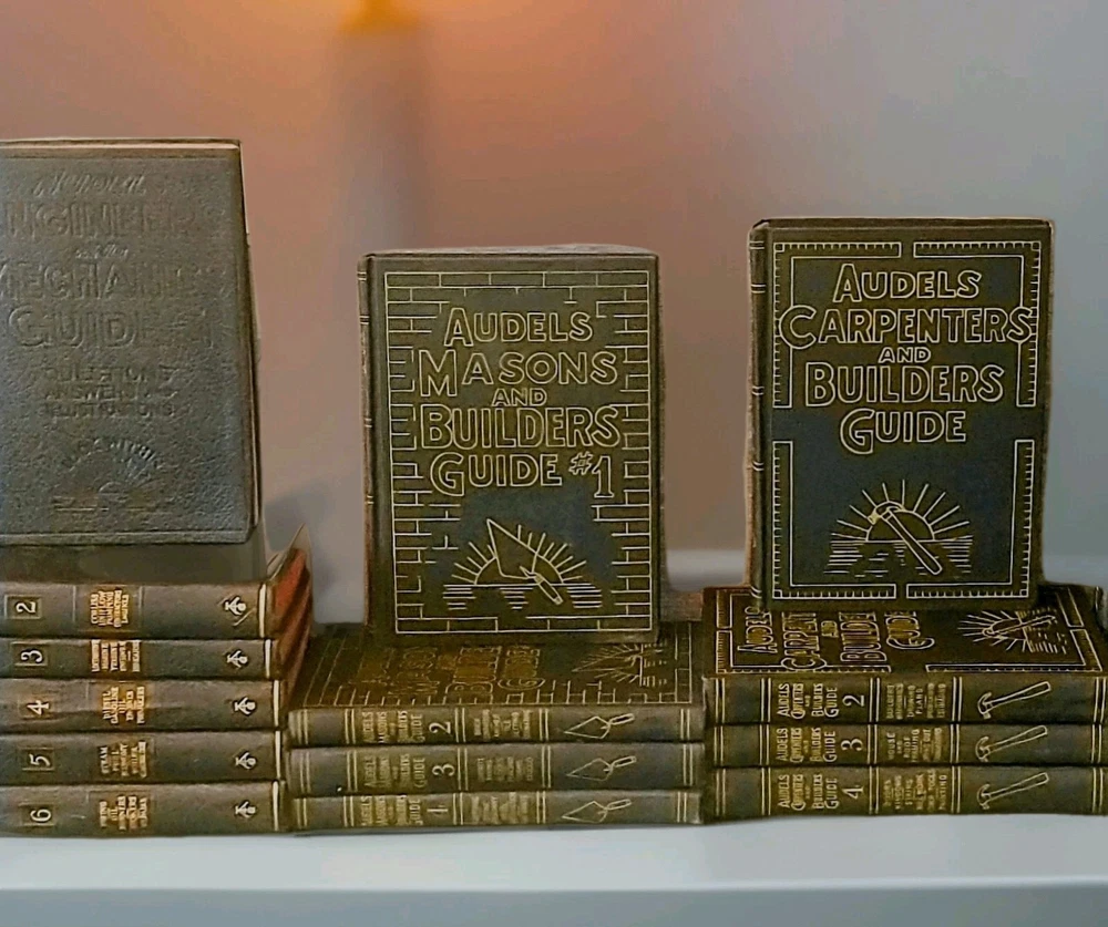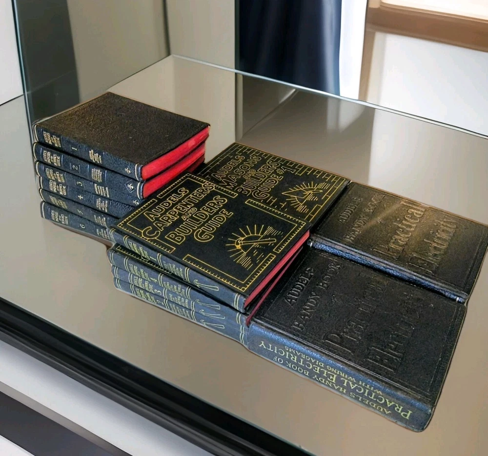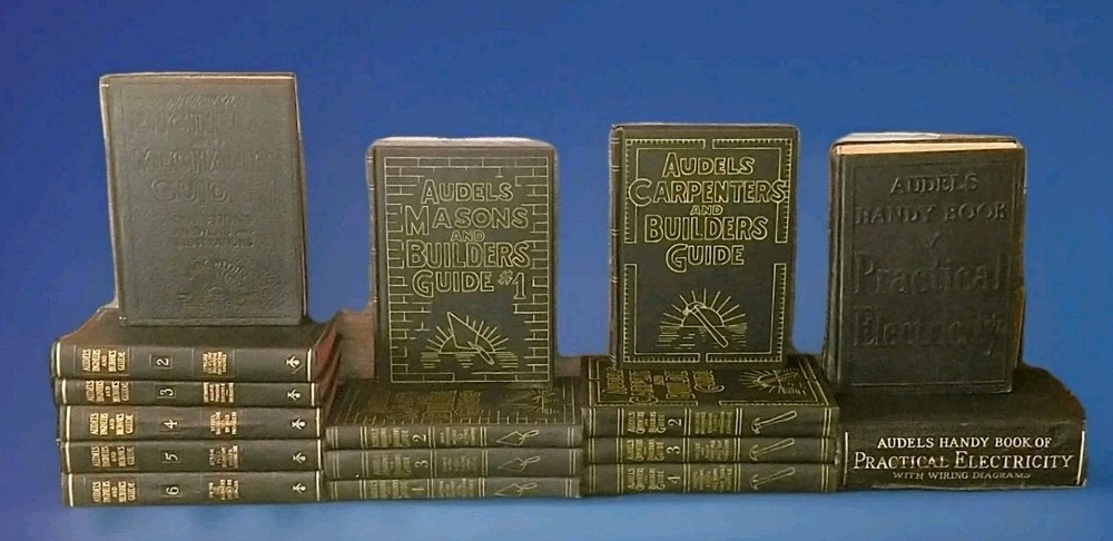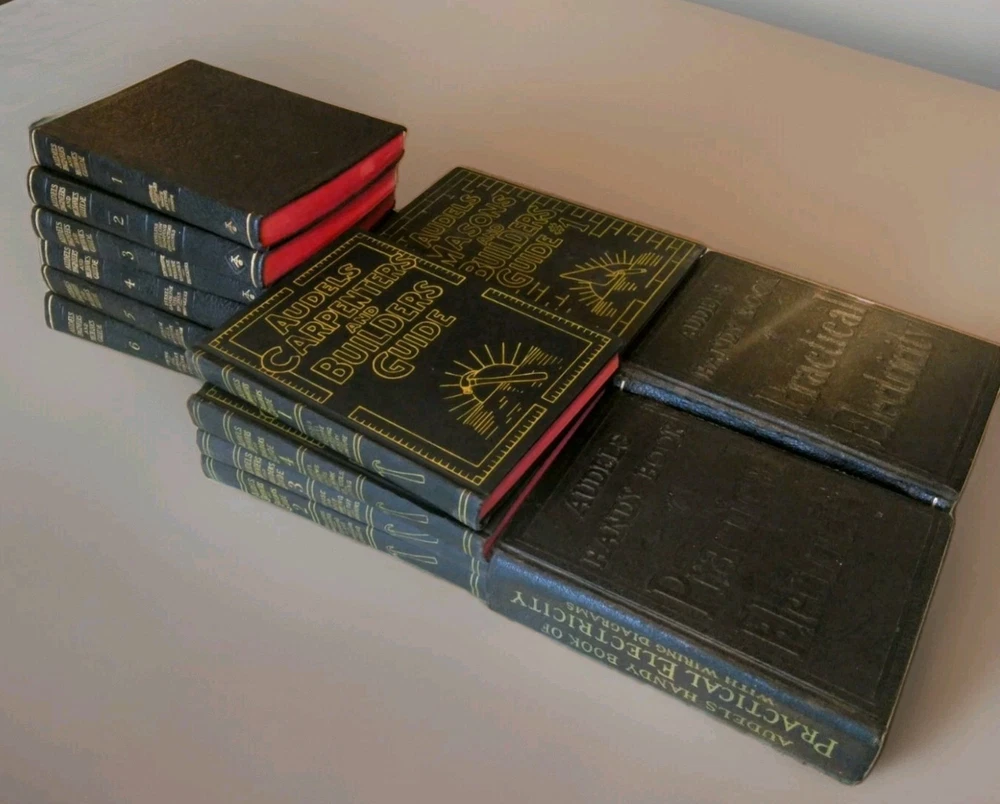 The product is a 16-book lot of Audels Guides, covering topics such as carpentry, masonry, engineering, mechanics, and electricity. Published by Theo. Audel & Company, the books are leather-bound hardcover editions with illustrations. Written by Frank D. Graham & Thomas J. Emery. A very nice vintage pre-owned lot of 16 Audels Guides books. All in very good overall pre-owned vintage condition. INCLUDED : 1. Engineer s & Mechanics Guides 1- 6 (softbound leather. Dates published varies span years 1927-1940 2. Carpenters & Builders Guides - 1-4 Hardcover Cloth boards. The dates published varies and span years 1951, 1954 3. Mason's & Builders Guides 1-4 Hardcover with cloth boards. Dates published varies from 1959-51 4. Handy Books of Electricity - 2 HC - 1 -1962 with splitting to interior seam to spine (good/fair condition) - 1 1951 hardcover leather (fair condition) with splitting to interior seam to spine. I take all of the pictures to my listings and do utilize eBays AI background tool to make my listings look more professional. Please review all pics provided.