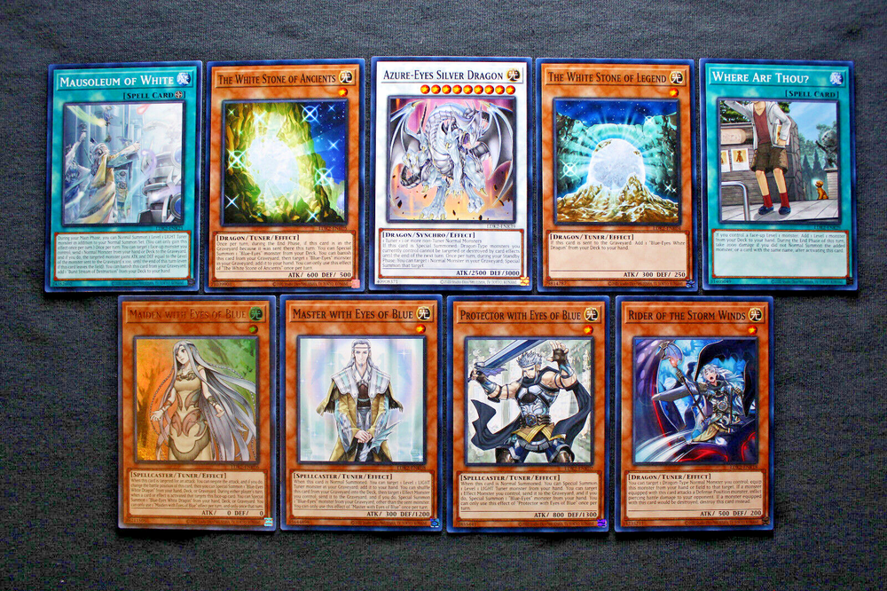 Description: This listing is for 9 Yu-Gi-Oh! cards designed for a Blue-Eyes White Dragon deck. This includes all cards shown in the picture: Azure-Eyes Silver Dragon The White Stone of Legend The White Stone of Ancients Maiden with Eyes of Blue (Ultra Rare) Master with Eyes of Blue Protector with Eyes of Blue Rider of the Storm Winds Mausoleum of White Where Arf Thou? Edition: Official TCG English, Unlimited Edition, from the Legendary Decks II set. Condition: Mint/Near Mint, just pulled from a box. Shipping: I always ship same or next business day. Shipping will be FREE via USPS First Class mail. I do ship worldwide! Shipping outside the US is $2.25 USD to all countries. Thanks for looking!