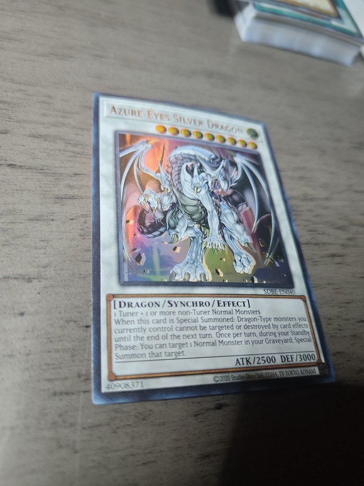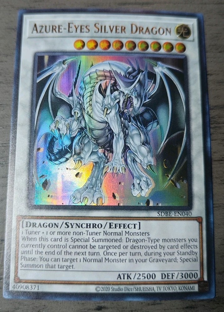 Pulled from the pack and immediately sleeved. Placed within my mailbox 📬 within 24 hours after purchase. Elevate your Yu-Gi-Oh! TCG collection with the majestic Azure-Eyes Silver Dragon from the Saga of Blue-Eyes White Dragon set. Card number SDBE-EN040 boasts a striking Ultra Rare rarity, ensuring it stands out in any deck or display. As a Synchro card with Effect capabilities, it brings a unique blend of strategy and power to the table. The Azure-Eyes Silver Dragon features an impressive 2500 Attack/Power and 3000 Defense/Toughness, ready to dominate the battlefield. With its Unlimited Edition feature, this card is a must-have for both players looking to enhance their game and collectors seeking a piece of Yu-Gi-Oh! history.
