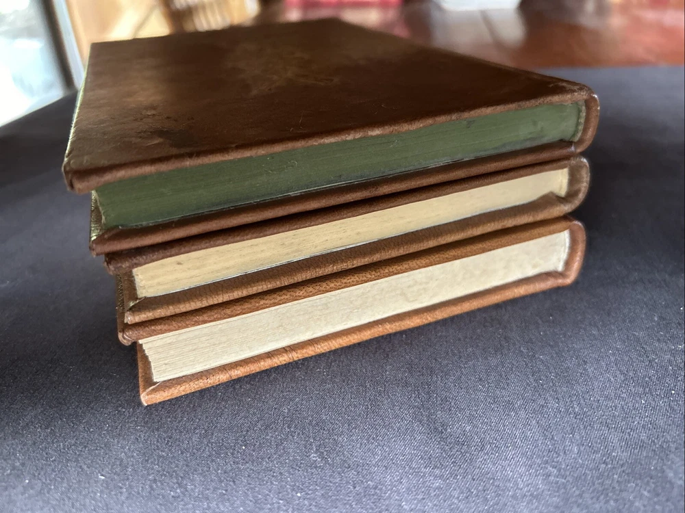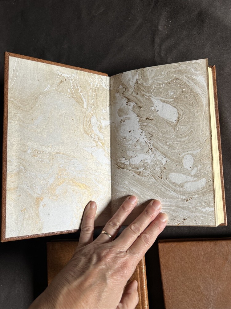 Unique coordinating hand marbled and leather bound HC hard cover copies of 1st edition Galactic Pot Healer by Philip K. Dick, At Last To Kiss Amanda by Frank Norris, and Into a Neutral Country by Hugo Wolfram. In very good condition, see photos. Sold as a book set. Also good for Antiquarian vintage decor.