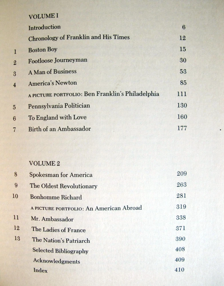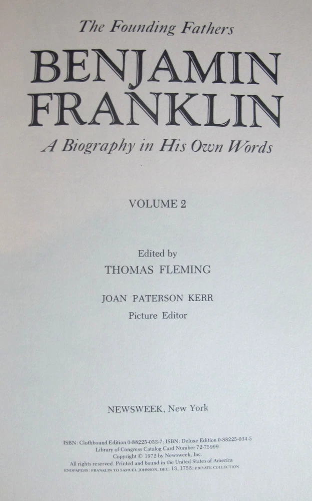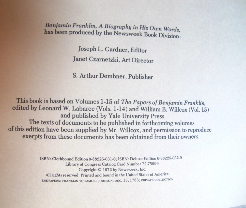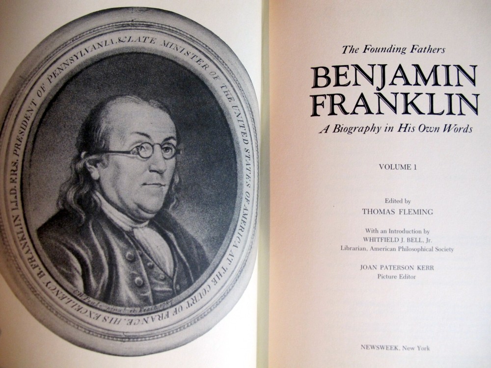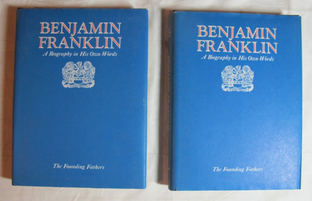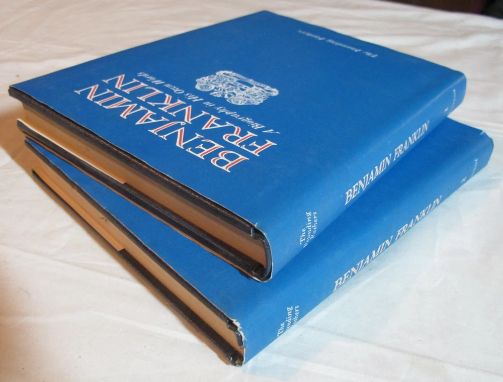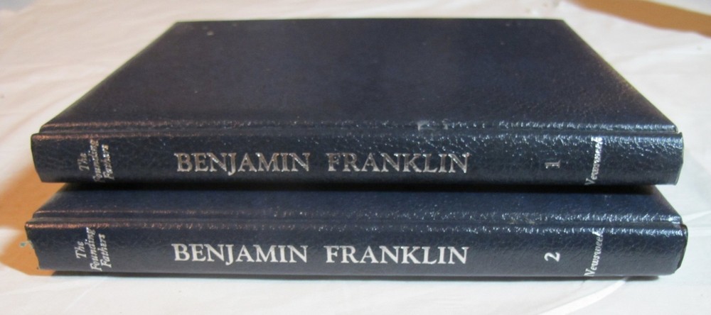 BENJAMIN FRANKLIN BIOGRAPHY IN HIS OWN WORDS LEATHER HB DJ 2 VOL. - US HISTORY BENJAMIN FRANKLIN BIOGRAPHY IN HIS OWN WORDS LEATHER HB DJ 2 VOL. - US HISTORY This is a nice leather hardcover 2-volume set entitled: "The Founding Fathers: Benjamin Franklin: A Biography in His Own Words" with dust jackets. Edited by Thomas Fleming, Introduction by Whitfield J. Bell, Jr., Picture Editor: Joan Paterson Kerr. Published 1972 by Newsweek, New York. Based on vol. 1-15 of The Papers of Benjamin Franklin. 416 pages total, including Bibliography & Index. Many color and black and white illustrations of historical documents, paintings, drawings, maps, etc. The books are in very good+ condition with light cover wear, very solid construction, very clean, crisp pages, name stamp on the first two pages of v. 1, & one small piece missing from very top edge of v. 2 cover, as shown. The dust jackets are in very good condition with light wear & a few tears around the edges, as shown. Be sure to check out our other current eBay related listings and more! Buyer pays 7.00 media shipping in the U.S., no International shipping on this item. Thanks for your interest! Listing and template services provided by inkFrog