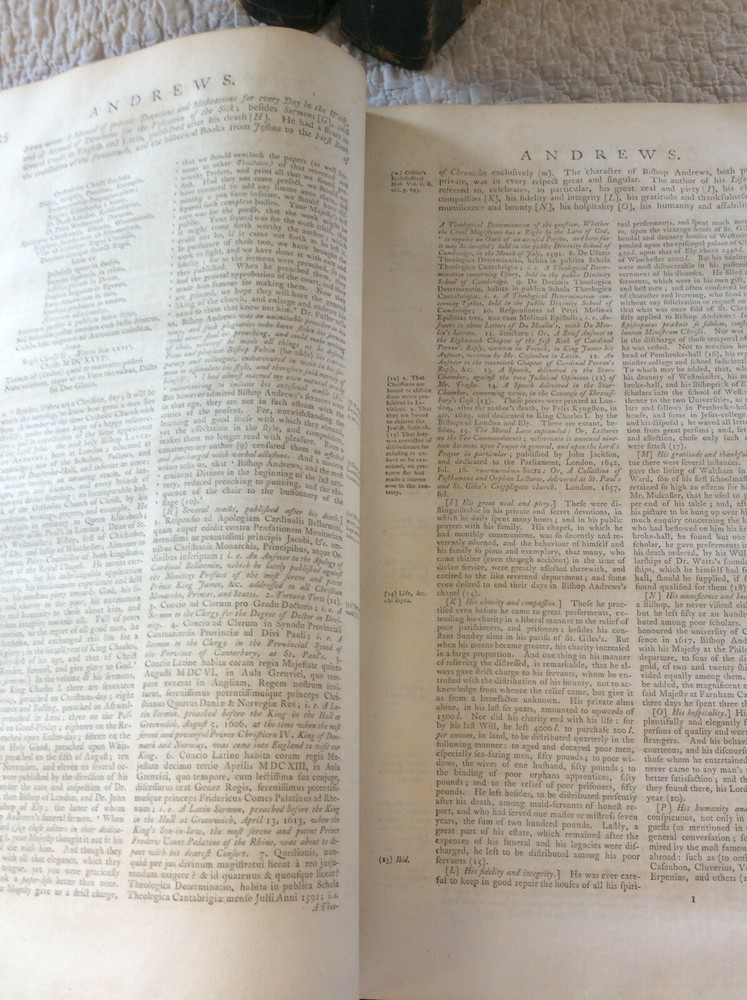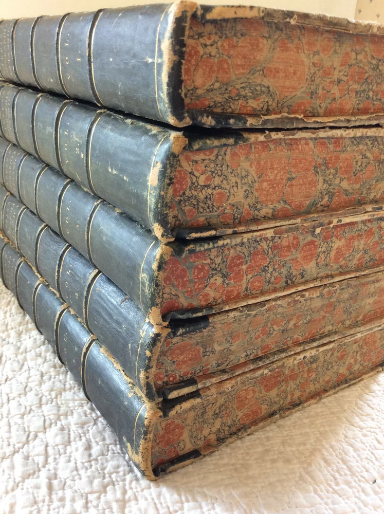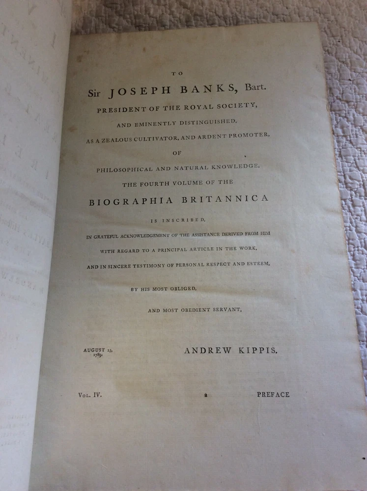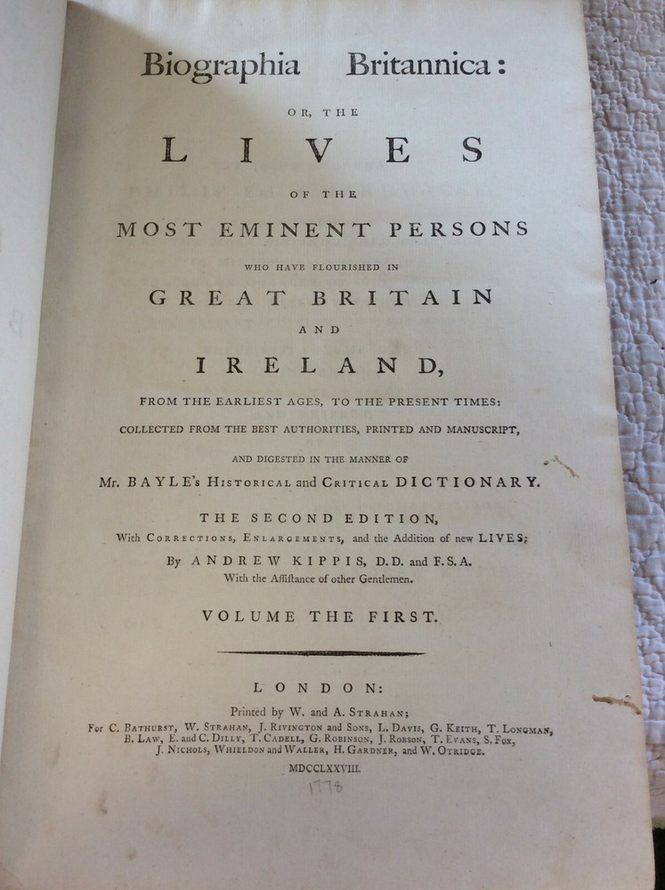 Andrew Kippis BIOGRAPHIA BRITANNICA or The Lives of the Most Eminent Persons who have flourished in Great Britain and Ireland: 5v set London: W. and A. Strahan, 1778-1793. Second Edition. Leather bound. Complete five-volume set of the second edition of the Biogrphia Britannica, revised and enlarged by Andrew Kippis. Bound in five folio volumes in matching 18th century bindings of 3/4 leather and marbled boards. Covers rubbed, leather worn at extremities. Minor worm holing in Volume One. Contents otherwise clean and unmarked. Bindings tight. Overall a solid set in good+ condition. Item #1245922 The second edition of this work was unfinished and covers only names A-Fa. Folio volumes, each measuring approx. 9 1/2 x 14 inches. The whole set takes up about 10 inches of shelf space.
