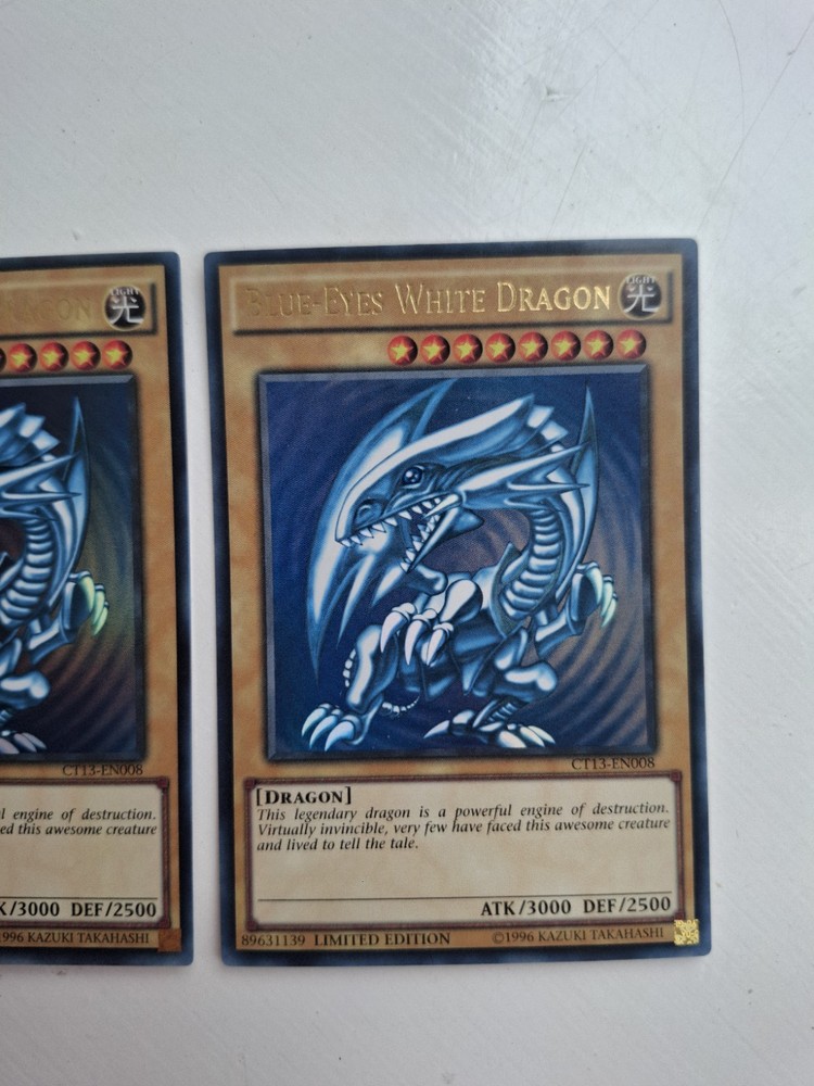 **Three Ultra Rare Blue Eyes White Dragons** from the Kaiba and Obelisk Mega Tin. Limited Edition. In mint/near mint condition. (Tin is only in the images as reference.)...