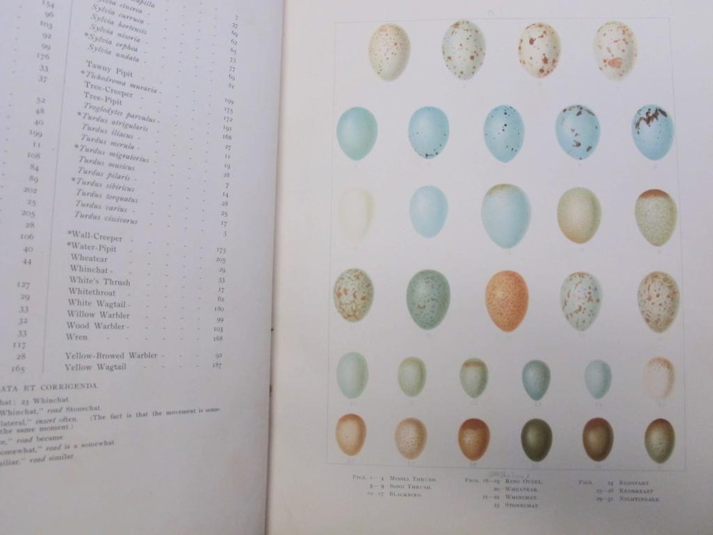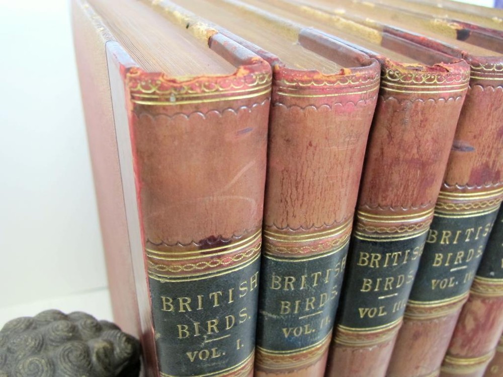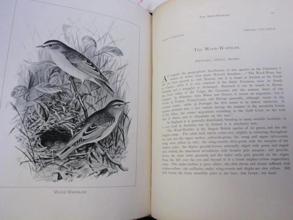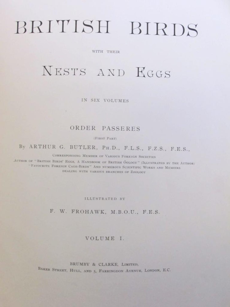 British Birds [With Their Nests and Eggs. By Arthur G. Butler . Illustrated by F. W. Frohawk. Brumby & Clarke, Limited. Dated 1896 in the introduction. 12 .5 x 10 inches.] Very goo d cond ition complete six volume set. Boun d in three quarter leather over pebbled cloth. All bindings are tight and square with clean white pages. Illustrated with many plates, images are the eggs are done in color and the birds are all in black and white. Leather is uniformly faded, and the books have a great shelf presence. Corners are lightly rubbed; leather is complete with a few small chips that can only be seen when looking down at the spine heads. First free end paper has some staining and the second free end paper has a raised blind stamp from the personal library of I David Porras. Overall, set is very nice and will serve as a fantastic investment and reference.