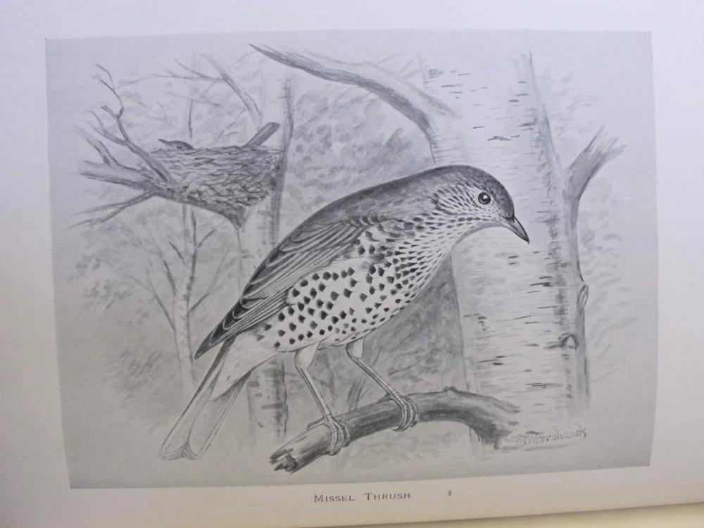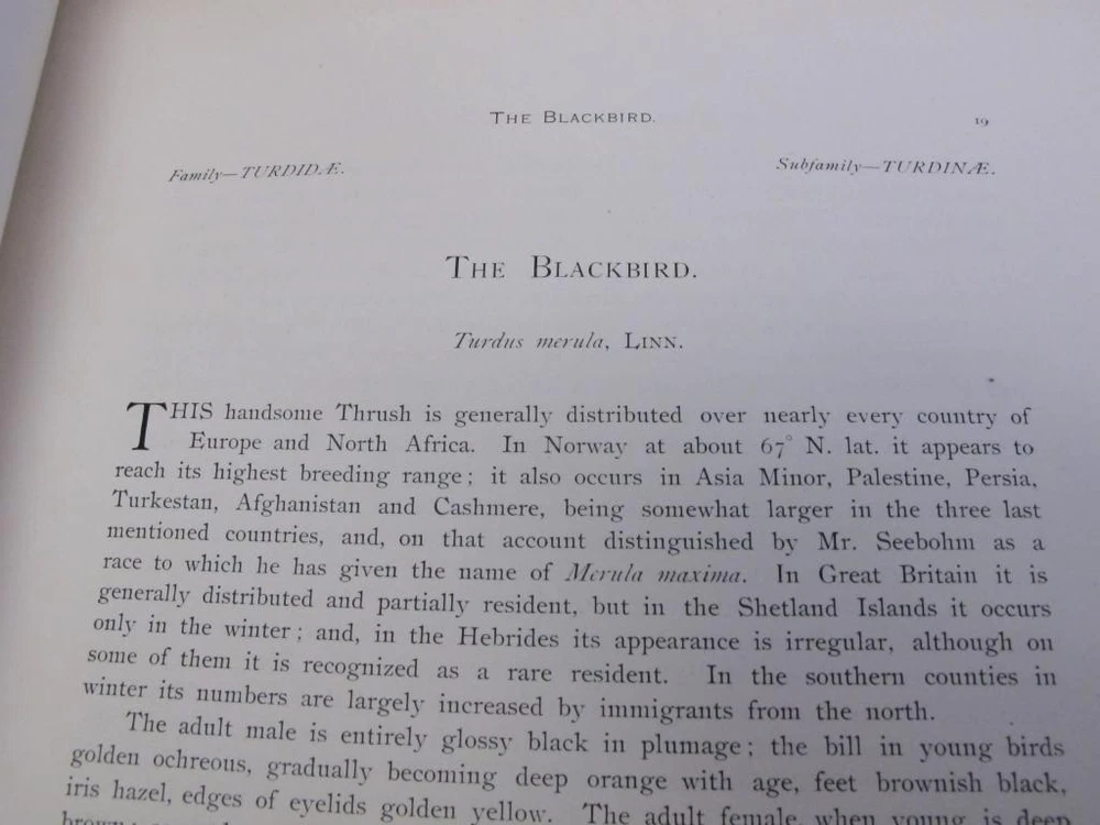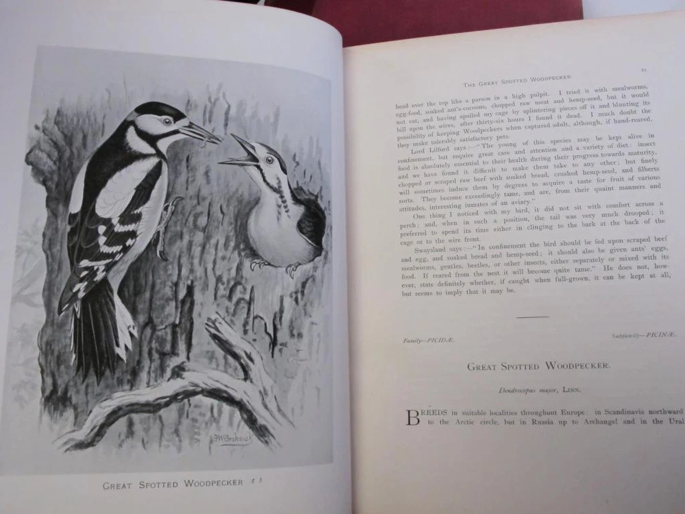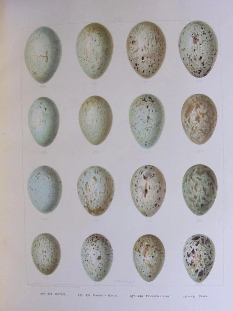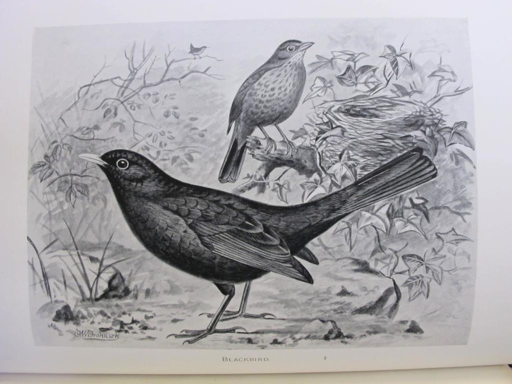 British Birds [With Their Nests and Eggs. By Arthur G. Butler . Illustrated by F. W. Frohawk. Brumby & Clarke, Limited. Dated 1896 in the introduction. 12 .5 x 10 inches.] Very goo d cond ition complete six volume set. Boun d in three quarter leather over pebbled cloth. All bindings are tight and square with clean white pages. Illustrated with many plates, images are the eggs are done in color and the birds are all in black and white. Leather is uniformly faded, and the books have a great shelf presence. Corners are lightly rubbed; leather is complete with a few small chips that can only be seen when looking down at the spine heads. First free end paper has some staining and the second free end paper has a raised blind stamp from the personal library of I David Porras. Overall, set is very nice and will serve as a fantastic investment and reference.