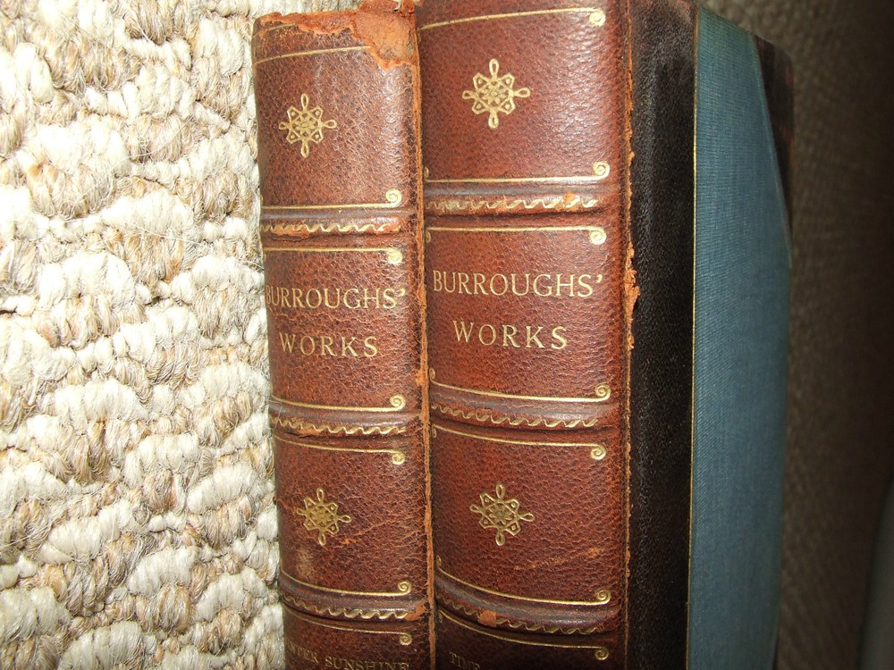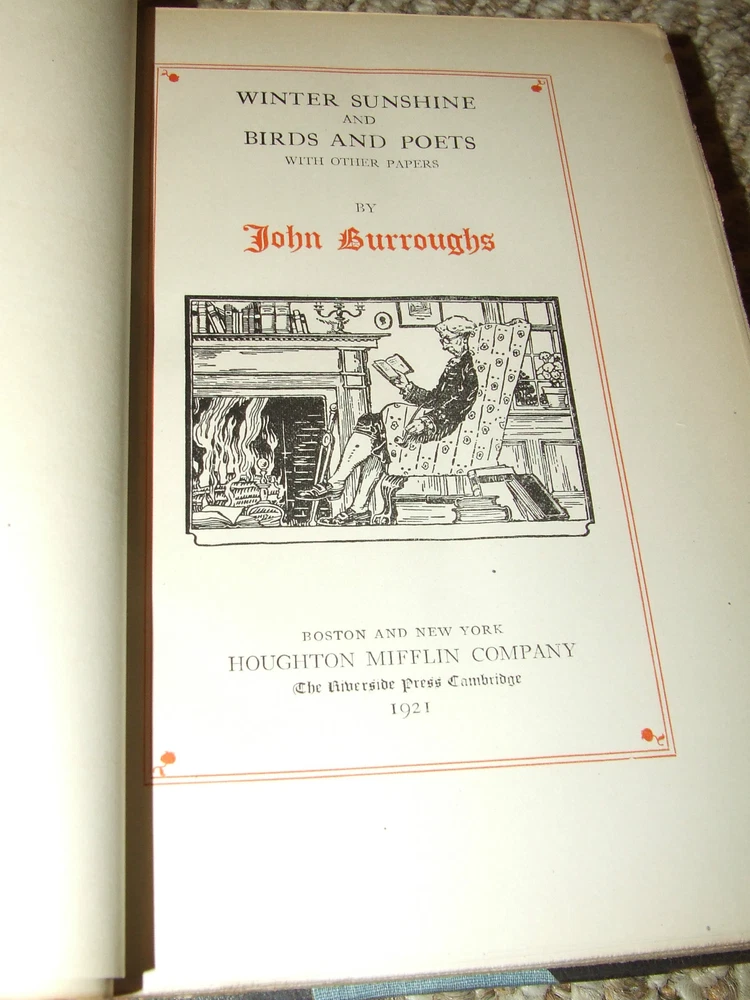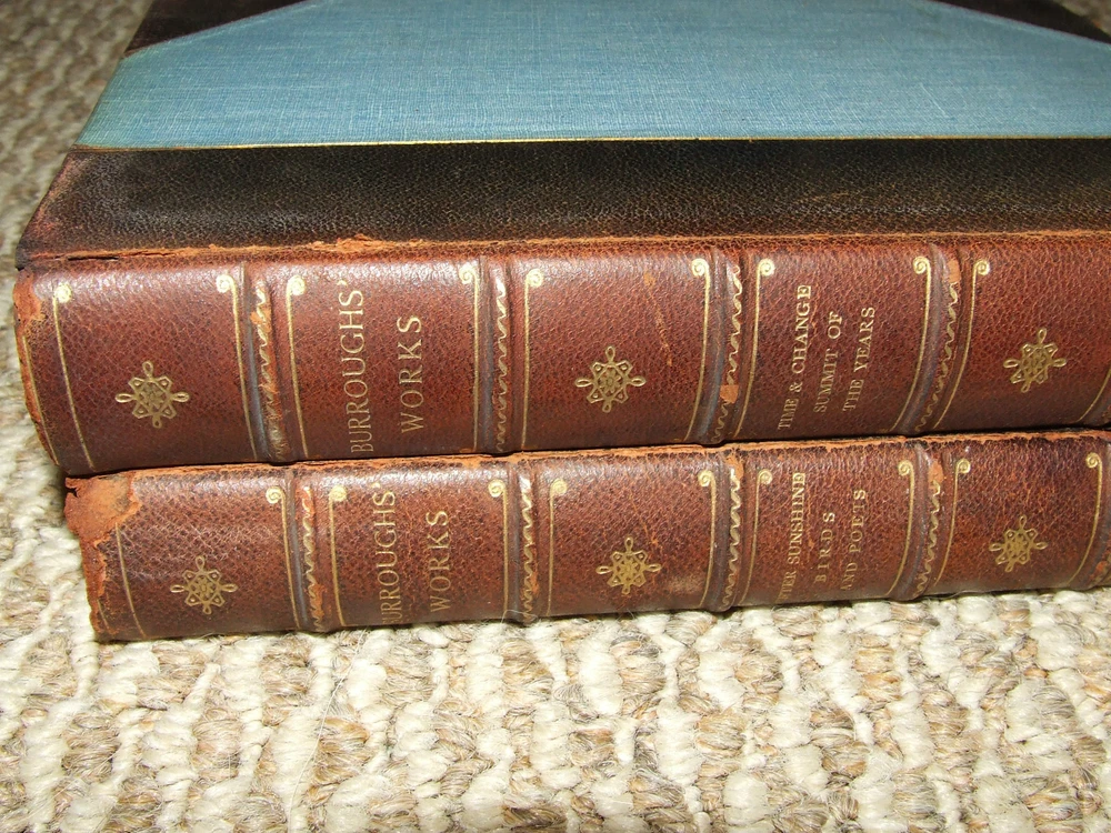 Here is a recent estate find. This is a Rare First Edition Antique 2 Volume Leather Book Set Entitled "Burroughs' Works", published in 1921 by Boston and New York - Houghton Mifflin Company USA, and Printed by The Riverside Press Cambridge Mass. in 1921. The First Book is Entitled "Winter Sunshine and Birds and Poets with Other Papers", and the Second Volume is Entitled "Time and Change and The Summit Of The Years". Each Volume measures approx. 8 1/2" x 6". There is some Dust and Shelf Wear to the Leather Spine from age, As Pictured. Click and Enlarge Photos for Details. The Pages are Clean and the Binding is Tight! Overall Good Condition, as pictured! These appear Unread and are very Clean for a 100 year old Set!!! Don't pass this one up, $99.99