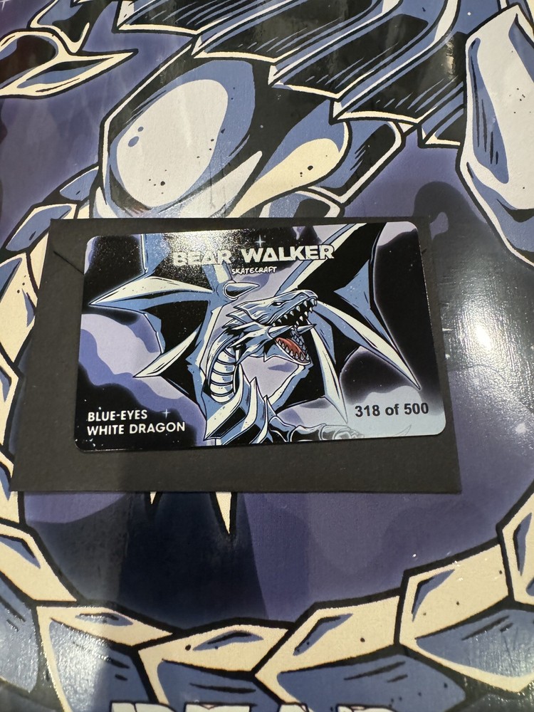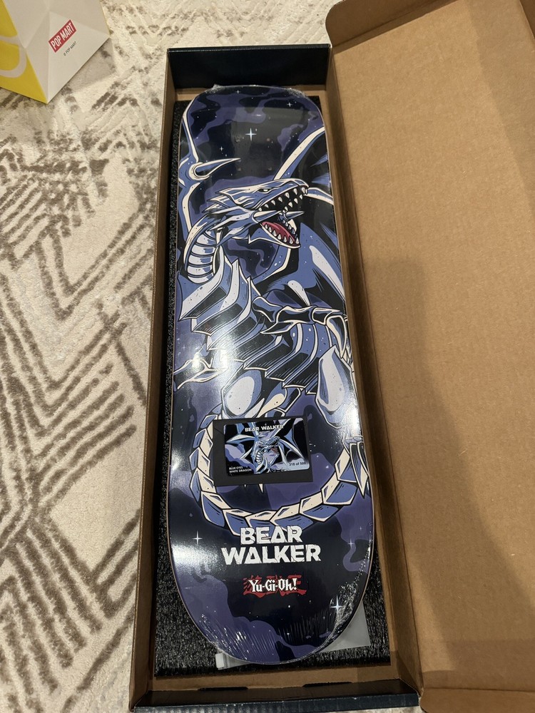 This limited edition Bear Walker skateboard deck is a must-have for any Yu-Gi-Oh fan. With only 500 decks produced, this deck is numbered 318/500 and features a stunning Blue Eyes White Dragon design. The deck is signed and perfect for collectors or anyone who loves outdoor sports and skateboarding. The brand, Bear Walker, is known for its high-quality skateboard parts and this deck is no exception. Whether you're a seasoned skater or just starting out, this deck is sure to impress.