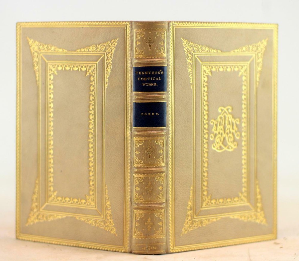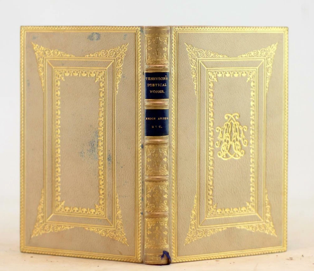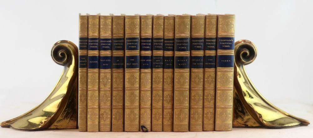 Hardcover. 12mo. Edward Moxon/Strahan & Co/Henry S King/C. Kegan Paul London, UK. 1848-1880. 12 volumes. Bound by Bickers & Son in full white gilt decorated leather with gilt design present to the boards with Tennyson's monogram present to the front board with raised bands and blue spine labels present to the spine. Silk ribbon bookmark. All edges gilt. Silk bookmarks. Boards lightly rubbed and worn and soiled (blue marks present to Enoch Raden and In Memoriam from blue leather from another set rubbing against this set). Text is clean and free of marks. Binding tight and solid. Alfred Tennyson, 1st Baron Tennyson, FRS (6 August 1809 – 6 October 1892) was Poet Laureate of Great Britain and Ireland during much of Queen Victoria's reign and remains one of the most popular British poets. Bickers & Son Fine Leather Set 1848-1880 The Works of Alfred Lord Tennyson Bickers & Son Fine Leather Set 1848-1880 The Works of Alfred Lord Tennyson Click images to enlarge Description Up For Sale Today is The Poetical Works Of Alfred Tennyson In 12 Volumes Poems, The Princess: A Medley, Idylls of the King, In Memoriam, Enoch Arden, The Holy Grail, Gareth and Lynette Etc., Queen Mary, A Drama, Harold, The Lover's Tale, Ballads, Etc. by Alfred Tennyson Hardcover. 12mo. Edward Moxon/Strahan & Co/Henry S King/C. Kegan Paul London, UK. 1848-1880. 12 volumes. Bound by Bickers & Son in full white gilt decorated leather with gilt design present to the boards with Tennyson's monogram present to the front board with raised bands and blue spine labels present to the spine. Silk ribbon bookmark. All edges gilt. Silk bookmarks. Boards lightly rubbed and worn and soiled (blue marks present to Enoch Raden and In Memoriam from blue leather from another set rubbing against this set). Text is clean and free of marks. Binding tight and solid. FROM WIKIPEDIA: Alfred Tennyson, 1st Baron Tennyson, FRS (6 August 1809 – 6 October 1892) was Poet Laureate of Great Britain and Ireland during much of Queen Victoria's reign and remains one of the most popular British poets. Tennyson excelled at penning short lyrics, such as "Break, Break, Break", "The Charge of the Light Brigade", "Tears, Idle Tears" and "Crossing the Bar". Much of his verse was based on classical mythological themes, such as Ulysses, although In Memoriam A.H.H. was written to commemorate his friend Arthur Hallam, a fellow poet and student at Trinity College, Cambridge, after he died of a stroke aged just 22. Tennyson also wrote some notable blank verse including Idylls of the King, "Ulysses", and "Tithonus". During his career, Tennyson attempted drama, but his plays enjoyed little success. A number of phrases from Tennyson's work have become commonplaces of the English language, including "Nature, red in tooth and claw" (In Memoriam A.H.H.), "'Tis better to have loved and lost / Than never to have loved at all", "Theirs not to reason why, / Theirs but to do and die", "My strength is as the strength of ten, / Because my heart is pure", "To strive, to seek, to find, and not to yield", "Knowledge comes, but Wisdom lingers", and "The old order changeth, yielding place to new". He is the ninth most frequently quoted writer in The Oxford Dictionary of Quotations. OUR MISSION STATEMENT: Our goal is to provide the best books for the lowest prices. We understand that you have more choices than ever to buy books, so we strive to provide the best service, accurate descriptions, the cheapest shipping and the best customer service in the realm of bookselling. Thank you for visiting this listing and we hope to see you again soon! Book formats and corresponding sizes Name Abbreviations Leaves Pages Approximate cover size (width × height) inches cm folio 2º or fo 2 4 12 × 19 30.5 × 48 quarto 4º or 4to 4 8 9½ × 12 24 × 30.5 octavo 8º or 8vo 8 16 6 × 9 15 × 23 duodecimo or twelvemo 12º or 12mo 12 24 5 × 7⅜ 12.5 × 19 sextodecimo or sixteenmo 16º or 16mo 16 32 4 × 6¾ 10 × 17 octodecimo or eighteenmo 18º or 18mo 18 36 4 × 6½ 10 × 16.5 trigesimo-secundo or thirty-twomo 32º or 32mo 32 64 3½ × 5½ 9 × 14 quadragesimo-octavo or forty-eightmo 48º or 48mo 48 96 2½ × 4 6.5 × 10 sexagesimo-quarto or sixty-fourmo 64º or 64mo 64 128 2 × 3 5 × 7.5 ALL ITEMS ARE DESCRIBED TO THE BEST OF MY ABILITY! PLEASE CHECK ALL THE PHOTOS BEFORE BIDDING! ALL ITEMS ARE WRAPPED IN 2 LAYERS OF BUBBLE WRAP AND THEN PLACED INTO A CUSTOM FITTED CARDBOARD MAILER. IF YOU WIN A LARGE NUMBER OF BOOKS OR A SET THE ITEMS WILL BE SHIPPED IN A STURDY BOX. IF YOU DO WIN MULTIPLE ITEMS PLEASE DO NOT PAY FOR THEM INDIVIDUALLY! PAYMENT IS DUE WITHIN SEVEN (7) DAYS OF THE INVOICE! Import duties, taxes and charges are not included in the item price. These charges are the buyer's responsibility. Please check with your country's customs office to determine what these additional costs will be prior to bidding/buying. These charges are typically collected by the delivering freight (shipping) company or when you pick the item up. We do not mark merchandise values below value or mark items as "gifts" as US and International government regulations prohibit such behavior. (This is a felony in the United States) FREE DOMESTIC (MEDIA MAIL) FREIGHT ON ALL ITEMS! Get images that make Supersized seem small. Showcase your items with Auctiva's Listing Templates! THE simple solution for eBay sellers. Track Page Views With Auctiva's FREE Counter