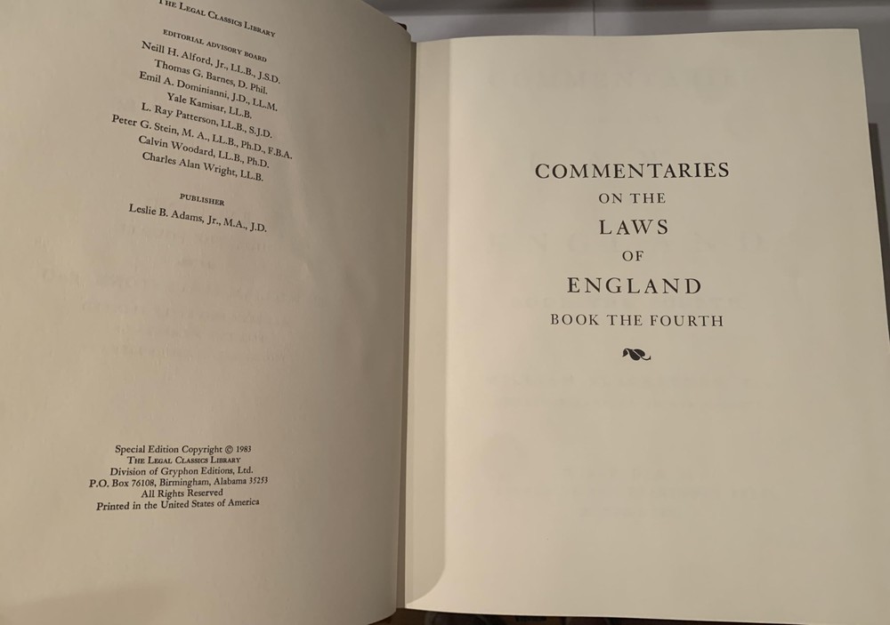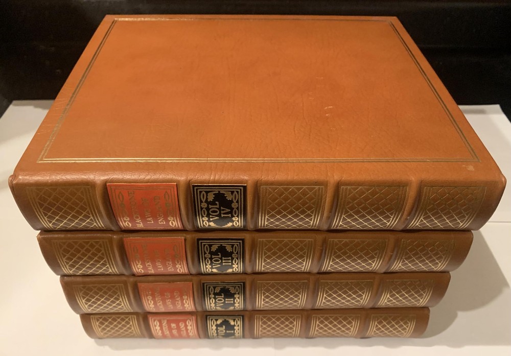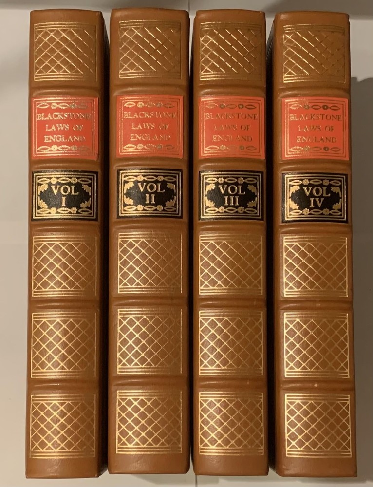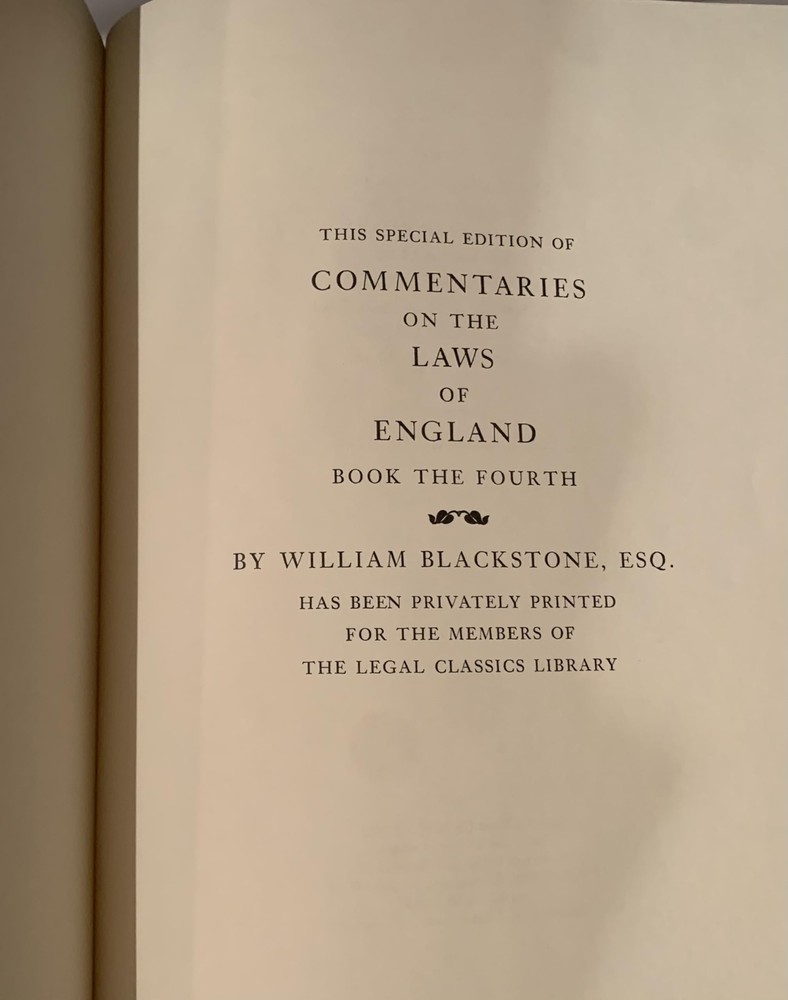 CONDITION Legal Classics Library. Four volumes in very good condition. Leather-bound, beautiful marbled end pages and black book ribbon. Not ex-library copies. Binding tight; spine straight and smooth, with little wear; cover in overall good condition. May have slight signs of handling or shelving. Packaged with care and shipped ASAP with delivery confirmation. If you are not satisfied with the condition of the book, please return the item for a refund. DESCRIPTION "The Commentaries on the Laws of England" is an influential 18th-century treatise on the common law of England by Sir William Blackstone between 1765–1770. This body of work covers in each respective volume the rights of persons, the rights of things, private wrongs, and public wrongs. The Commentaries were long regarded as the leading work on the development of English law and played a role in the development of the American legal system. They were in fact the first methodical treatise on the common law suitable for a lay readership since at least the Middle Ages. The common law of England has relied on precedent more than statute and codifications and has been far less amenable than the civil law, developed from the Roman law, to the needs of a treatise. The Commentaries were influential largely because they were in fact readable, and because they met a need. As such, they were used in the training of American and British lawyers long after the death of Blackstone. The Commentaries are often quoted as the definitive pre-Revolutionary source of common law by United States courts. Opinions of the Supreme Court of the United States quote from Blackstone's work whenever they wish to engage in historical discussion that goes back that far, or farther (for example, when discussing the intent of the Framers of the Constitution).