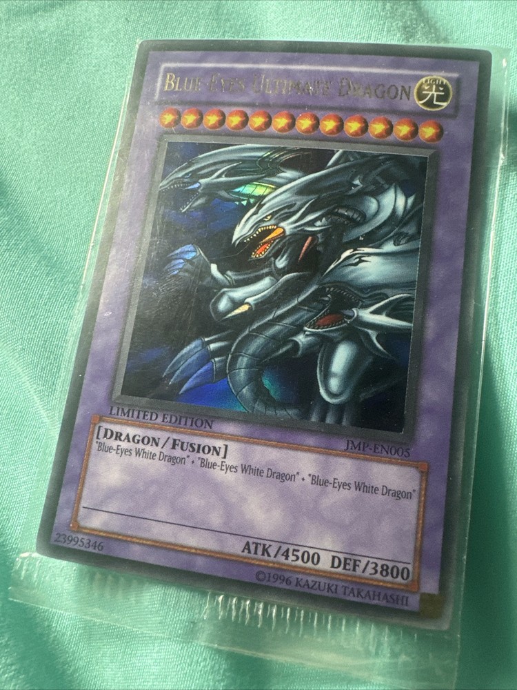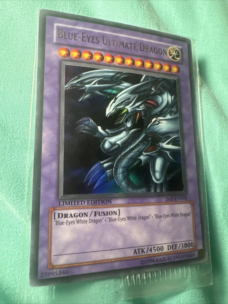 The "Blue Eyes Ultimate Dragon JMP-EN005 Sealed Promo" is a collectible card from the Yu-Gi-Oh! TCG game featuring Dragons, specifically the Blue Eyes Ultimate Dragon. This card is a promotional item that comes sealed and is highly sought after by collectors and players of the game. With its striking design and powerful abilities, the Blue Eyes Ultimate Dragon is a valuable addition to any collection of Yu-Gi-Oh! cards, especially for fans of the Blue Eyes White Dragon archetype and the color Blue in the game.