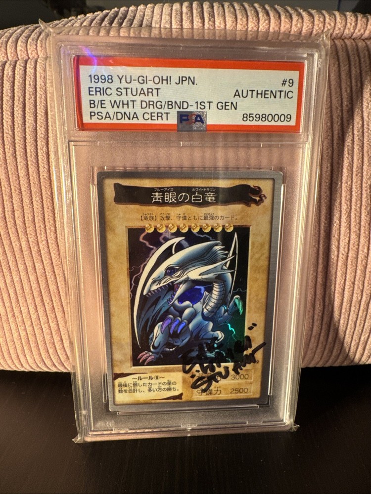 Own a piece of Yu-Gi-Oh! history — an authentic 1998 Japanese 1st Gen Blue-Eyes White Dragon card signed by Eric Stuart, the English voice actor of Seto Kaiba! This is a 1-of-1 collector’s item, PSA/DNA Certified (#85980009), encased in an official PSA slab marked “Authentic.” Perfect for fans of the original anime or rare card collectors. Ships safely and securely. Open to offers!
