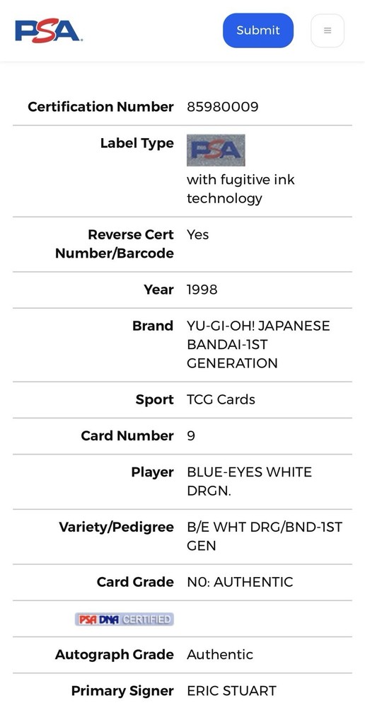 This is an absolute grail for Yu-Gi-Oh! collectors! A pristine 1998 Japanese 1st Gen Blue-Eyes White Dragon, autographed by Eric Stuart (Seto Kaiba’s iconic VA), and certified by PSA/DNA as a one-of-a-kind treasure. The nostalgia factor is unreal—owning this feels like holding a piece of the anime’s golden era. The slab ensures protection, and the rarity makes it a must-have for serious fans. If you’ve ever dreamed of owning a legendary card, this is it. Don’t miss out!