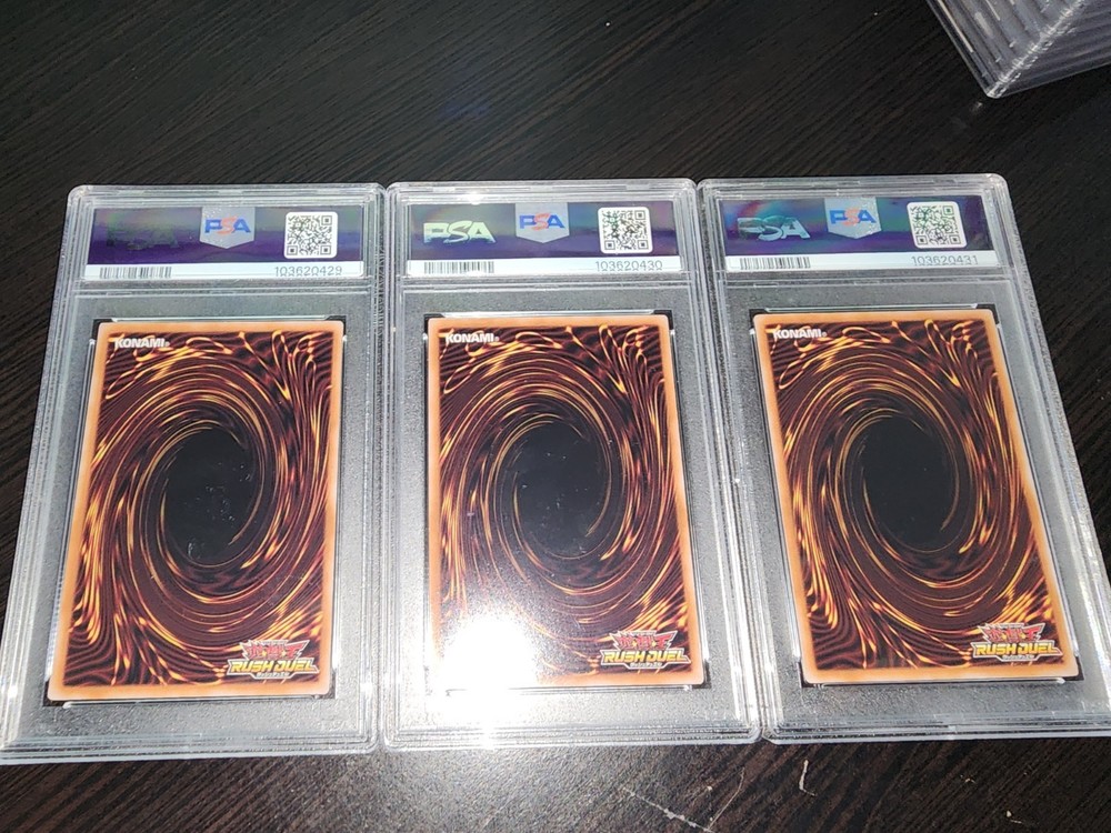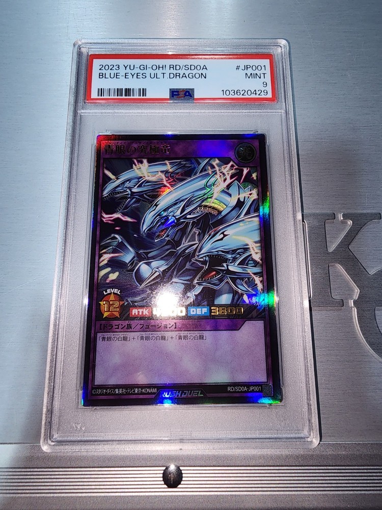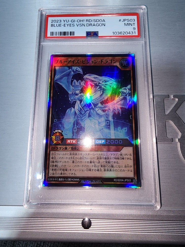 Unleash the power of the Blue Eyes White Dragon with this 2023 Rush Duel Japanese edition card. Graded a 9 by the Professional Sports Authenticator (PSA), it promises both premium quality and competitive edge. The iconic Dragon creature type, paired with the holographic finish, makes it a standout piece for collectors and players alike. Set of 3 blue Eyes. psa 9s in sequential order. Japanese. Crafted by the renowned Konami, this card boasts a stunning white and blue color scheme that is sure to compliment any deck or display. This item is not autographed and originates from Japan, adding an authentic touch to its allure. Whether for play or collection, this Yu-Gi-Oh! TCG card is a must-have for enthusiasts.