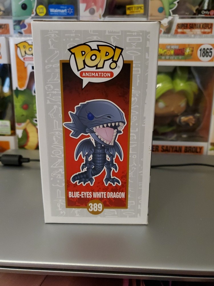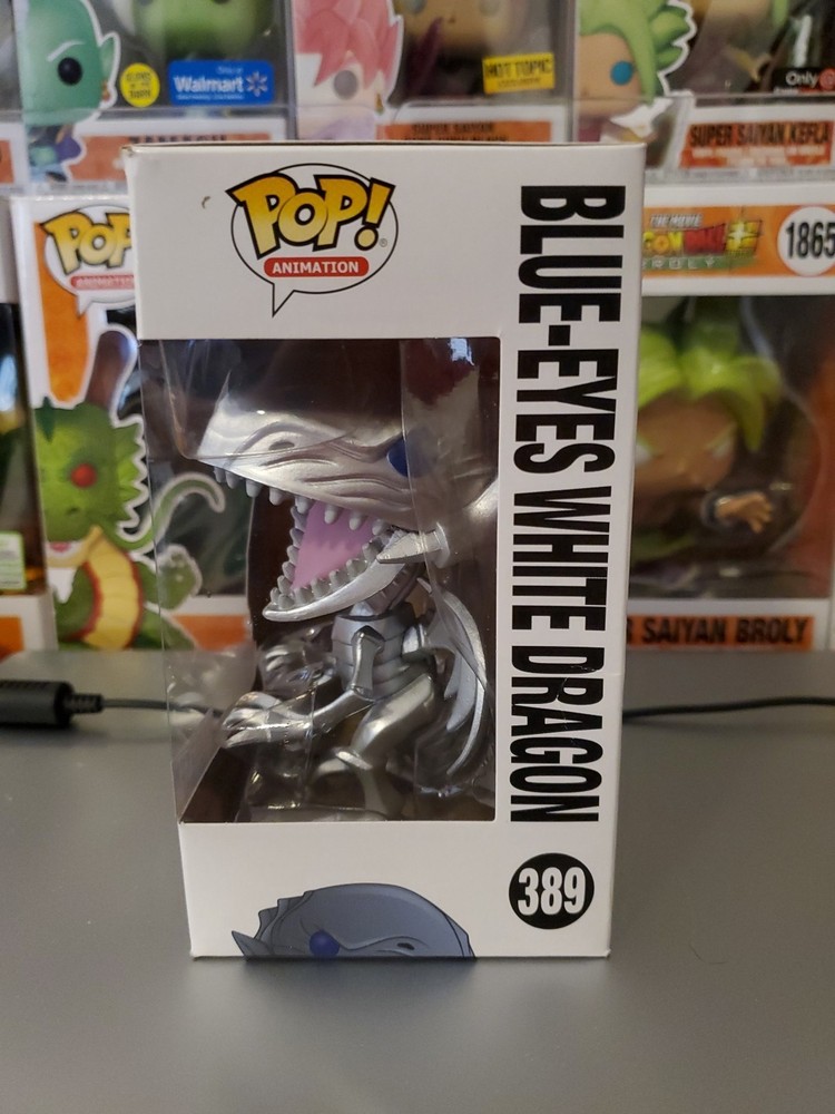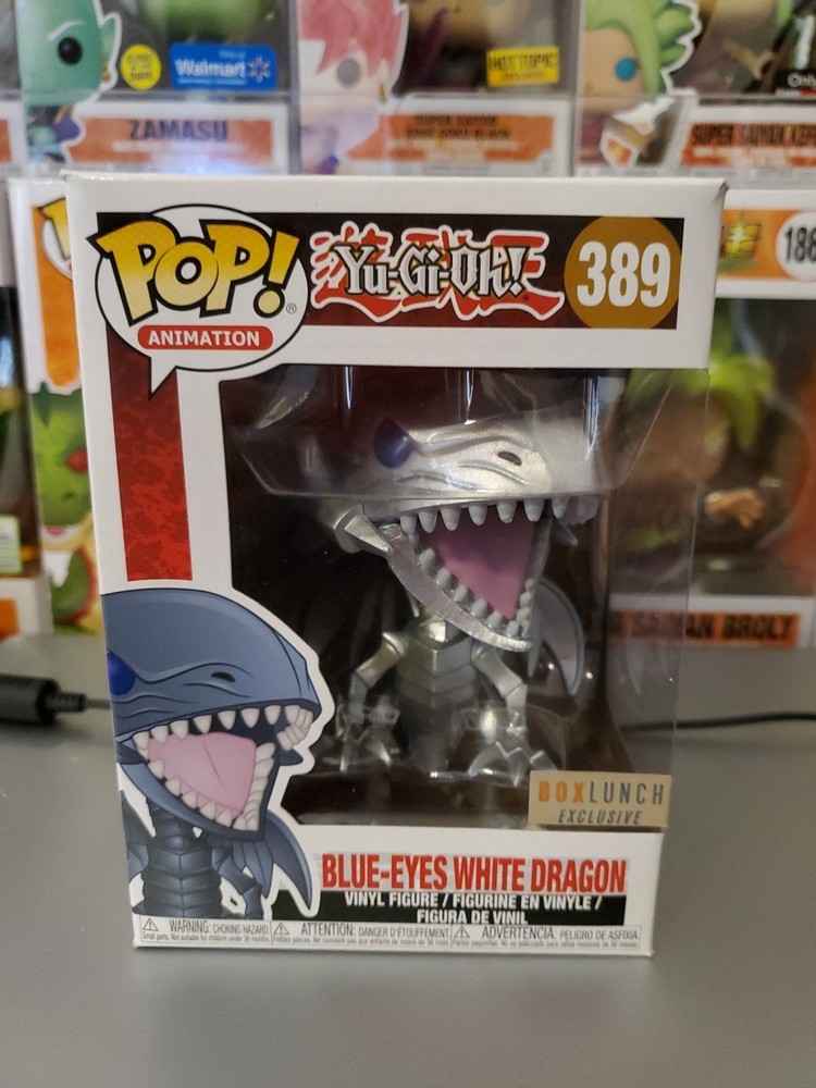 the Blue eyes white dragon Metallic Funko Pop is in fantastic condition Exclusive from Box Lunch. Very Very small minor tear on the top right corner (shown in photos). Pop will be shipped ASAP with plenty of care and bubble wrap, as well as a free protector. I'm a collector myself and will always ship how I'd like it recieved. Thanks for looking and God bless:) Please message me with any questions