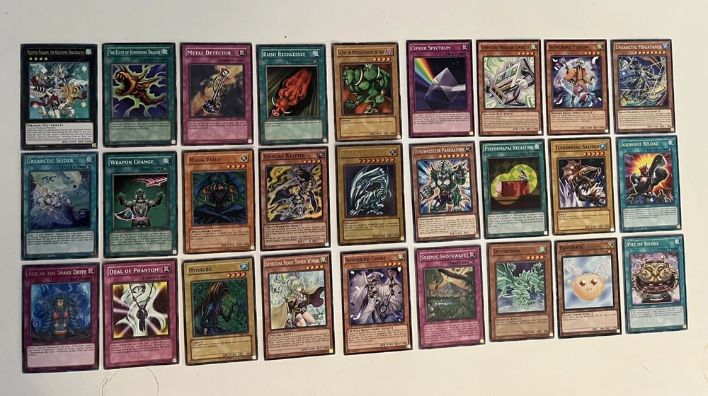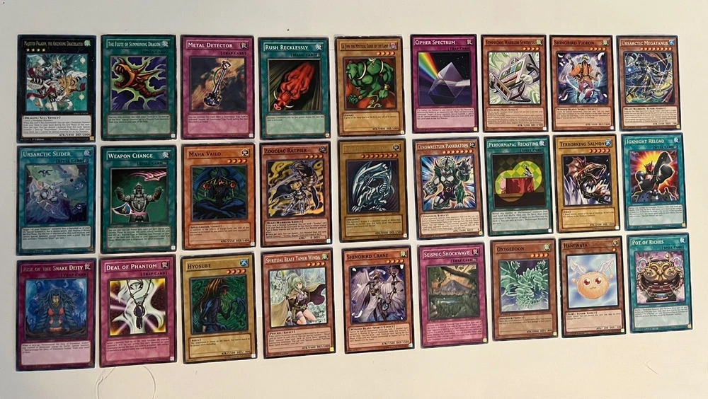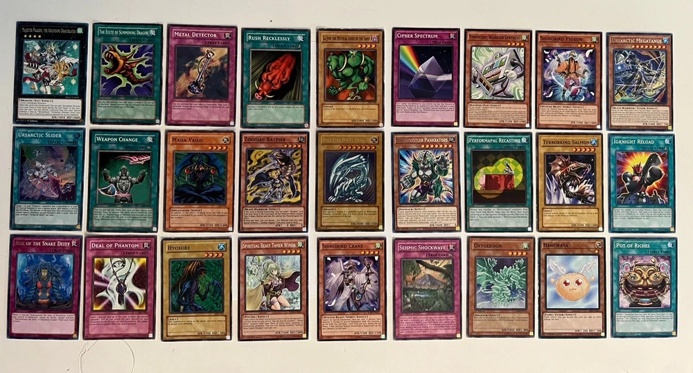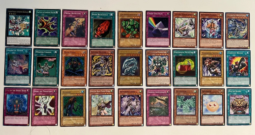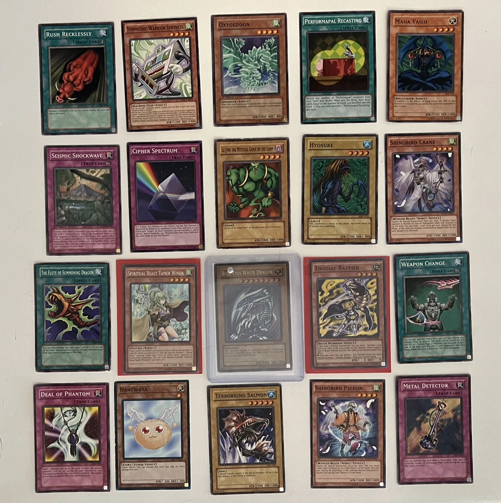This lot of 27 Yu-Gi-Oh! cards from the Kaiba starter deck includes a variety of trap, spell, and monster cards. Among the cards included are the iconic Blue Eyes White Dragon, as well as other popular characters such as Seto Kaiba and Spiritual Beast Tamer Winda. These cards are all in lightly played condition and have been well-preserved on card stock material including an EXCELLENT CONDITION SDK 001 Blue-Eyes White Dragon! Each of these cards features unique illustrations by Kazuki and were manufactured by Konami in the United States. Whether you're an avid collector or a player of the Yu-Gi-Oh! Trading Card Game, this lot offers a great selection of cards to add to your collection. Shipping is USPS priority mail with tracking within 24hr after purchase. Thank you & god bless :)