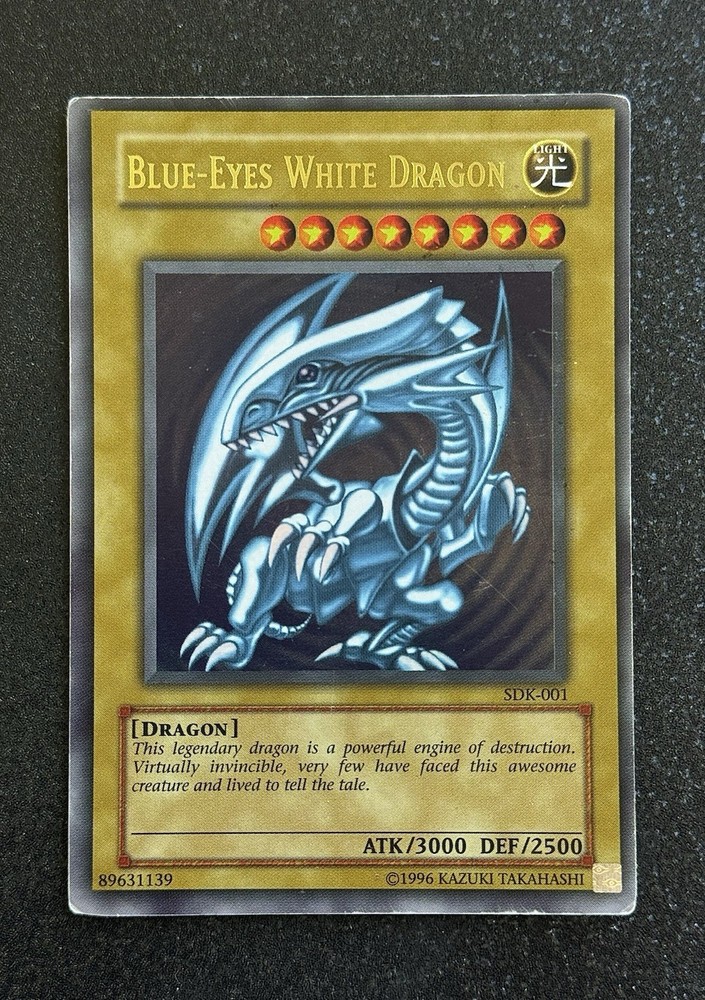 Up for sale is an ultra rare Blue-Eyes White Dragon card from the Yu-Gi-Oh! TCG Starter Deck: Kaiba-Unlimited Edition. This card has a light dragon creature/monster type with 2500 defense/toughness and 3000 attack/power. It was manufactured by Konami in 1996 and has a vintage holo finish. The card is in English and has the card number SDK-001. This collectible card game individual card is a must-have for any serious Yu-Gi-Oh! TCG collector.