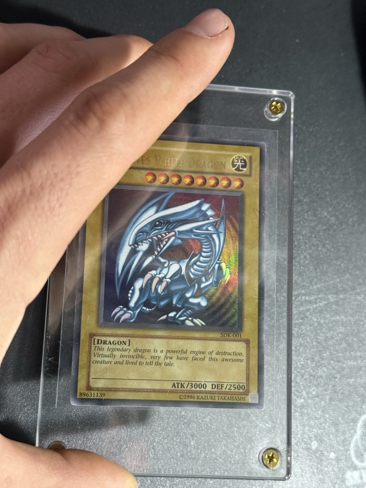 The product is a Blue Eyes White Dragon card from the Yu-Gi-Oh! Trading Card Game. It is an Ultra Rare, Unlimited edition card with a Holo finish. The card features the creature type Dragon and is manufactured by Konami. It is a Normal card made of Card Stock material. The card is not autographed and not graded. It has a unique serial number SDK Dash 001, but the ink on the card appears faded. This card is faded. You can tell how yellow it is not looking for any DM’s talking to me about what it’s worth.