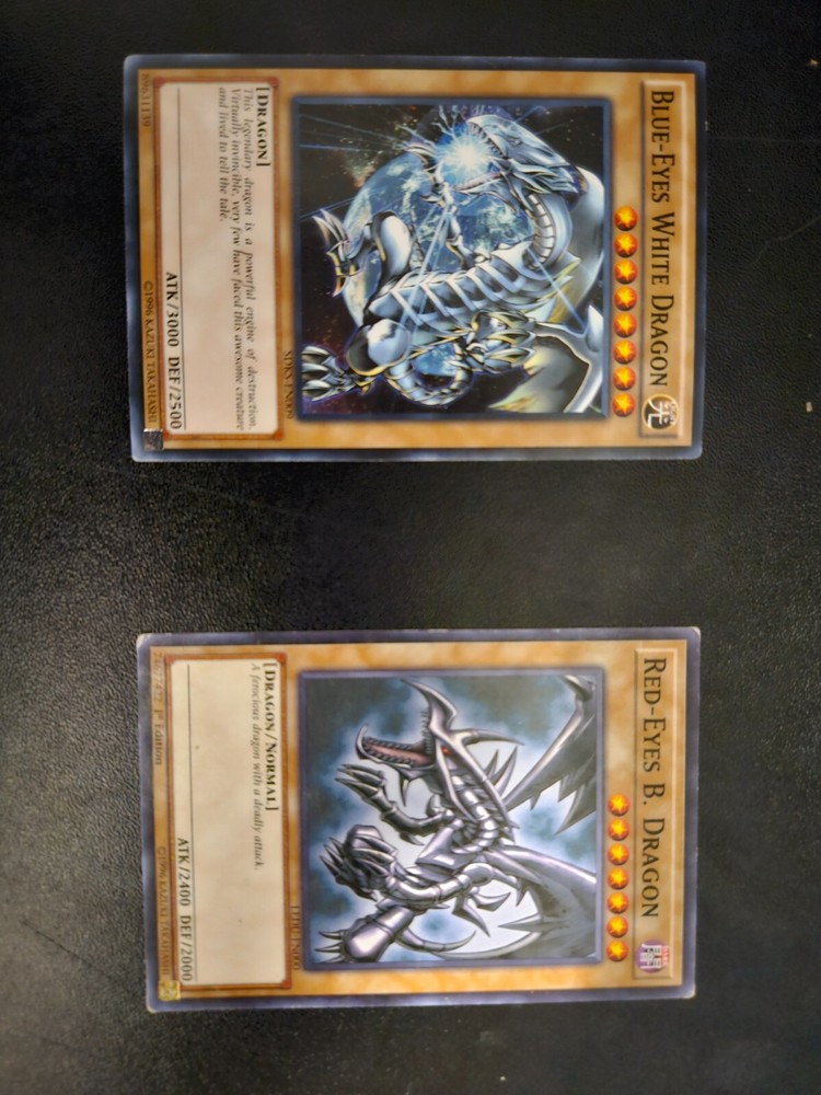 Up for sale are two highly sought after Yu-Gi-Oh! TCG cards - Blue Eyes White Dragon and Red Eyes B. Dragon! Both cards feature a Light Dragon creature type and are of Normal Card Type. These cards have seen some play, but are still in great shape and have been well taken care of. They do not come with sleeves. Add these powerful dragons to your collection today!