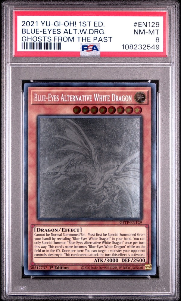 Welcome! Blue-Eyes Alternative White Dragon GFTP-EN129 - 1st Edition GHOST RARE PSA 8 Will receive the card as shown in the picture Please take a look at our store. We have lots of trading cards and collectibles, and we list new items for sale every day Payment: Checkout must be completed within 3 days of the purchase Shipping: Tracking number included with every order We offer combined shipping Items mailed daily - Monday through Friday. No shipments going out on weekends. The item(s) ship(s) within 1 day after payment is received Once shipped, the item(s) is/are in USPS hands. We are not responsible for any lost mail or any damages caused by the shipping provider. If you believe your package has been lost, please contact your local post office, they will be able to assist you *Buyers - Please make sure your shipping address is correct. If the item is returned back to us due to insufficient address, you will be charged the appropriate shipping fee for a second attempt* Returns: No returns - you will get exactly what's listed for sale. GUARANTEE: · 100% Satisfaction Guarantee · If for some reason you are not satisfied, please contact us before leaving feedback and we guarantee we'll make it right for you. · Our goal is to make you, as a buyer, happy and satisfied with your purchase YOUR SATISFACTION IS OUR MAIN GOAL If any issues please feel free to contact us THANK YOU for visiting us and please check out our store YOU ARE ALWAYS WELCOMED!!!