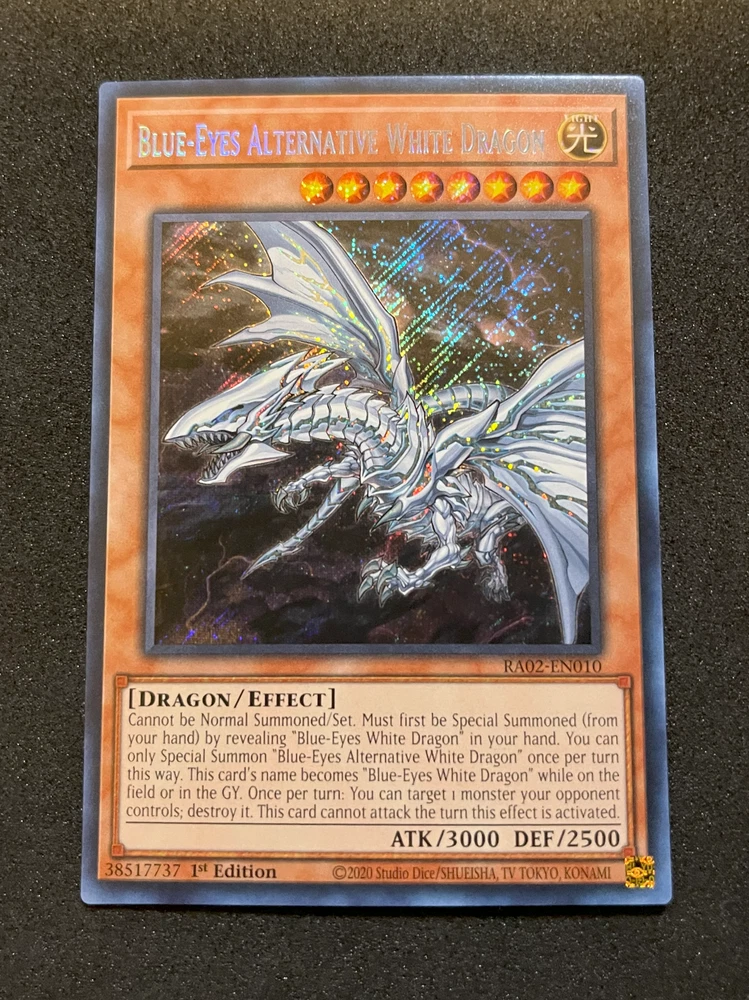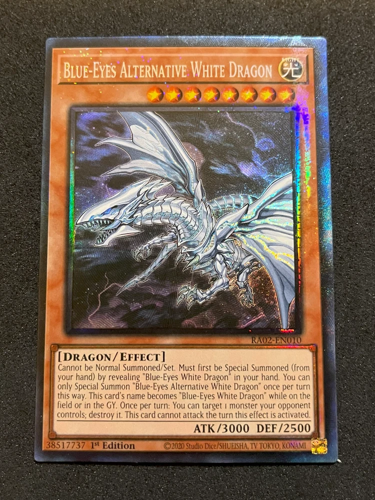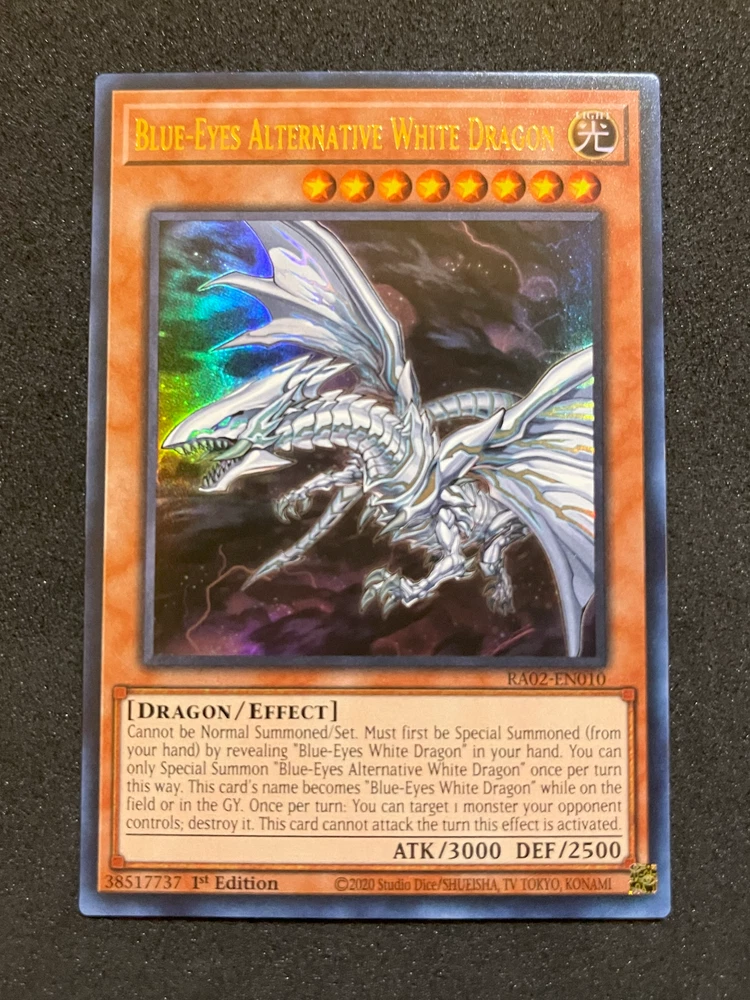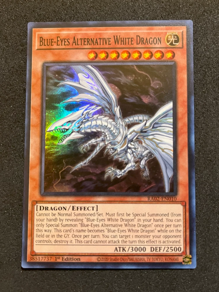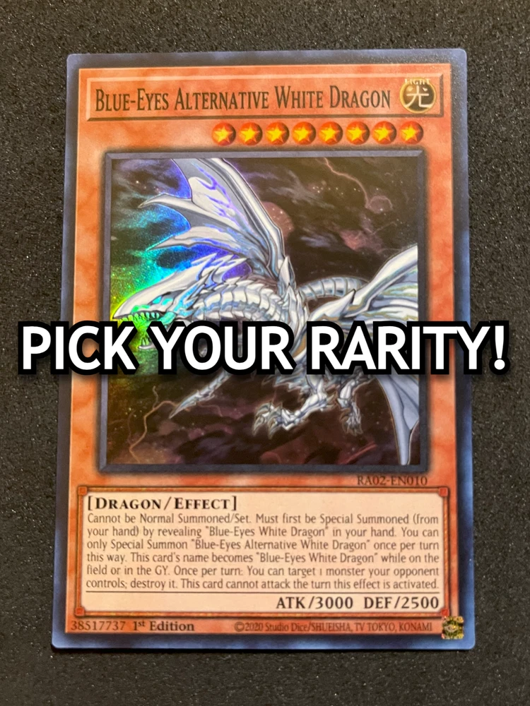 This listing is for Blue-Eyes Alternative White Dragon - RA02-EN010 from the 25th Anniversary Rarity Collection II set . Each photo in this listing is a stock photo as this is a bulk variation listing. You will receive the same card in the same condition selected , but it may not be the exact copy from the photo . Each card will be in Near Mint condition. Cards in this listing may have some very minor imperfections (such as few small dots of whitening or a couple of very small scratches), but there will be no major damage to the cards (such as excessive whitening, scratches, edgewear, creases, water damage, etc). The cards from your order will be securely packaged in a card saver and card saver perfect fit sleeve and shipped with the eBay Standard Envelope program for cards under $20. Whether you're looking to power up your deck or add this to your collection, you'll be sure to enjoy this card! Check out our other listings for more Yu-Gi-Oh! cards!
