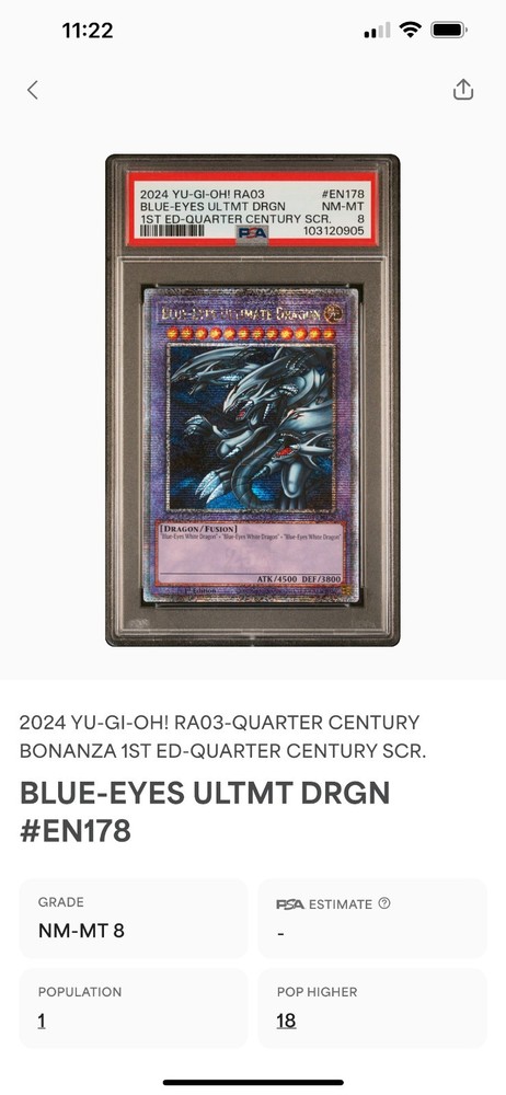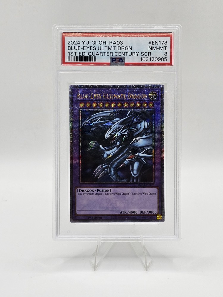 This a 1 of 1 psa 8. so far it's the only psa 8 in the system see picture above Unleash the power of Legend with the Blue-Eyes Ultimate Dragon from the Quarter Century Bonanza set. As a fusion card with the attributes of Light, this dragon-themed monster is a must-have for collectors and duelists alike. Its impressive 3800 defense and 4500 attack make it a formidable force in the Yu-Gi-Oh! TCG arena, while its rarity as a Quarter Century Secret Rare adds unparalleled value to your collection. Card number RA03-EN178, the Blue-Eyes Ultimate Dragon is an English-language, 1st Edition card produced by Konami. Featuring the card type Fusion and creature/monster type Dragon, this ultimate stage card is a standout addition to any deck or display. Don't miss the opportunity to own a piece of Yu-Gi-Oh! history with this iconic card.