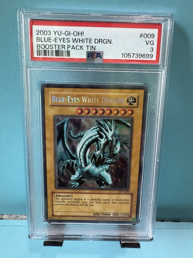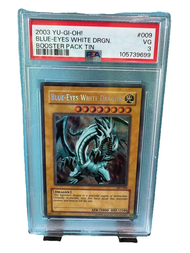 Unleash the power of Seto Kaiba's Blue-Eyes White Dragon with this Secret Ultra Rare card from the 2003 Booster Pack Tin. A must-have for collectors and duelists alike, the card boasts an attack power of 3000 and a defense strength of 2500, ready to dominate any deck. Featuring the iconic holographic finish, this card is a true testament to the artistry and excitement of the Yu-Gi-Oh! TCG. The Blue-Eyes White Dragon card, numbered BPT-009, comes in English and is suitable for ages 6 and up. Manufactured in the United States by Konami, this card is a piece of Yu-Gi-Oh! history, graded by the Professional Sports Authenticator (PSA) to ensure its quality and authenticity. Enhance your collection or your strategy with this legendary creature from the 2003 set.