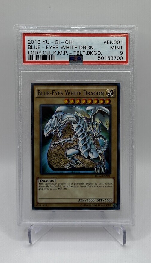 This 2018 Yu-Gi-Oh! Blue-Eyes White Dragon (Verison 4) from the Legendary Decks II is a highly sought-after card in the world of collectible card games. This card is a must-have for any fan of the game. The card features the character Blue-Eyes White Dragon, a powerful dragon creature with 3000 attack power and 2500 defense toughness. This PSA 9 MT EN001 card has been professionally graded and comes with a certification number of 50153700, but is an ERROR in grading. The card is graded as an EN001 but the card itself is an LDK2-ENK01. PSA has the card at a pop of 4 but I believe with its error, it is likely a pop of 1! It is perfect for collectors and players alike, and is sure to be a valuable addition to any collection. Don't miss out on the chance to own this incredible card from the world of Yu-Gi-Oh!
