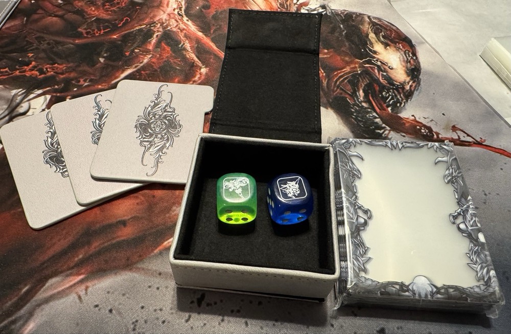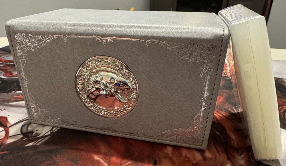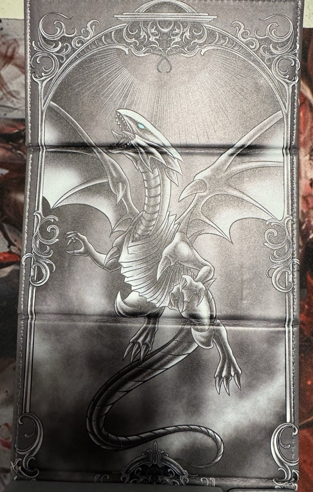 Blue-Eyes White Dragon Deck comes with 15 card extra Deck, 3 sets of Card Sleeves, 2 dice, 3 Dividers, Metal Field Center and a Custom Blue-Eyes Deck Box with Silver Emblem.