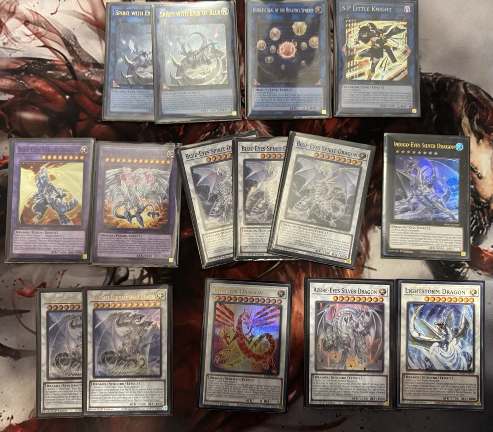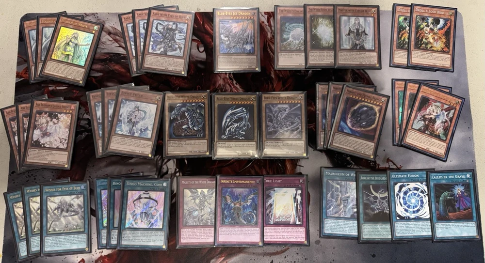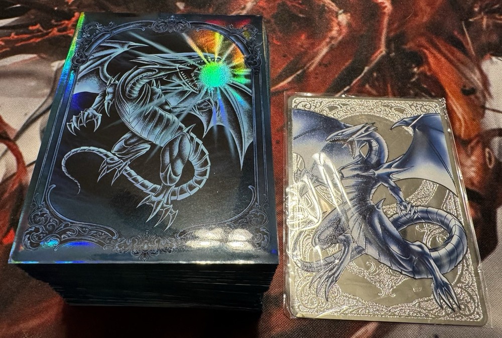 Blue-Eyes White Dragon Deck comes with 15 card extra Deck, 3 sets of Card Sleeves, 2 dice, 3 Dividers, Metal Field Center and a Custom Blue-Eyes Deck Box with Silver Emblem....