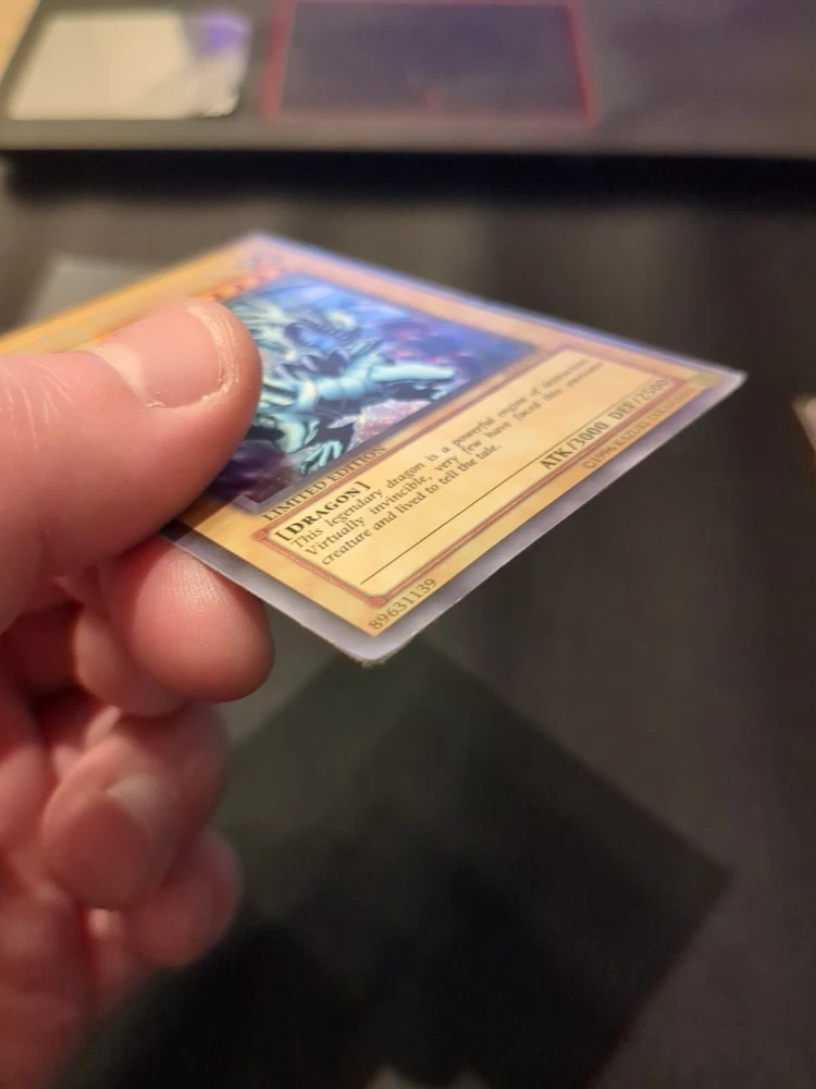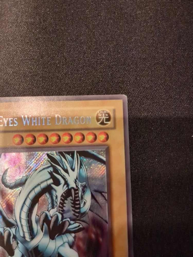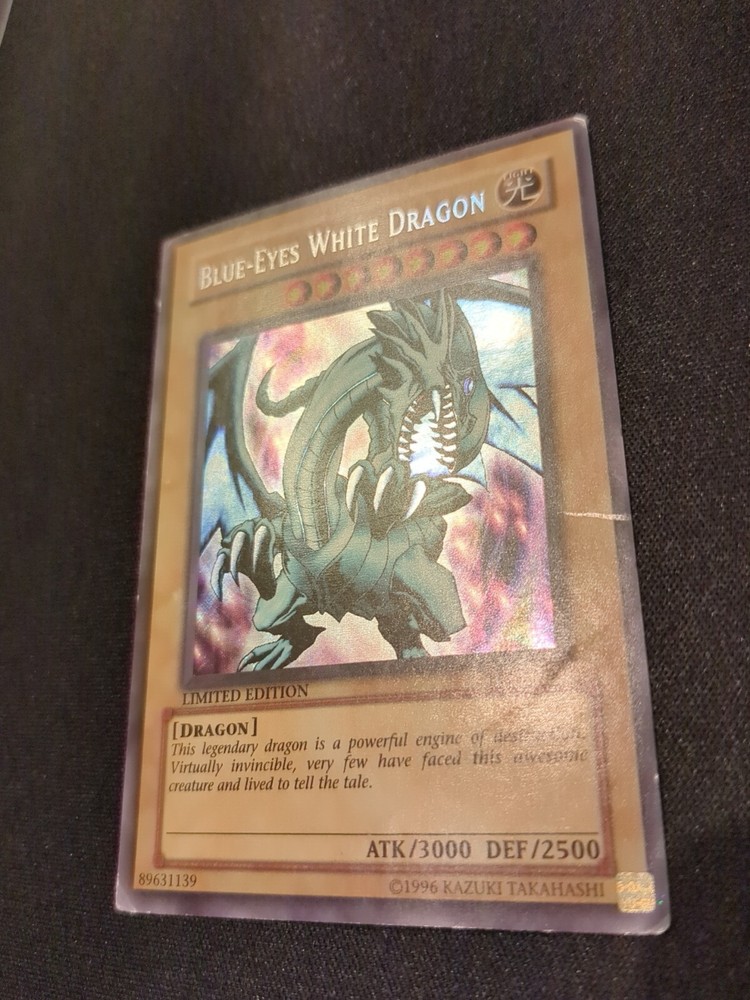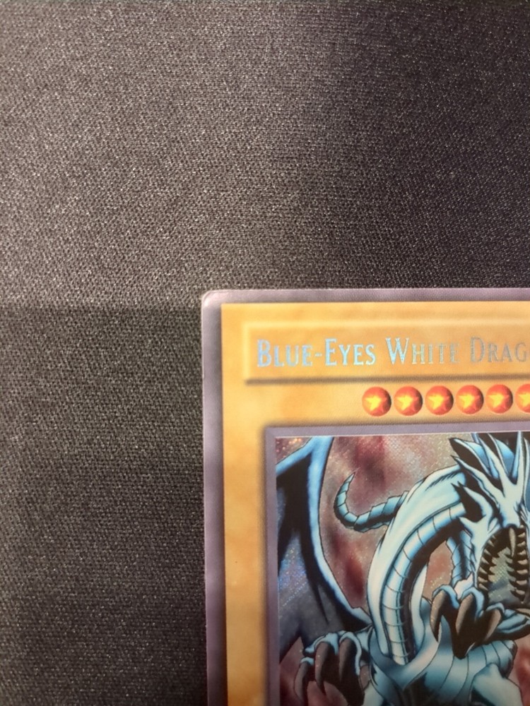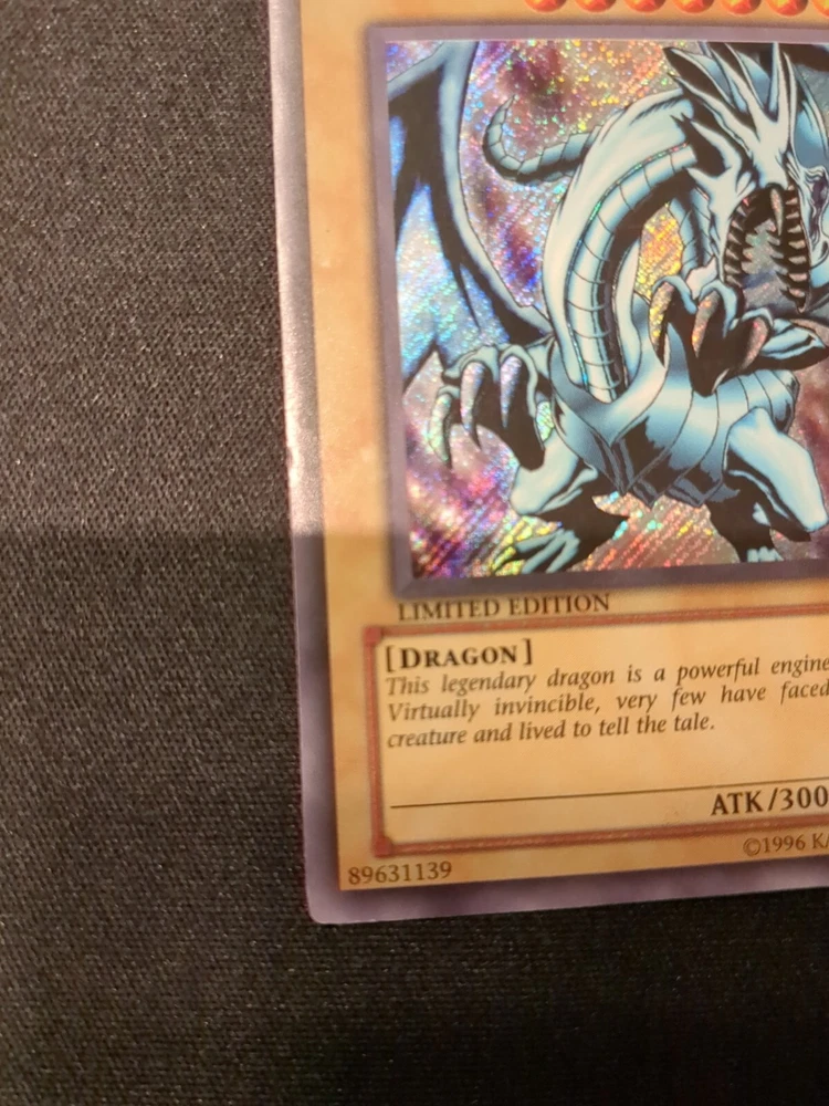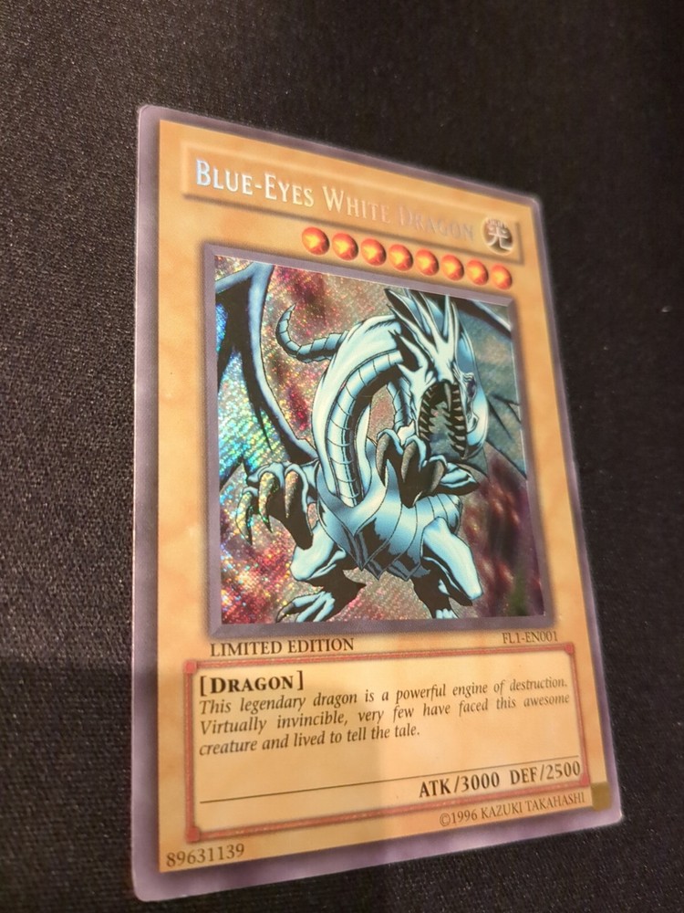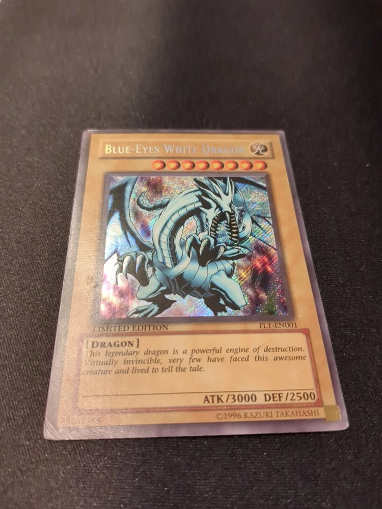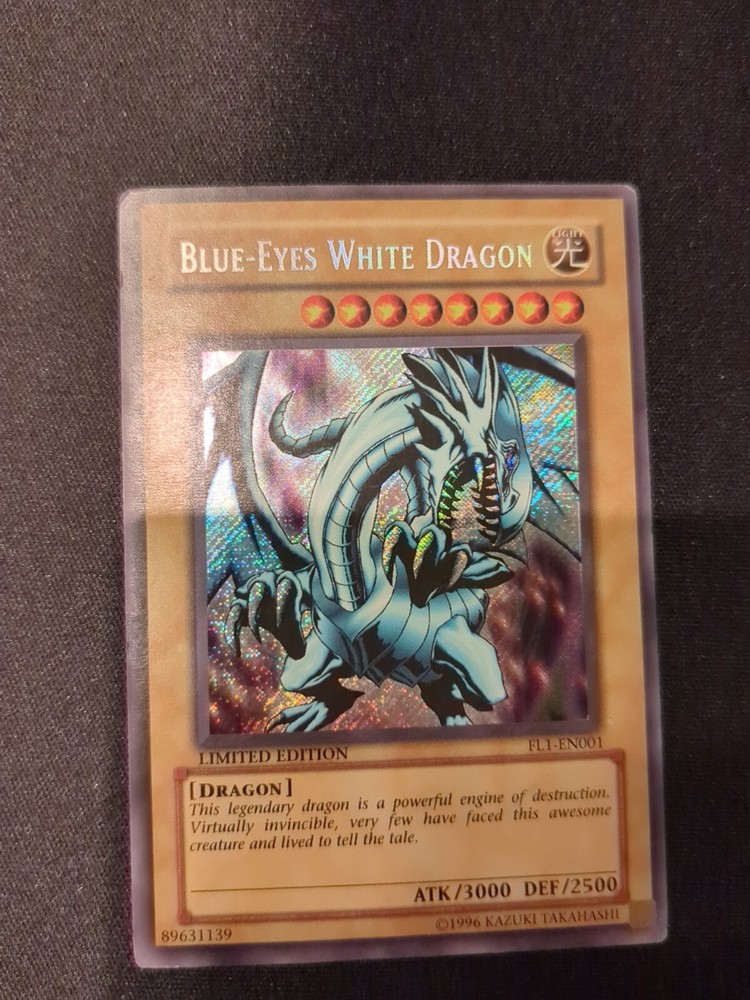 This limited edition Blue-Eyes White Dragon card from the Forbidden Legacy set is a must-have for any serious Yu-Gi-Oh! TCG collector. With an attack power of 3000 and a defense/toughness of 2500, this Secret Rare card is sure to be a valuable addition to your collection. The card features a stunning blue-eyed white dragon and is in English language. Manufactured by Konami, this card has a card number of FL1-EN001 and is perfect for those who love collectible card games. The card is categorized under Toys & Hobbies and Collectible Card Games, Individual Cards. Get your hands on this rare and valuable card today! Creases and whitening on corners.