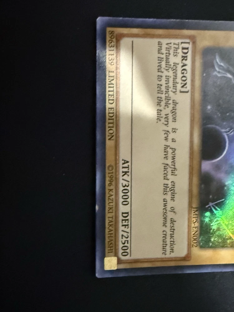 This Blue-Eyes White Dragon card is in fantastic shape—crisp edges, no scratches, and perfect centering. Pulled straight from a sealed ziplock after years of safe storage, it looks brand new. A must-have for collectors or duelists who want a pristine classic!